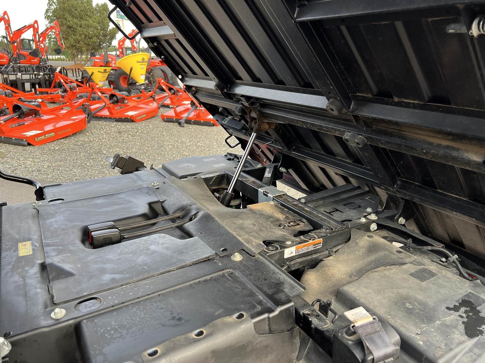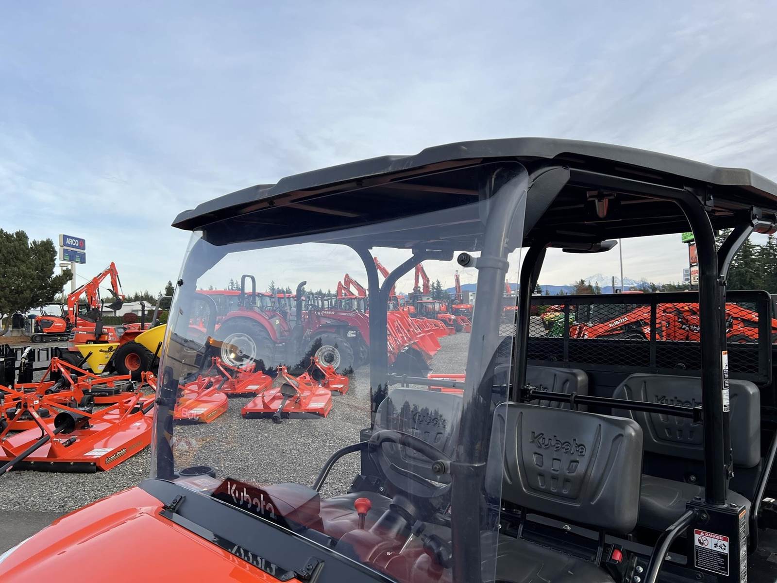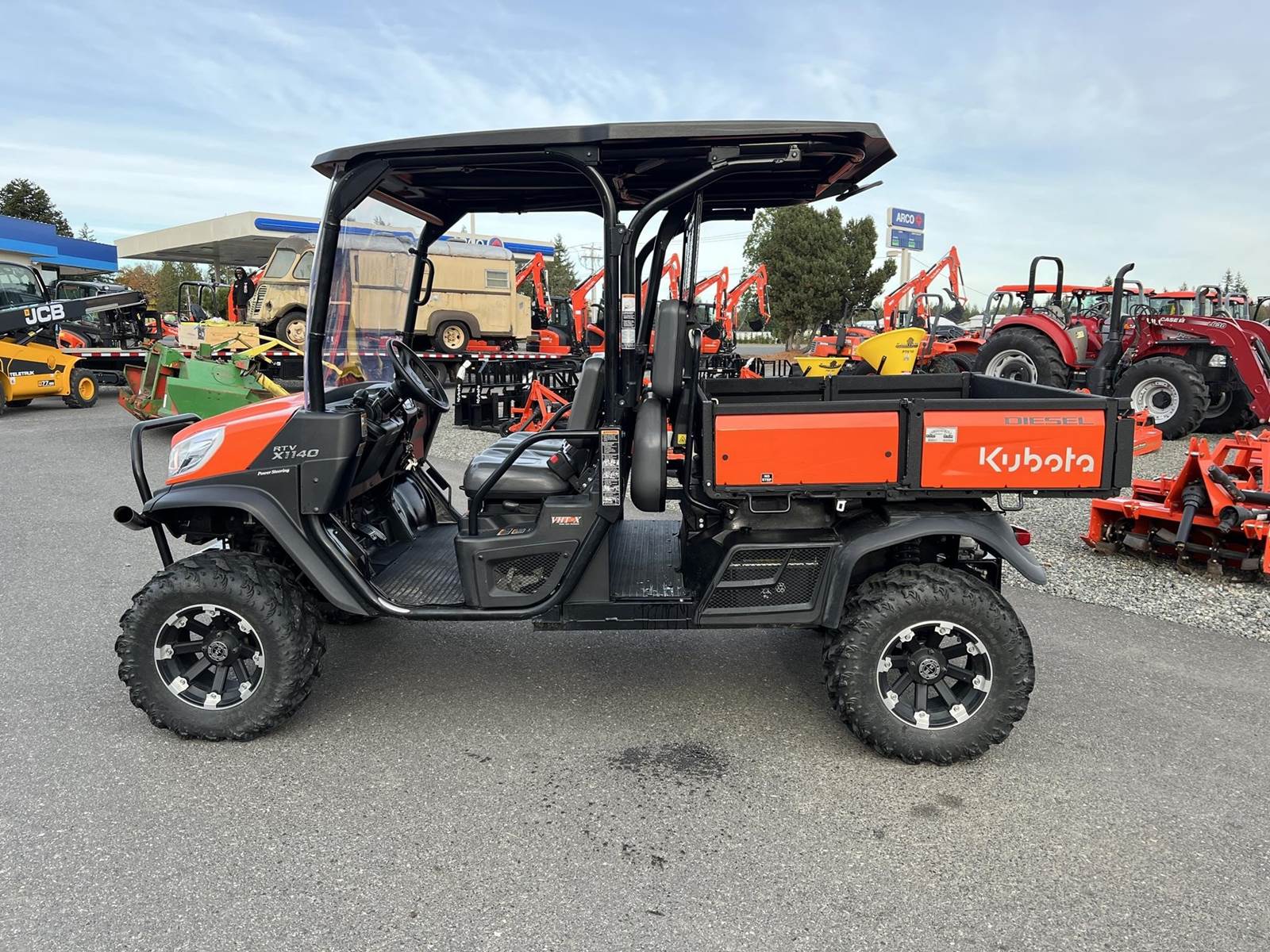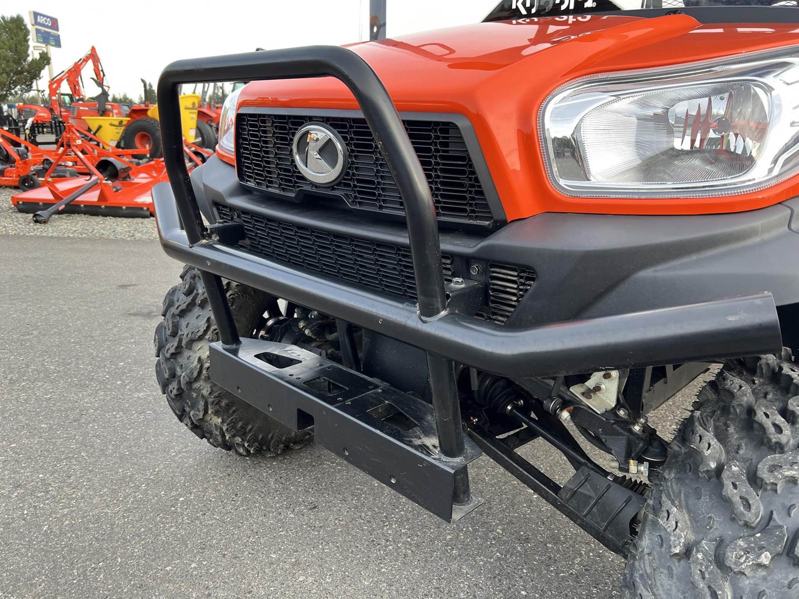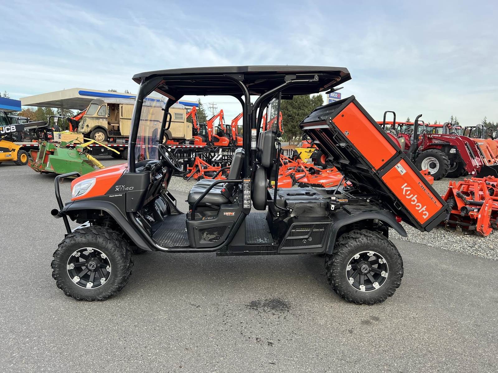 2023 KUBOTA RTV-X1140W Utility Vehicle - Kubota diesel engine, flip up the rear seat and fold down the industry-leading cargo bed, hydraulic tilt bed, front and rear independent suspension, power steering, digital meter cluster, variable hydro transmission, grill guard, glass windshield and roof—Worksite orange. Has a two inch lift with 27X11.00R14 off-road tires.