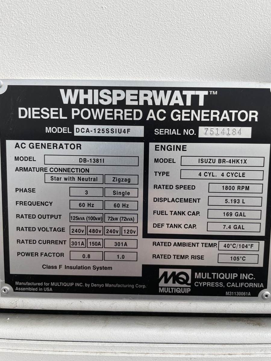 100KW PRIME/110KW STANDBY,, MULTIQUIP DCA125SSIU4F W/ISUZU, BR-4HK1X, SOUND ATTENUATED FUEL, CELL, MQ CONTROL PANEL, HITCH, COUPLER, 35KW...