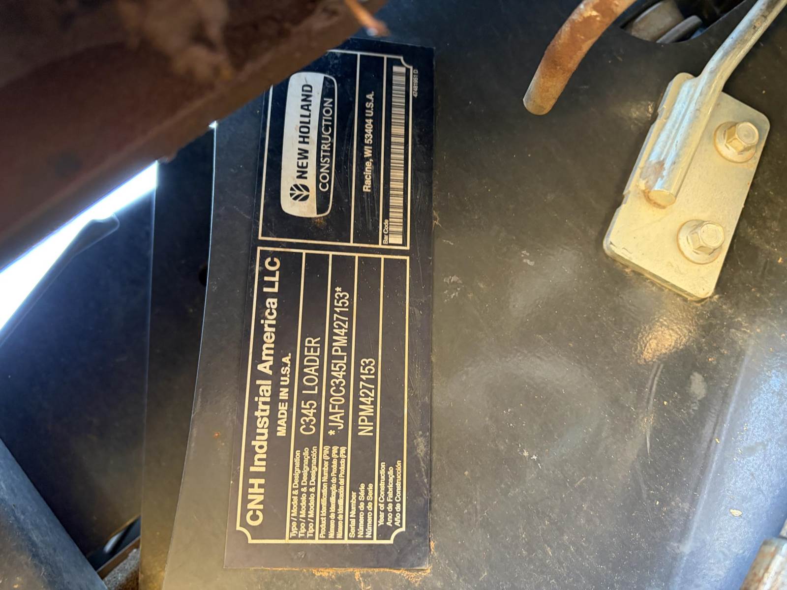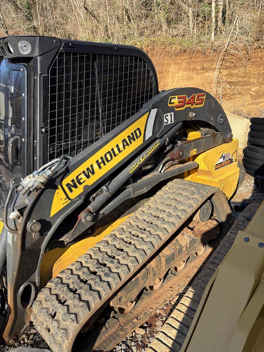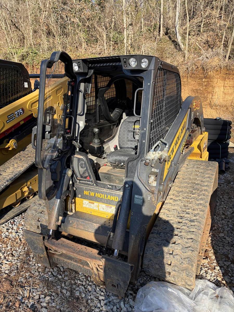 2023 New Holland C345 Track Skid Steer with bucket, 1400 hours, 90HP, 10600lb operating weight, The New Holland C345 Compact Track Loader is a 300 Series vertical lift machine featuring a 90 HP FPT engine, 4,500 lb rated operating capacity (50% tipping), and ~10,600 lb operating weight. Known for its Super Boom design, it provides superior reach and dump height (over 100 inches) for loading trucks. Key features include 40 GPM high-flow hydraulics, a 7-8 inch display, and a pressurized cab.