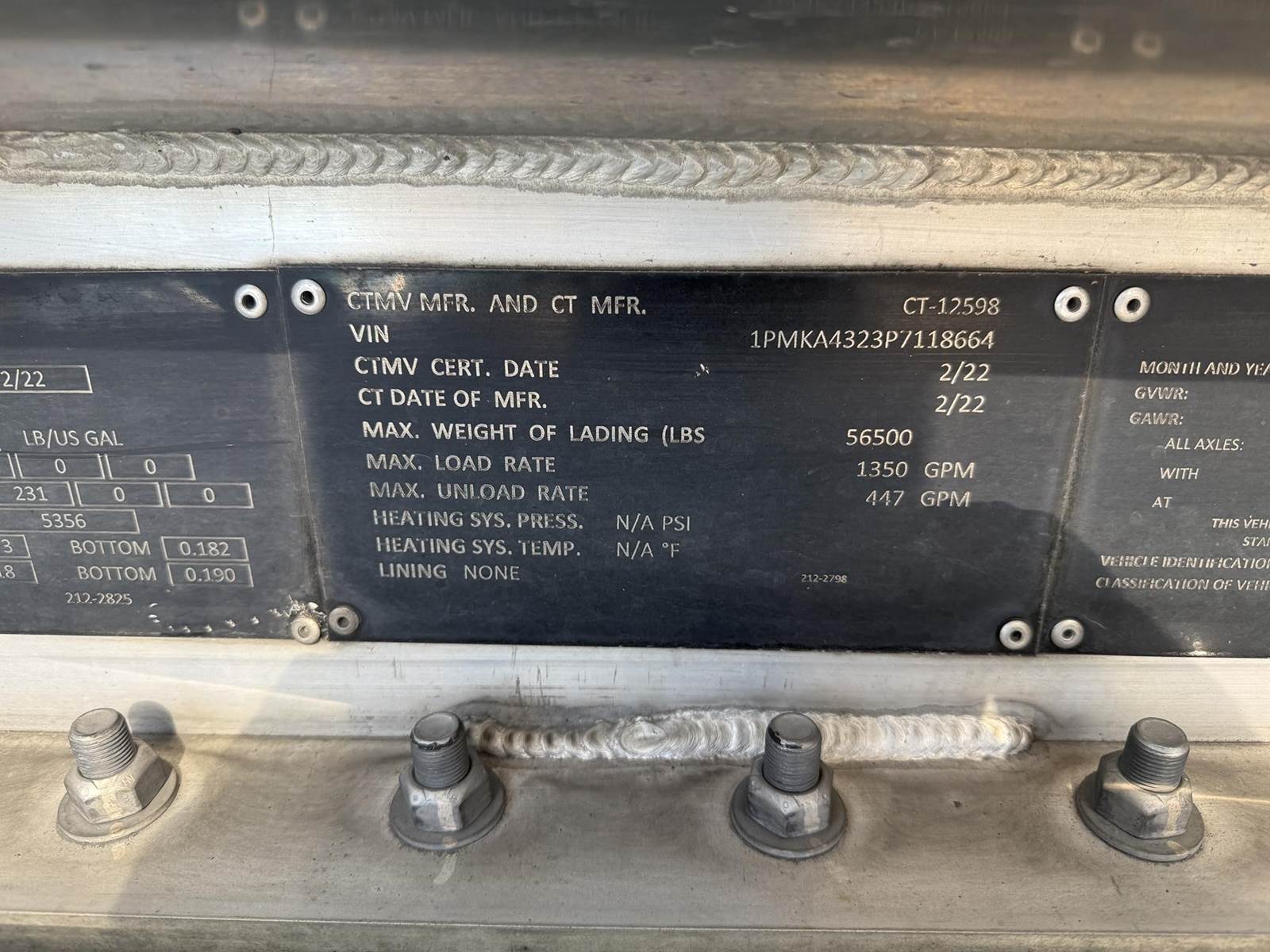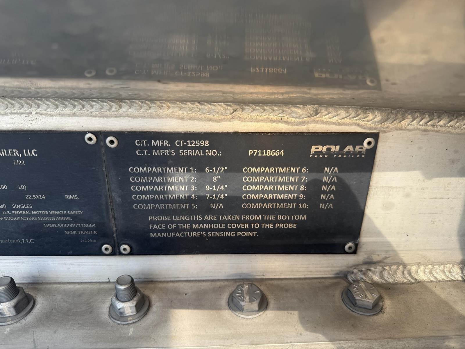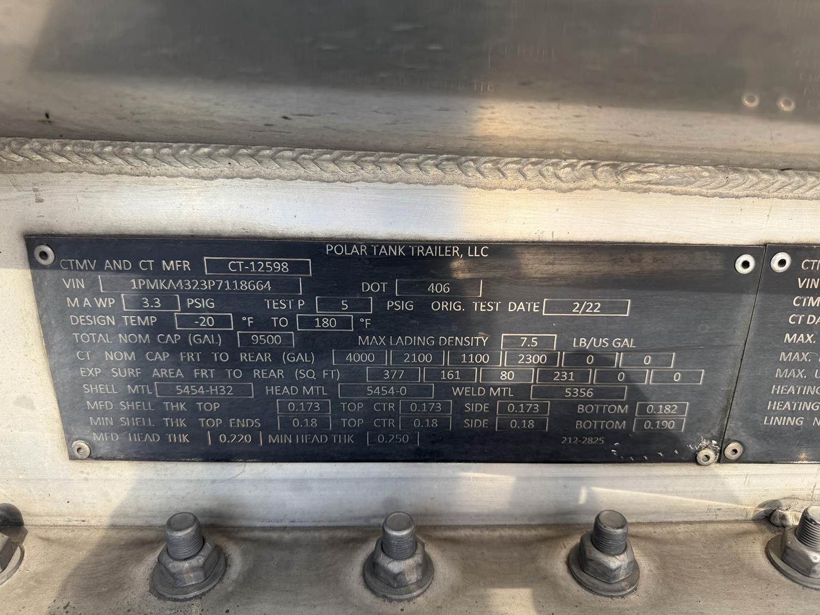 (Mfg. 2/22), Serial# P718664, DOT406AL, Double Conical Design, 9500 Gallons, 4-Compartment (4000,2100,1100,2300), All Double Bulkheads, Air Operated Internals, 4" API 'Y' Bottom Load Heads w/ Brake Interlock & Sight Glasses, Roto Tags, Work Light @ Load Heads, 3" Forward Pump Line w/ Manifold, Vapor Recoveries w/ Brake Interlock, Optic Sockets, Air Ride Suspension, 445/50R22.5 Super Single Tires on All Aluminum Wheels, Cam Style Brakes, Jost Crank Style Landing Gear, Aluminum Fenders, (4) R/H Stacked Hose Tubes, R/H Aluminum Fitting Box, R/H Aluminum Cone & Bucket Holder, Aluminum Front Ladder......