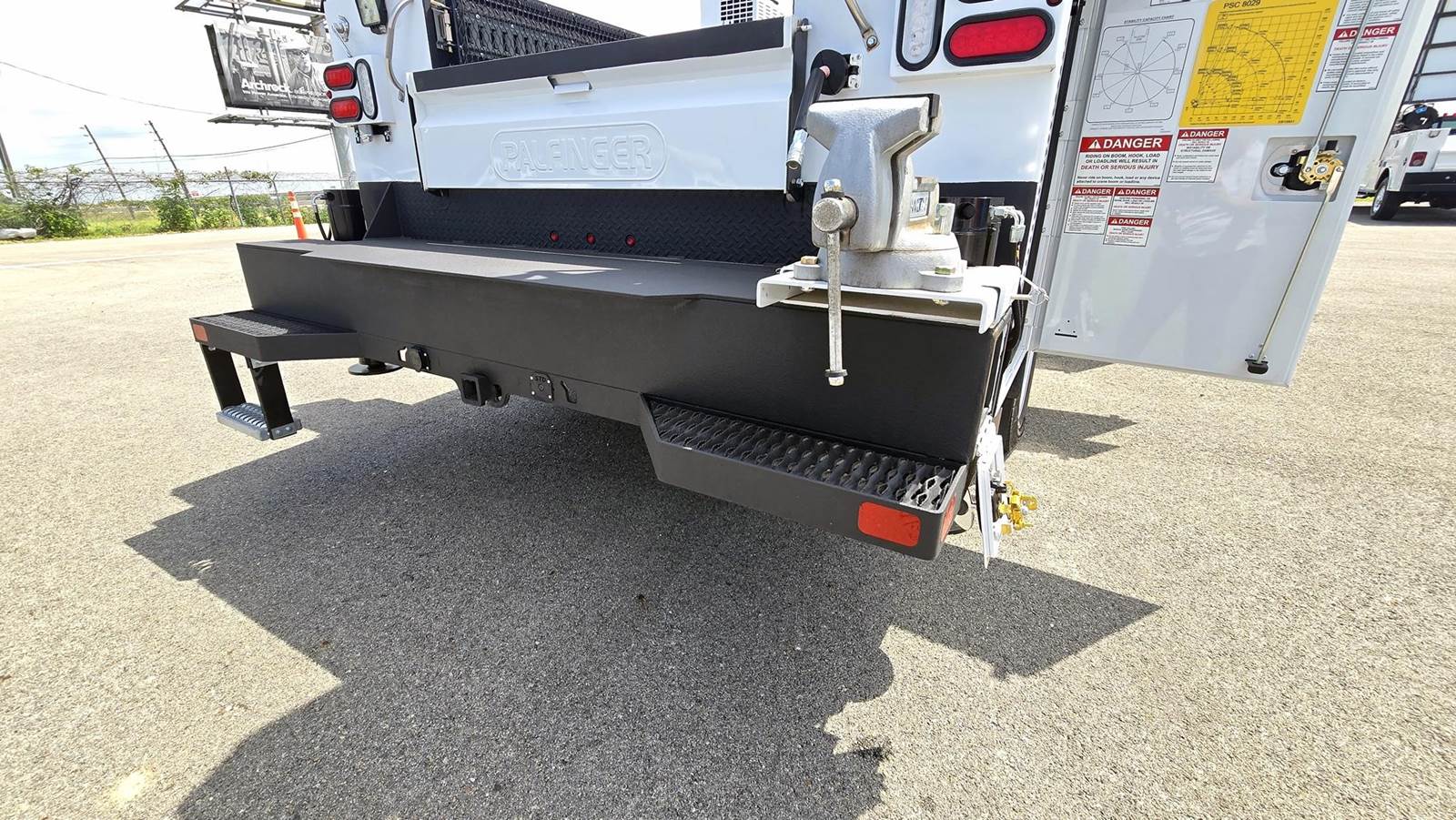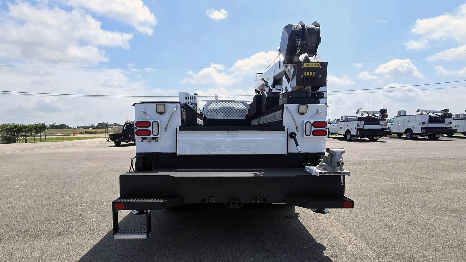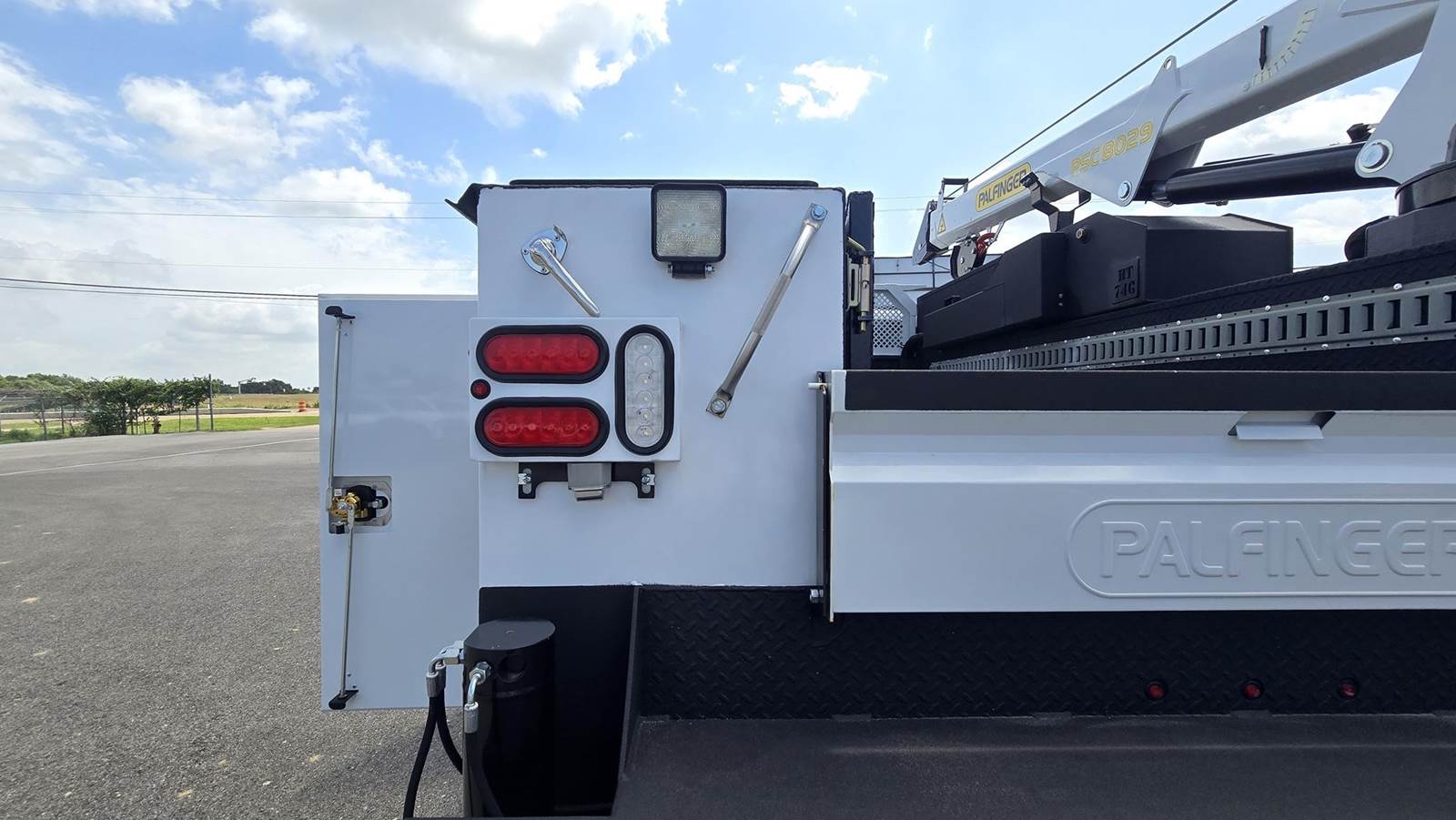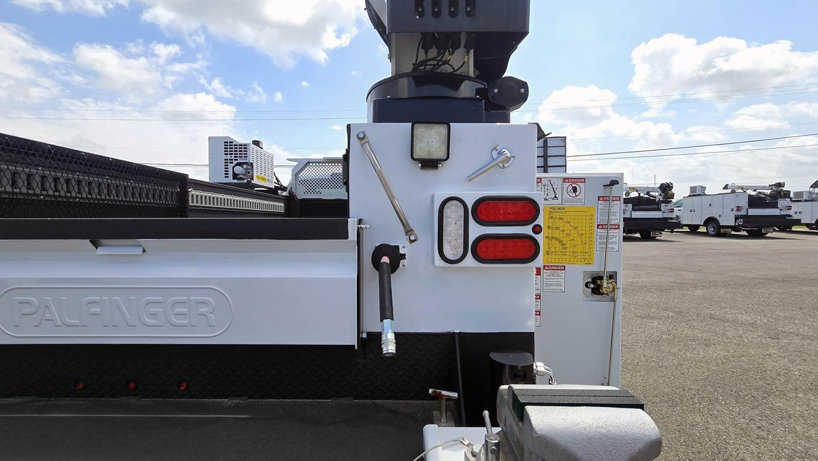 • Palfinger Model PSC 8029 telescopic mechanic field service crane; 43,000 ft./lbs. rating, 400 degree rotation, 29’ hydraulic reach capability, 8,000 Lb. vertical lift capacity, -10 to +80 degree boom elevation, double acting cylinders with integrated load holding valves on all cylinders, four-spool remote control valve, overload shutdown system, hydraulic planetary drive winch with spring loaded roller, end layering limit switch and integral two-block damage prevention system, wireless radio remote controller pistol grip and toggle controller with 36' pendant, decals, crane hook, load line block, white and black finish paint and crane mounting bolt kit.