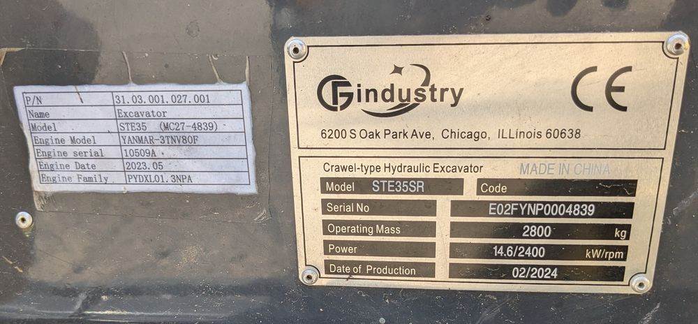 2024 CFG Industry Hydraulic Mini Excavator; Operates as Intended, Model STE35SR, 125.3 hours