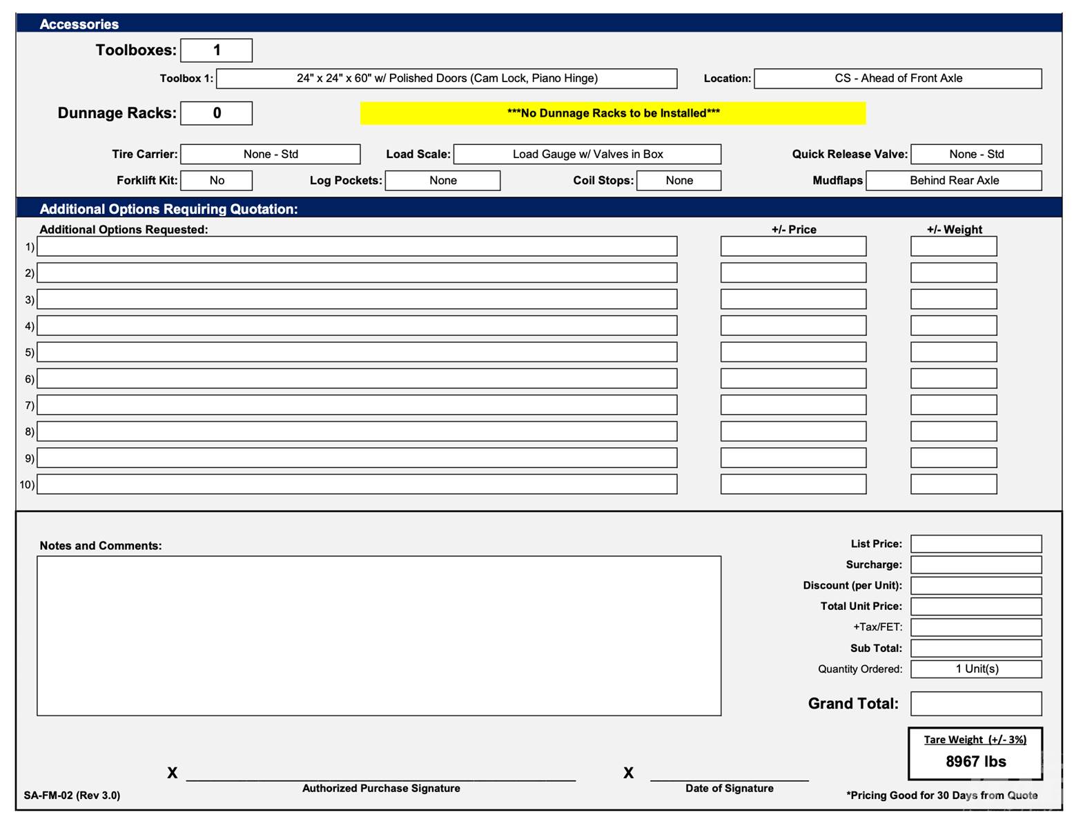 8,967 lbs Tare Weight (+/- 3%) - shown on build sheet on Pictures 13-14