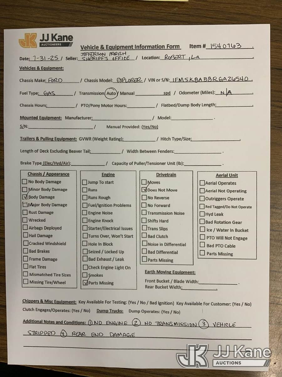 2024 Ford Explorer AWD Police Interceptor 4-Door Sport Utility Vehicle, True Mileage Unknown (Not Running, Condition Unknown, Vehicle Is Stripped Of Parts, No Engine Or No Transmission, Body Damage) This is a Titled Item NOTE: This unit is being sold AS IS/WHERE IS via Timed Auction and is located in Robert, LA. For more information & removal arrangements please contact Todd Hales @ 659-278-7786. License # LA AB-154 (Buyer is responsible for removal. Assistance by consignor or JJ Kane Auctioneers is not assured.)
