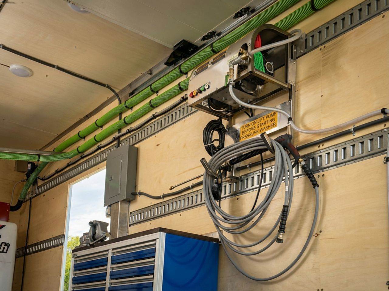 The Freightliner M2106 4x2 20' Marion Van Body Bore Truck is a reliable and well-equipped solution for your operations. Powered by a 350 HP Cummins L9 engine and an Allison 3000RDS automatic transmission, it delivers dependable performance. Its 12,000 lb front and 21,000 lb rear axles provide a solid foundation for heavy-duty work. The truck features two 500-gallon Ditch Witch mixing tanks, a Thermo King T590 heater/air conditioner, a 3 HP wall-mount pressure washer, and a Cummins/Onan QD 10,000-watt generator/inverter. The aluminum dry van body, with a 102" outside width, is both insulated and aerodynamic, making it an efficient and durable mobile workspace.