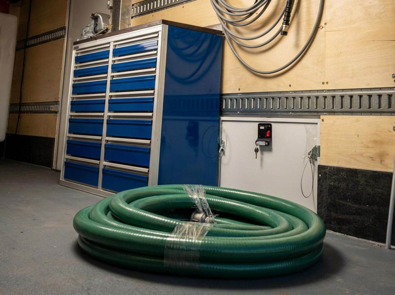 The Freightliner M2106 4x2 20' Marion Van Body Bore Truck is a reliable and well-equipped solution for your operations. Powered by a 350 HP Cummins L9 engine and an Allison 3000RDS automatic transmission, it delivers dependable performance. Its 12,000 lb front and 21,000 lb rear axles provide a solid foundation for heavy-duty work. The truck features two 500-gallon Ditch Witch mixing tanks, a Thermo King T590 heater/air conditioner, a 3 HP wall-mount pressure washer, and a Cummins/Onan QD 10,000-watt generator/inverter. The aluminum dry van body, with a 102" outside width, is both insulated and aerodynamic, making it an efficient and durable mobile workspace.