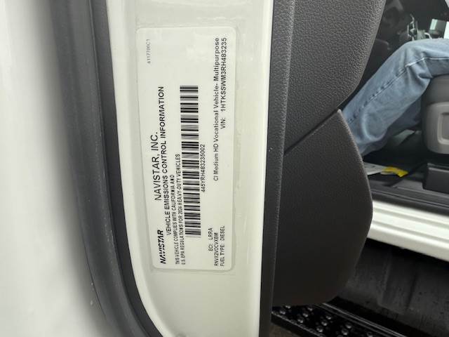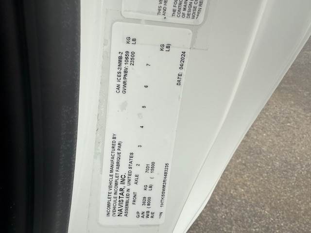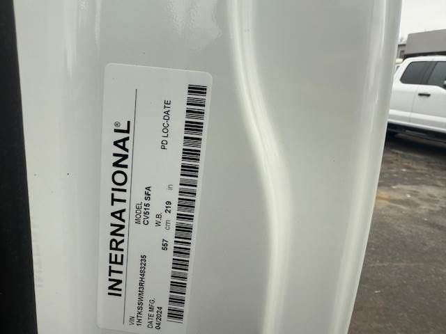 2024 International CV Cab & Chassis Stock: 483235 VIN: 1HTKSSWM3RH483235 Year: 2024 Make: International Model: CV Engine: V8, International 6.6L Mileage: 258 Horsepower: 350HP Fuel type: Diesel Transmission: Automatic Transmission Allision RDS Color: White Class: 6 GVWR: 23500lbs Category: Cab & Chassis Cab Type: Regular Wheelbase: 219in Rr Axle: 15500lbs Fr Axle: 8000lbs Brake Type: Hydraulic Front Tires: 255/70R19.5 Rear tires: 255/70R19.5 Features: -Air Ride Suspension