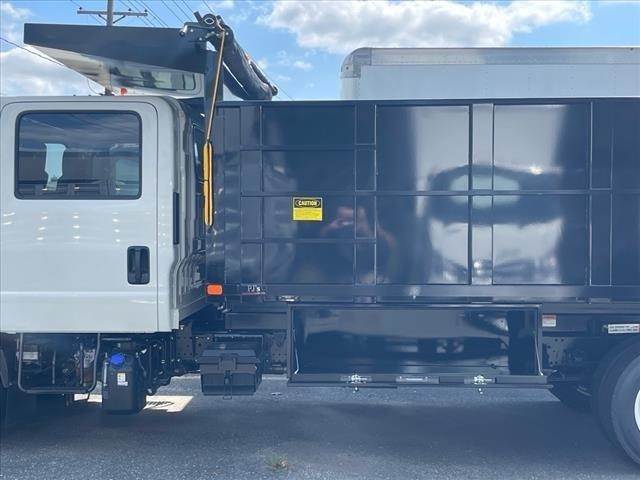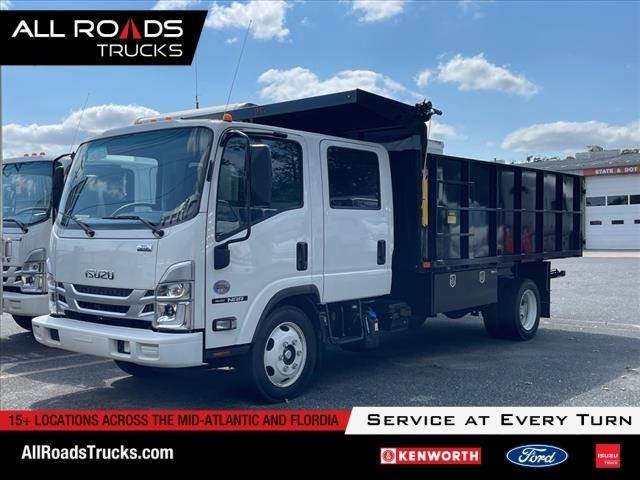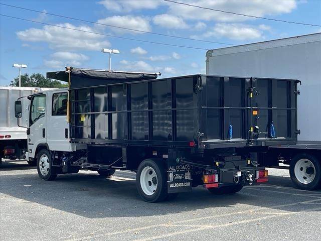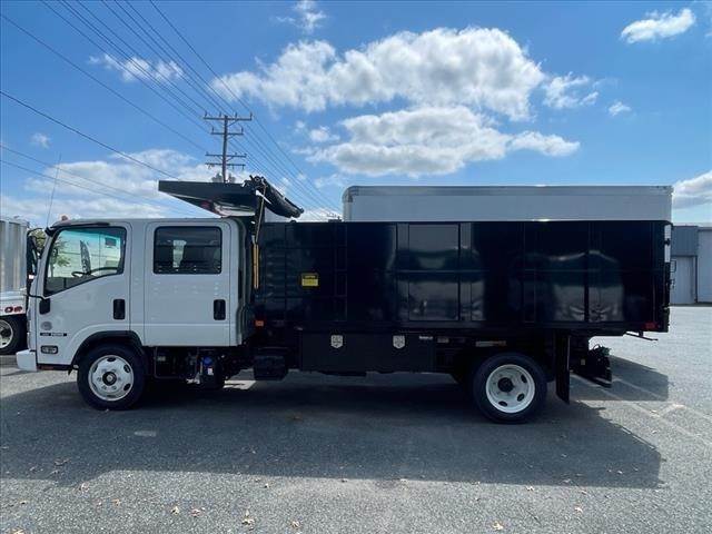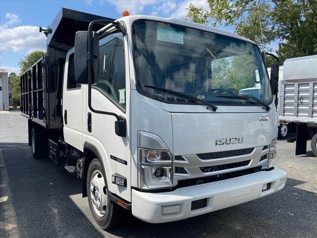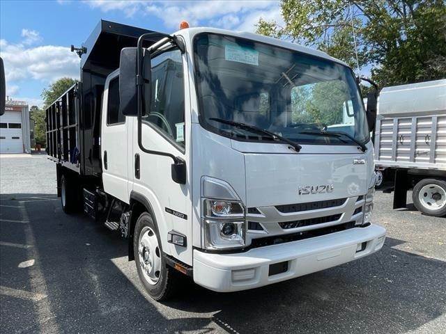 IN304346 New 2024 Isuzu NRR crew cab 14ft Landscape dump, 19,500 lbs. GVWR, 5.57 rear axle ratio, 4HK1-TC 215 hp engine, Wabco exhaust brake, Aisin A465ID 6-speed automatic transmission, front tire 225/70R19.5, rear tire 225/70R19.5, 30-gallon stainless steel in-rail fuel tank, three-person bench seating, AM/FM/CD/Bluetooth radio, power windows and locks, air conditioning, hydraulic brakes, 4-wheel disc brakes with ABS,