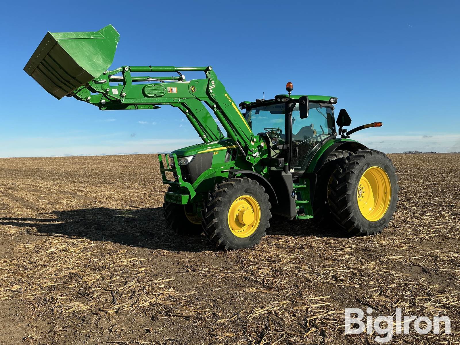 2024 John Deere 6R 145 MFWD w/640R Loader, 234.4 hrs showing, 144 hp, 6.8 liter diesel engine, 20 speed auto quad plus transmission, engine block heater, 640R quick attach self-leveling loader w/3rd function hydraulic block, 8' material bucket, 3 hyd remotes, front suspension, 1000/540 PTO, 110kg starter front weight bracket, rear fender 3 point and PTO controls, cab skylight, extendable 3 point arms, drawbar hammerstrap, see photos of activations, 420/85R28 front tires, 480/80R42 rear tires and duals, Warranty as follows: Basic until Nov 3 2026, Emmisions until Nov 3, 2029, Extended powertrain train until Nov 2, 2028 (see picture of extended warranty card), SN: 1L06145RARK440215