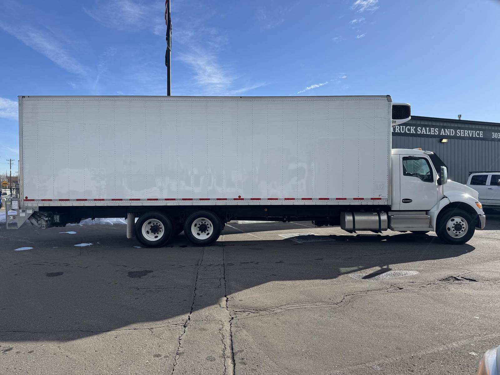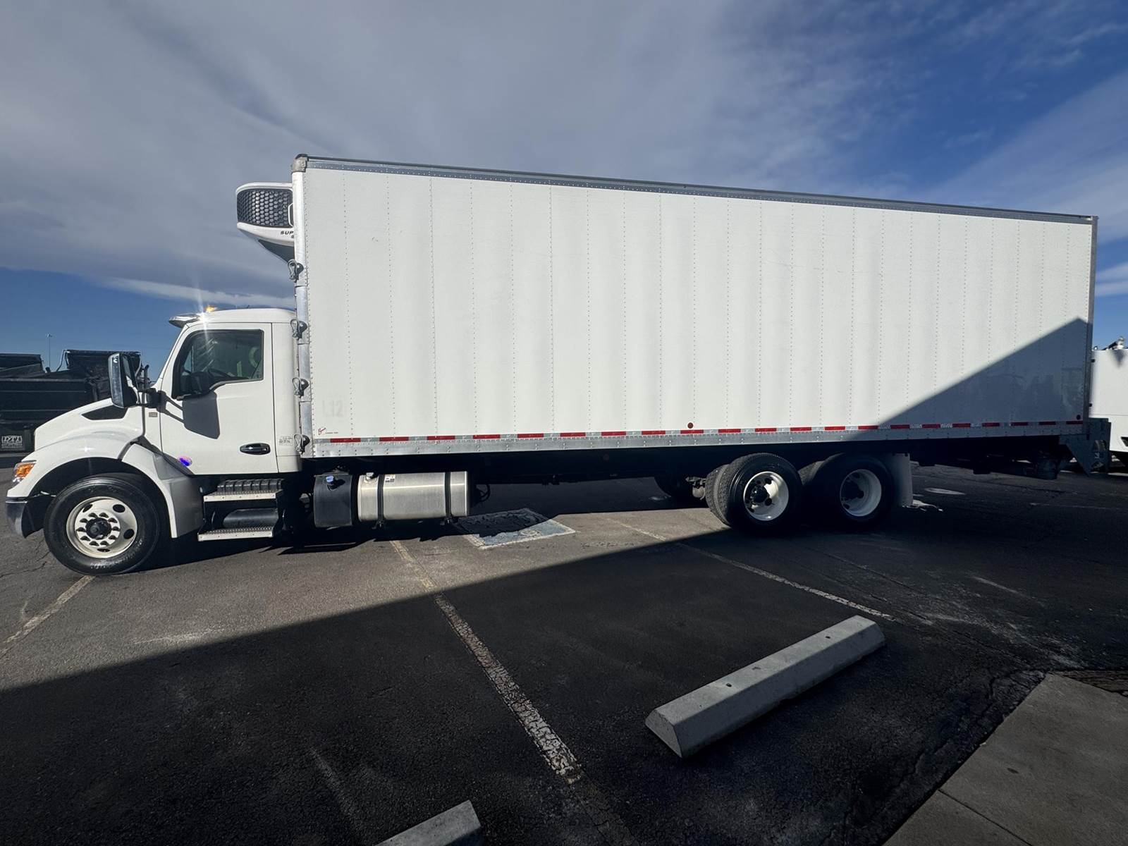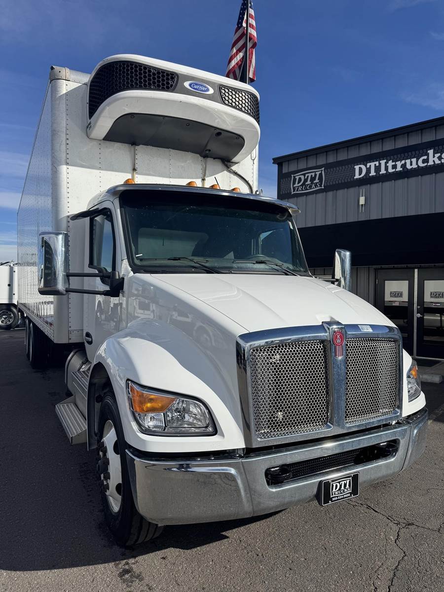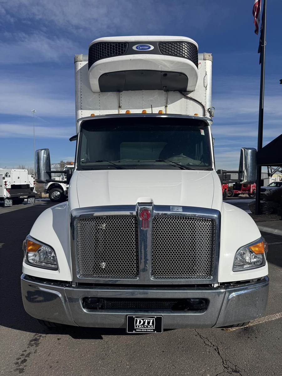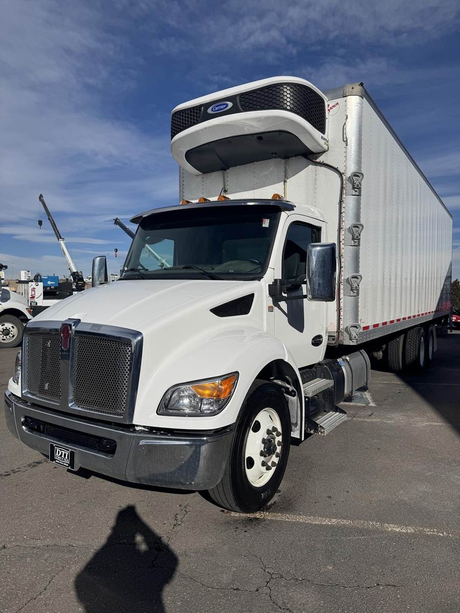 2024 Kenworth T480 Tandem Axle 32’ Reefer / Box Truck, 8.9L Paccar PX-9 Diesel Engine, 330 HP, Engine Brake, Allison 5 Speed Automatic Transmission, ONLY 34,136 ECM Verified Miles & 1,138 ECM Verified Engine Hours, 52K GVWR (12K Steer Axle, 40K Combined Drive Axles), Diff Lock, Axle Lock, 300” Wheel Base, 232” CTA, Air Ride Suspension With Dump Valve, 295/75R22.5 Tires All Mounted On Steel Wheels, 70 Gallon Aluminum Diesel Fuel Tank, CARB Compliant, Air Brakes, Air Conditioning, Tilt & Telescoping Steering Wheel, Cruise Control, Bluetooth Radio, Power Windows & Locks, Power & Heated Mirrors, Air Ride Driver Seat, Bench Passenger Seat, Brown 32’ Dry Van Body, 102” Wide, 109” Interior Height, Rear Roll-Up Door, 103.5” Door Opening Height, (3) Rows Of E-Tracking, Carrier Supra S10 Reefer Unit With Only 411 Hours (Spec Sheet Available Upon Request), Maxon 3,300 LB Aluminum Tuck Under Lift Gate, 85.5” W X 69”L Platform. This Low Mileage Kenworth Tandem Axle 32’ Reefer Truck Is Available At DTI Trucks In Denver, CO. Stock #18001D. Call Or Text Brent For More Information (303) > 598 > 1923