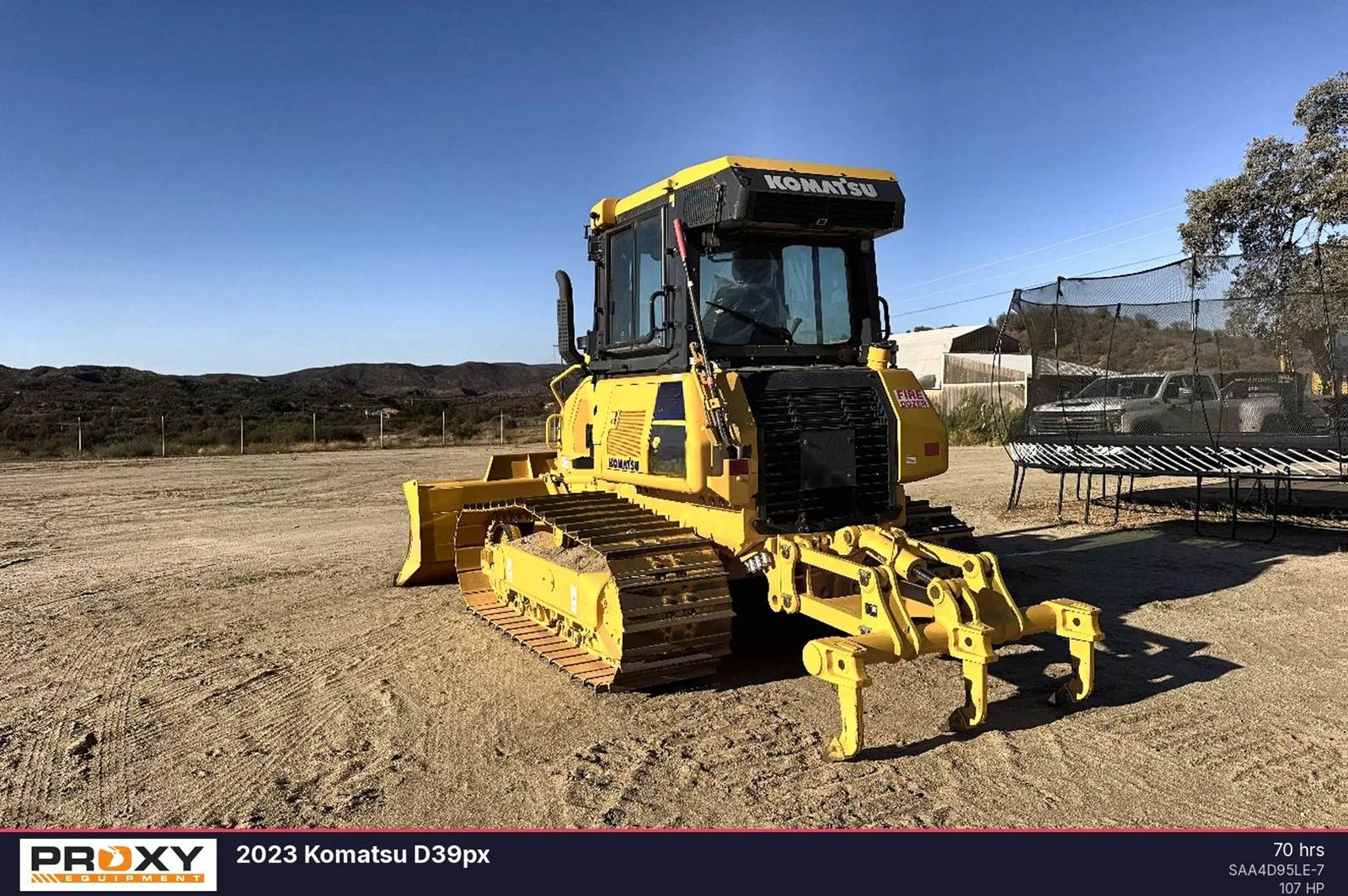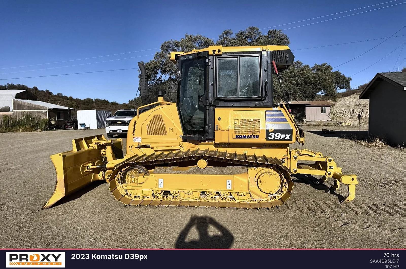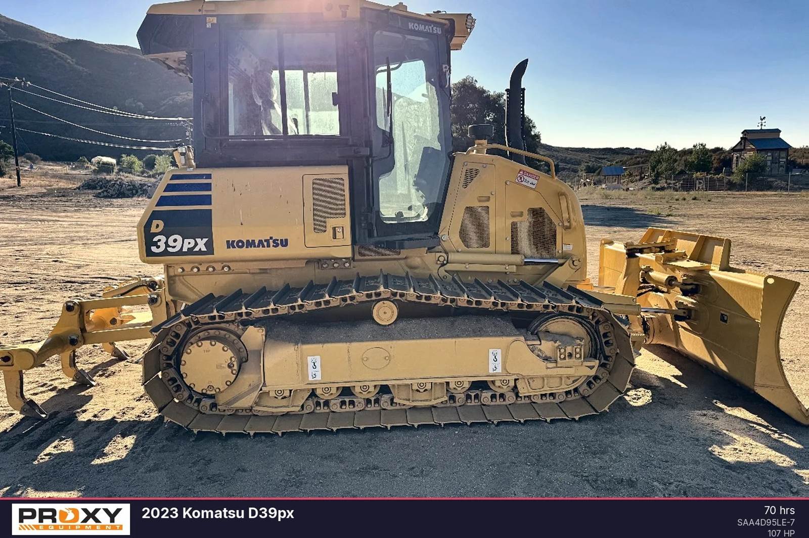 2024 Komatsu D39PX-24 Crawler Dozer, with only 70 hours. An extended warranty included 2 year Factory and Service. This crawler dozer delivers 107 horsepower and operates at a weight of 22,817 pounds, making it a capable machine for precision grading and site preparation. Includes 3-shank ripper The unit features a super-slant nose design for clear blade visibility and a hydrostatic transmission for maneuverability. It is equipped with the Parallel Link Undercarriage System for increased wear life, a Tier 4 Final engine, and a fast-blade mode for efficient high-speed operation. Contact Proxy Equipment for more information, financing options, and shipping quotes.