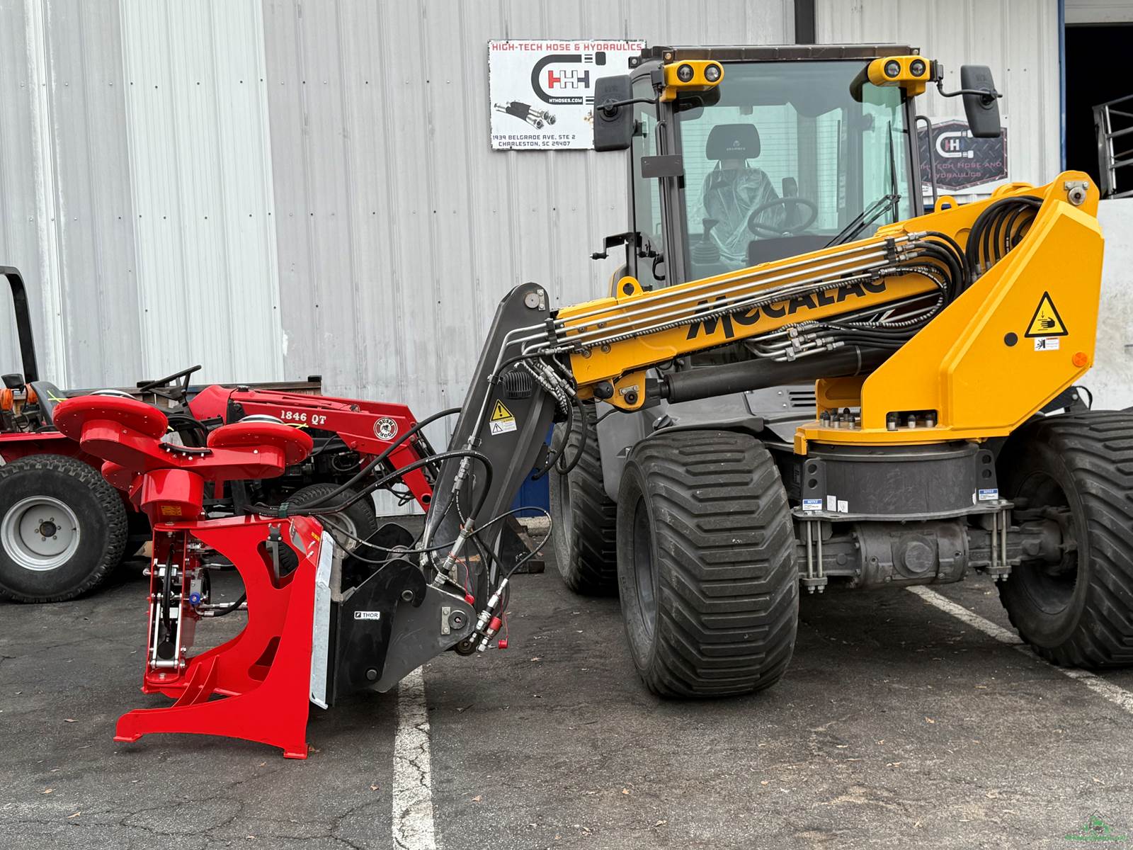 Includes: forks, bucket, man basket, universal skid steer attachment.