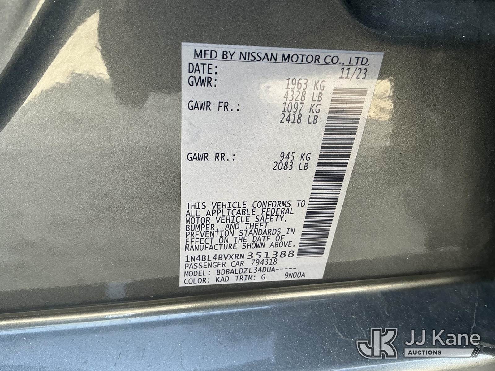 2024 Nissan Altima 4-Door Sedan, 4-cyl gas, Auto, FWD, A/C, (37,660 miles) State of FL Unit (Wrecked) (Runs & Moves) (Check Engine Light On, Traction Control Light On, Passenger Side Front Tire Off Rim, Body Damage) This is a Titled Item NOTE: This unit is being sold AS IS/WHERE IS via Timed Auction and is located in Thonotosassa, FL. Inspection & preview days for this unit are the 2 business days prior to the first day of items closing for this auction, item is located at 11720 N US 301 Thonotosassa, Fl 33592 and hours of operations are 8a-4p. For pre-sale questions, please contact Office Staff @ (813) 986-2485. (Buyer is responsible for removal. Assistance by consignor or JJ Kane Auctioneers is not assured.)