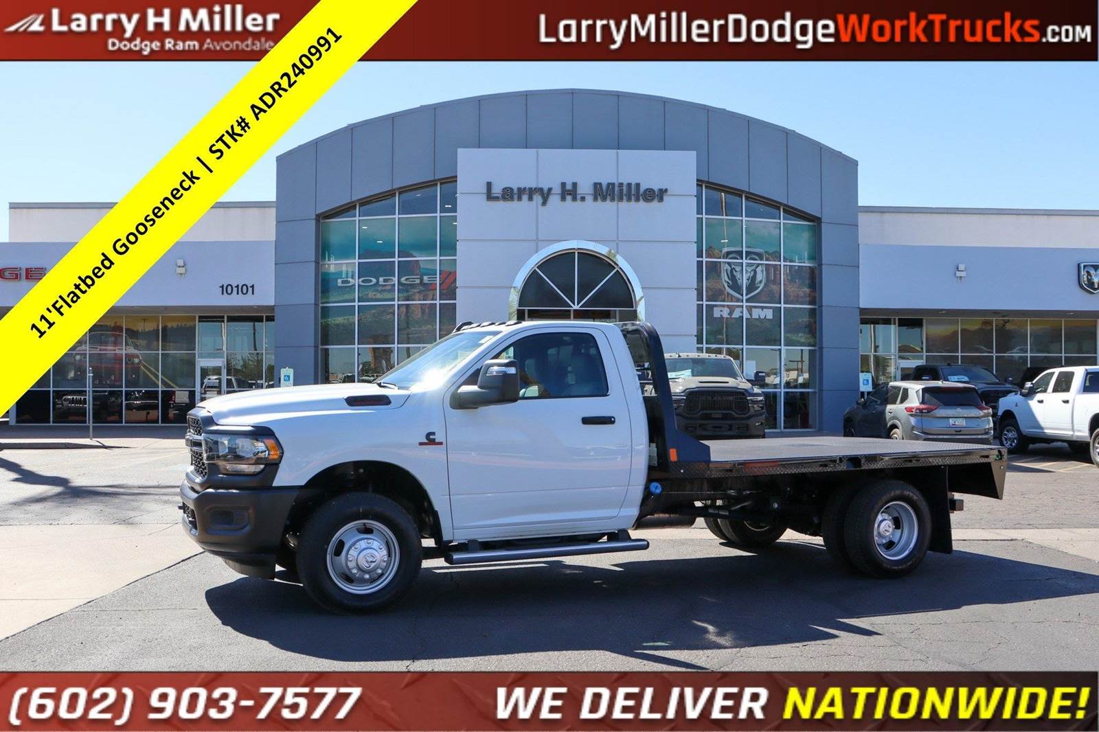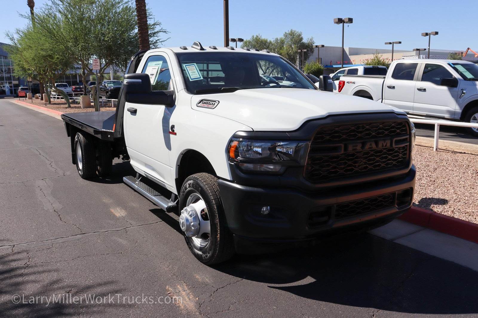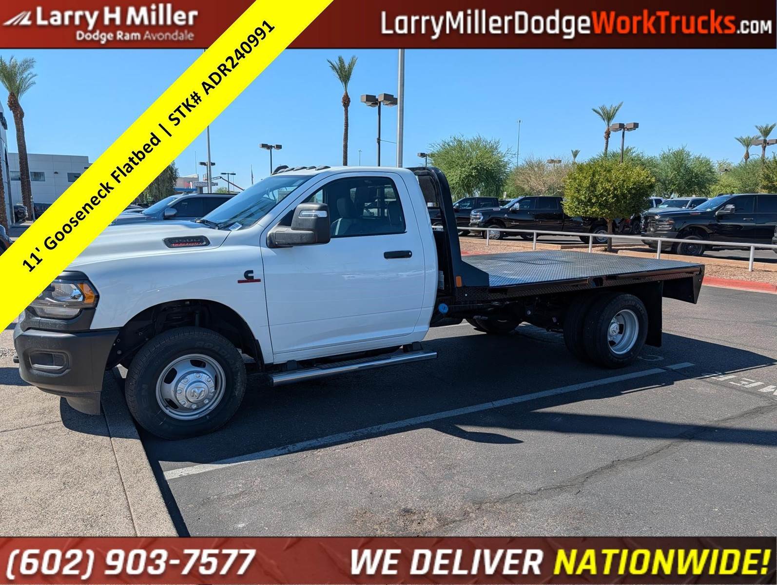 New 2024 Ram 3500 Reg Cab 4x2 Diesel 11' CM Gooseneck Flatbed work truck for sale.Bright White Clearcoat 2024 Ram 3500 Tradesman 167.5 WB RWD Aisin 6-Speed Automatic Cummins 6.7L I6 Turbodiesel 102 mph Maximum Speed, 115V Auxiliary Power Outlet, 3.73 Axle Ratio, 4 Speakers, 4-Wheel Disc Brakes, 40/20/40 Split Bench Seat, 400W Inverter, ABS brakes, Air Conditioning, Ambulance Prep Group, Black Exterior Mirrors, Black Exterior Truck Badging, Black Key Fob, Center Hub, Chrome Tubular Side Steps, Compass, Delay-off headlights, Delete Front Center Seat, Door Sill Scuff Pads, Driver door bin, Dual front impact airbags, Dual rear wheels, Electronic Stability Control, Emergency communication system: SiriusXM Guardian, Exterior Mirrors Courtesy Lamps, Exterior Mirrors w/Heating Element, Exterior Mirrors w/Supplemental Signals, For Details, Visit , Front 1-Touch Down Power Windows, Front anti-roll bar, Front Bucket Seats, Front Fog Lamps, Fully automatic headlights, Global Telematics Box Module (TBM), Glove Box, GPS Antenna Input, Halogen Quad Headlamps, HD Vinyl 40/20/40 Split Bench Seat, Integrated Voice Command w/Bluetooth, Manual Adjust 4-Way Driver Seat, Manual Adjust 4-Way Front Passenger Seat, Manual Folding Exterior Mirrors, Manual Telescoping Mirrors, Map/Courtesy Lamp, Matte Black Grille Surround, Mirror Power Heat Fold Telescope Black, Mirror Running Lights, Occupant sensing airbag, Outside temperature display, Overhead Console, Overhead Cupholder Lamp, ParkView Rear Back-Up Camera, Passenger door bin, Passenger vanity mirror, Power Adjust Mirrors, Power steering, Power-Adjustable Convex Aux Mirrors, Quick Order Package 2YA Tradesman, Radio data system, Radio: Uconnect 3 w/5 Display, Rear A/C Heater Prep Group, Rear anti-roll bar, Rear Backup Alarm, Rear Dome Lamp, Remote Keyless Entry, Remote USB Port - Charge Only, Speed control, Speed Sensitive Power Locks, Tachometer, Temperature & Compass Gauge, Tilt steering wheel, Tow Hooks, Traction control, Tradesman Level 1 Equipment Group, Upgraded Door Trim Panel, Variably intermittent wipers, Voltage Monitoring Auto Idle Up System, Voltmeter, Wheels: 17 x 6.0 Argent Steel.At Larry H Miller Dodge Ram Avondale, we believe in providing our guests with a quality experience. With one of the widest used-car inventory selections in the valley, our seasoned sales professionals will ensure that your needs and wants are satisfied during the purchase of your next vehicle. Feel free to browse our online listings, and please reach out with any additional questions or requests. We are always happy to assist and ensure that your purchase is easy and enjoyable.Ambulance Prep Group (Rear A/C Heater Prep Group), Quick Order Package 2YA Tradesman (Black Exterior Truck Badging, Black Key Fob, Door Sill Scuff Pads, Glove Box, Halogen Quad Headlamps, Map/Courtesy Lamp, Matte Black Grille Surround, and Rear Dome Lamp), Tradesman Level 1 Equipment Group (Black Exterior Mirrors, Exterior Mirrors Courtesy Lamps, Exterior Mirrors w/Heating Element, Exterior Mirrors w/Supplemental Signals, Front 1-Touch Down Power Windows, Manual Folding Exterior Mirrors, Manual Telescoping Mirrors, Mirror Power Heat Fold Telescope Black, Mirror Running Lights, Overhead Console, Overhead Cupholder Lamp, Power Adjust Mirrors, Power-Adjustable Convex Aux Mirrors, Remote Keyless Entry, Speed Sensitive Power Locks, and Upgraded Door Trim Panel), 102 mph Maximum Speed, 115V Auxiliary Power Outlet, 3.73 Axle Ratio, 4 Speakers, 4-Wheel Disc Brakes, 40/20/40 Split Bench Seat, 400W Inverter, ABS brakes, Air Conditioning, Center Hub, Chrome Tubular Side Steps, Compass, Delay-off headlights, Delete Front Center Seat, Driver door bin, Dual front impact airbags, Dual rear wheels, Electronic Stability Control, Emergency communication system: SiriusXM Guardian, For Details, Visit , Front anti-roll bar, Front Bucket Seats, Front Fog Lamps, Fully automatic headlights, Global Telematics Box Module (TBM), GPS Antenna Input, HD Vinyl Price includes $699 dealer adde