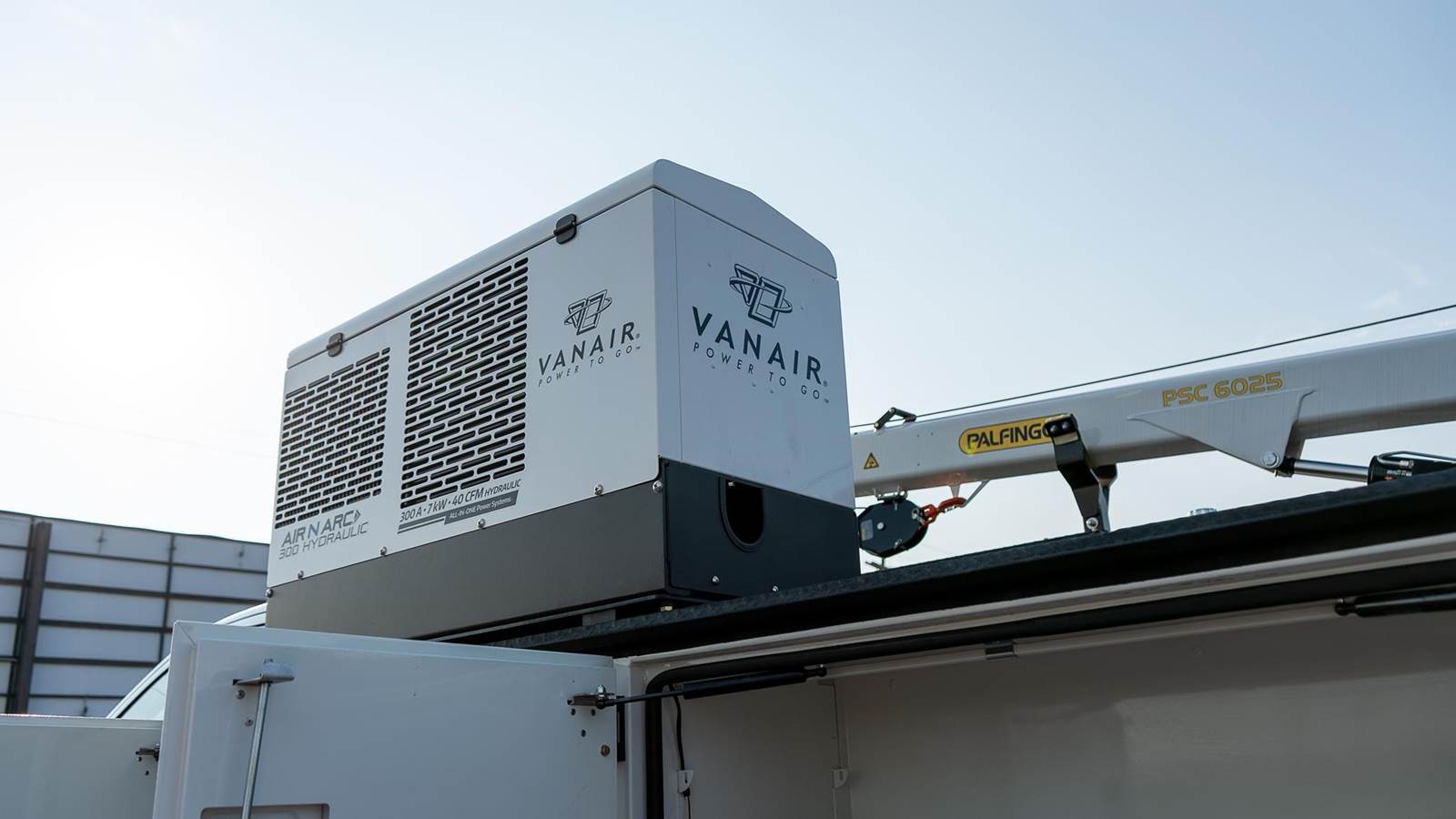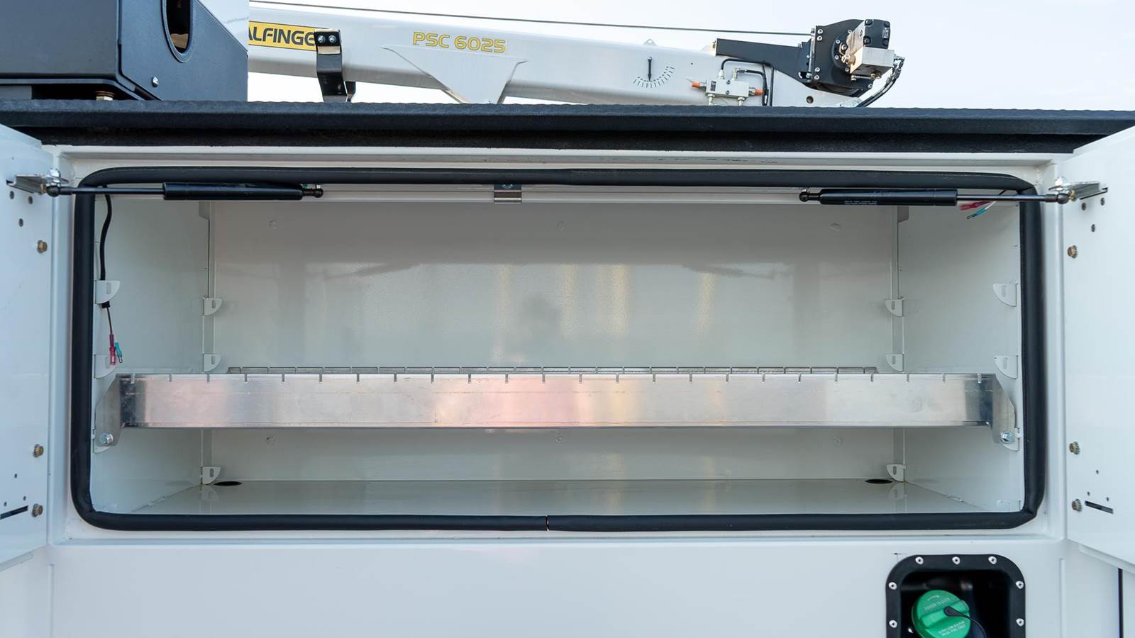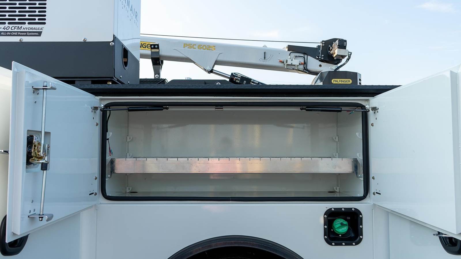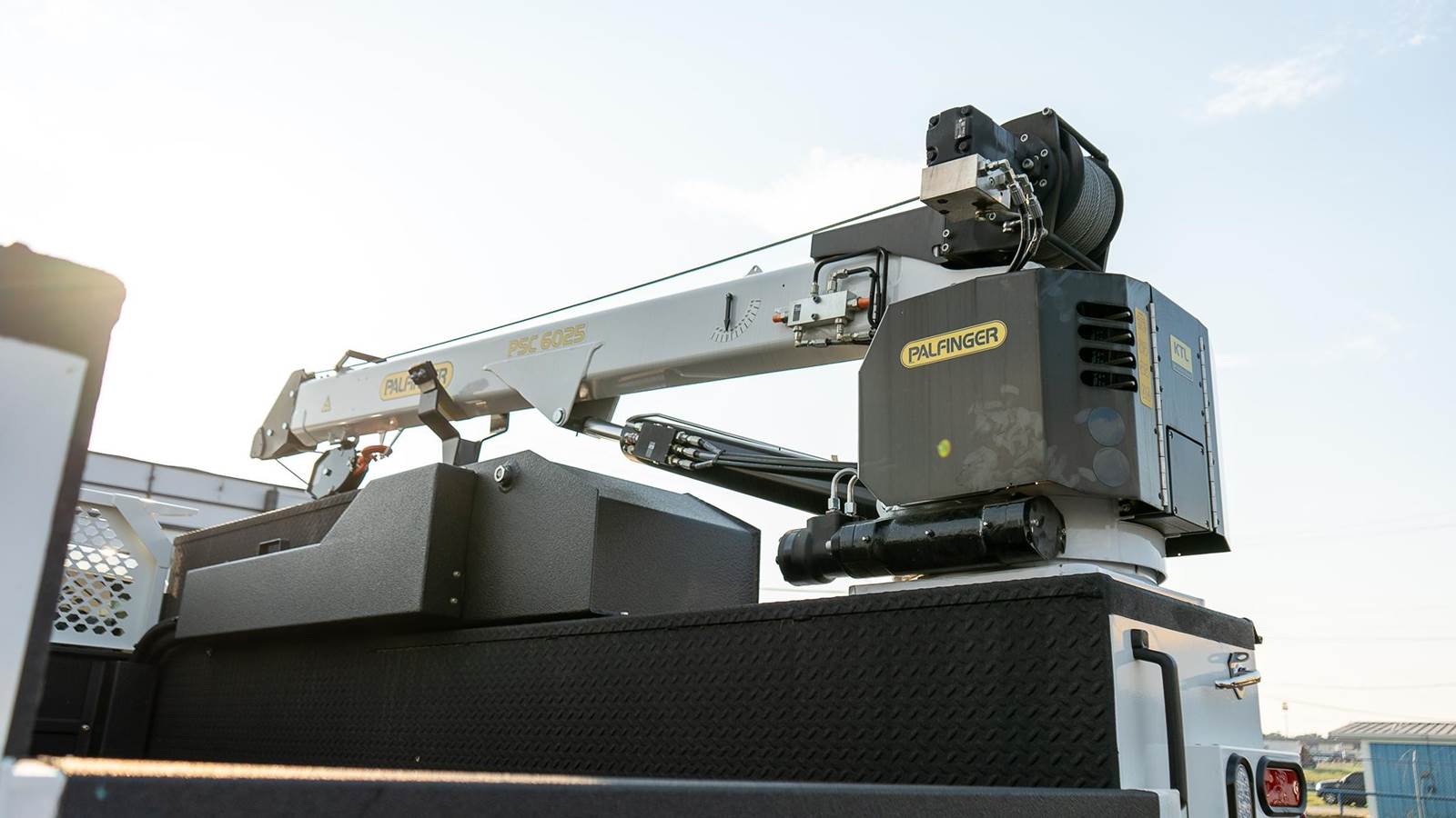 Palfinger model PSC 6025 telescopic service crane; 38,500 ft. lbs., 25' reach capability, two hydraulic powered extensions, 6,000 Lb. vertical lift capacity, - 25 to +75 degree boom elevation, double acting cylinders with load holding valves on all cylinders, overload shutdown system, wireless radio remote controller pistol grip and toggle controller with 36' pendant, decals, crane hook, load line block, Ecoat prime, finish paint white topcoat paint and crane mounting bolt kit.