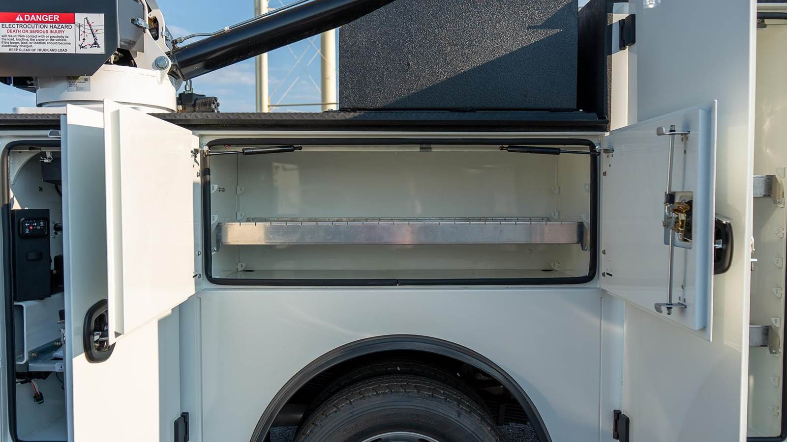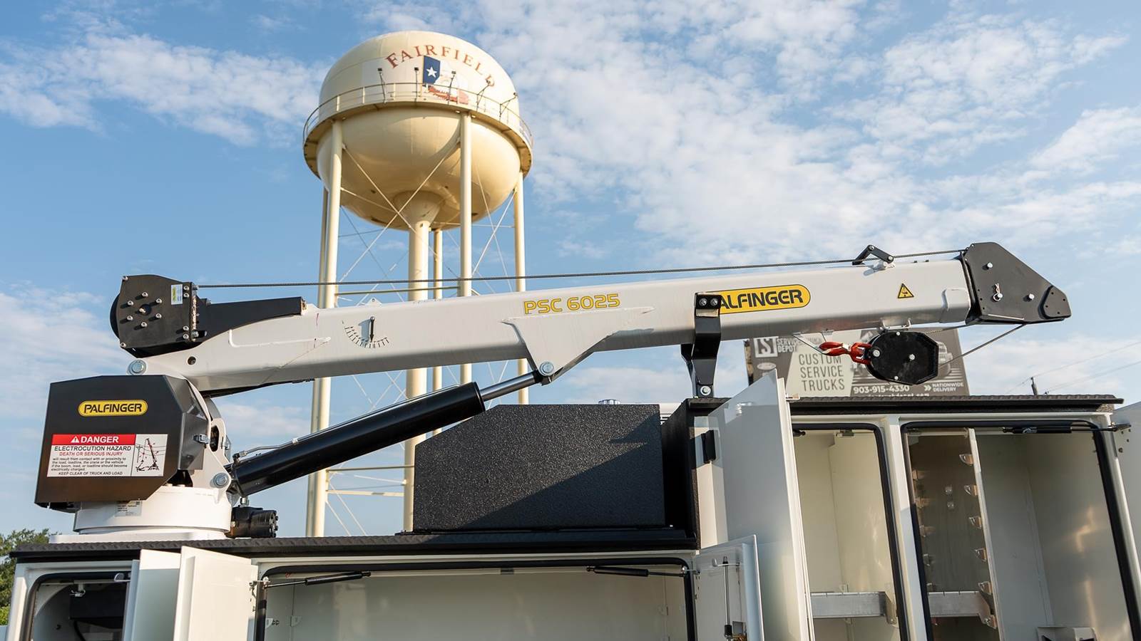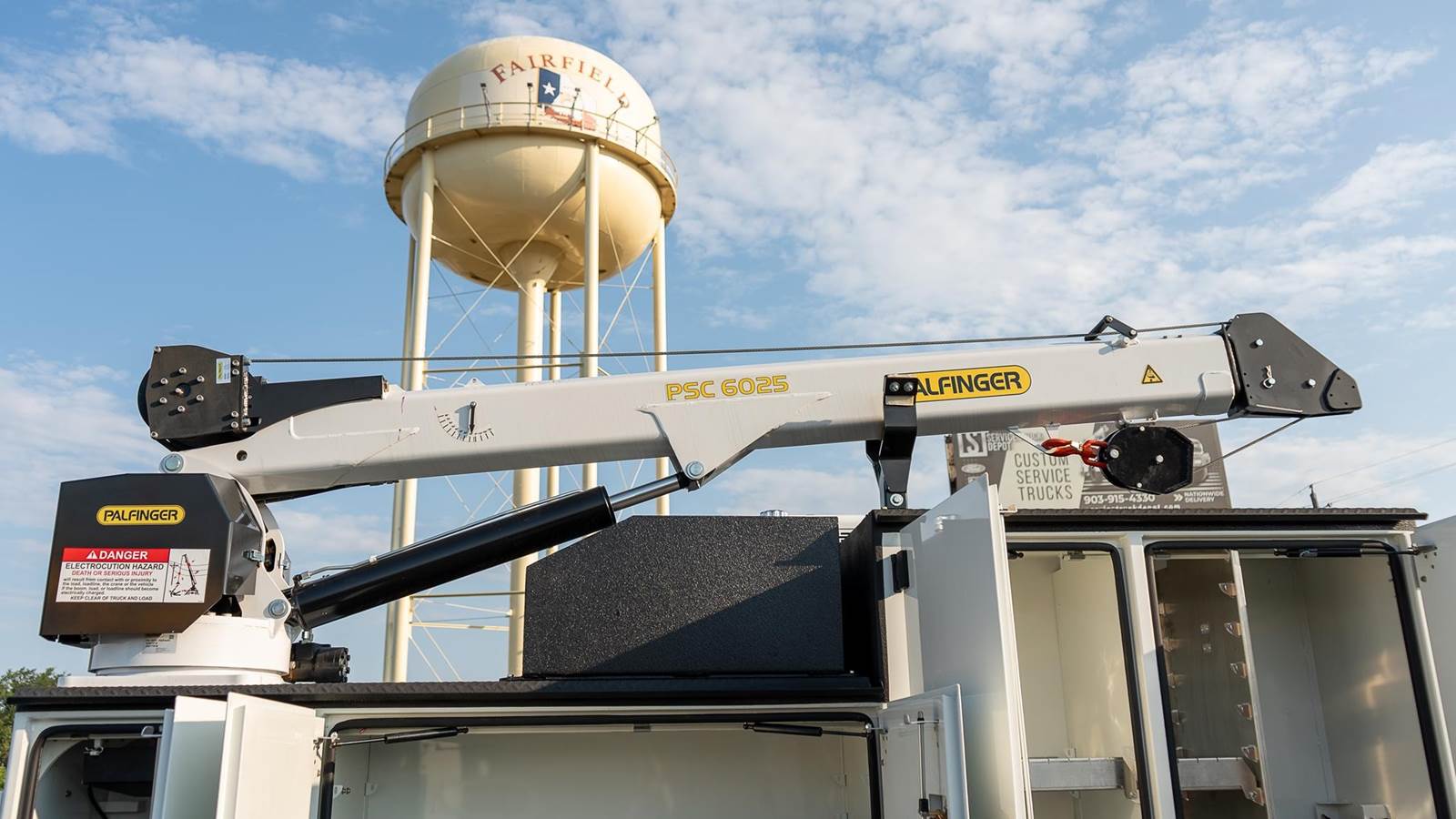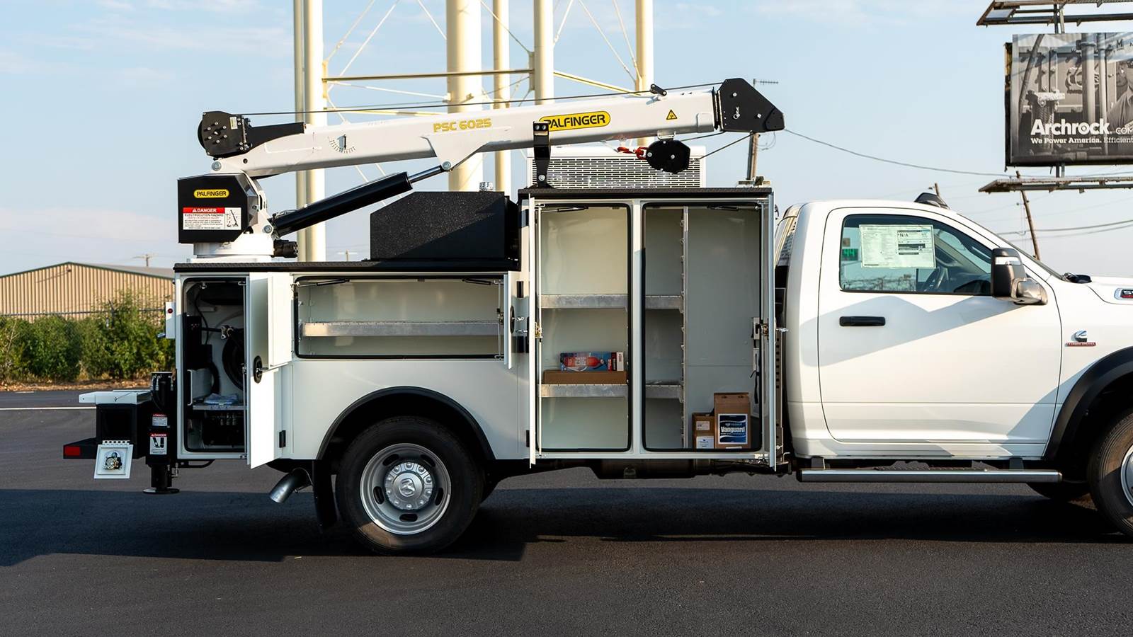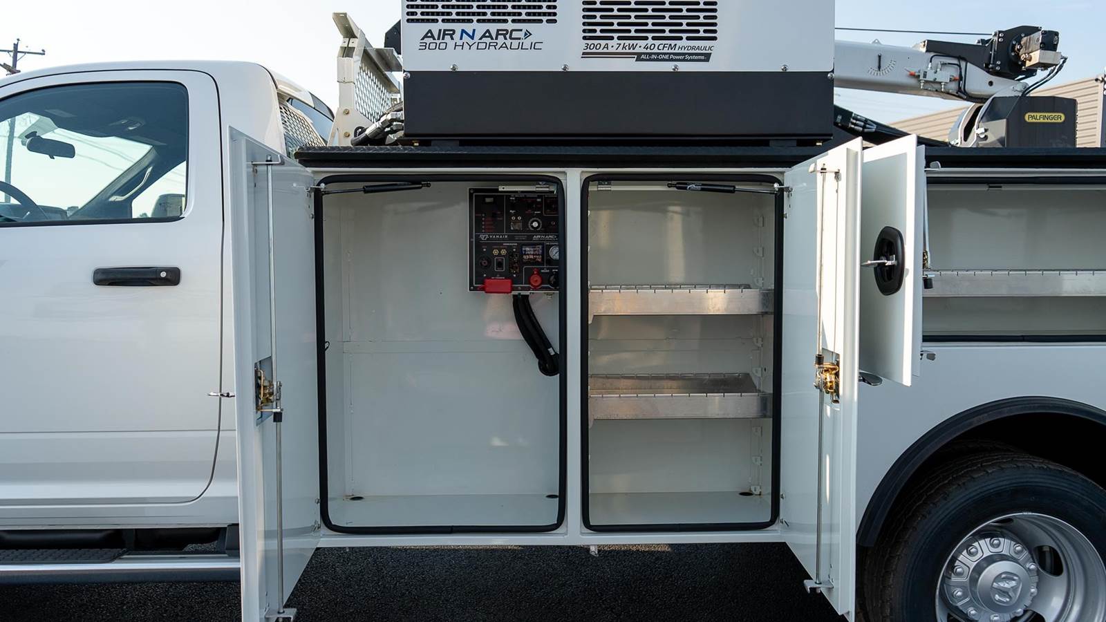 Palfinger model PSC 6025 telescopic service crane; 38,500 ft. lbs., 25' reach capability, two hydraulic powered extensions, 6,000 Lb. vertical lift capacity, - 25 to +75 degree boom elevation, double acting cylinders with load holding valves on all cylinders, overload shutdown system, wireless radio remote controller pistol grip and toggle controller with 36' pendant, decals, crane hook, load line block, Ecoat prime, finish paint white topcoat paint and crane mounting bolt kit.
