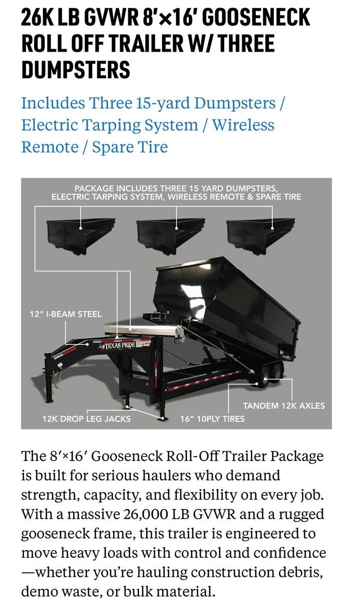 Purchased December of 24, I purchased to haul concrete for a Brick Paver company. Tge company has gone out of business, my construction company is too busy for me to sell out more customers for the dumpster. So I use them on my site. But the trailer and 2 dumpsters are just sitting around not able to be used. I had the bottom of tge dumpsters built with thicker metal, to be able to take the abuse of the concrete