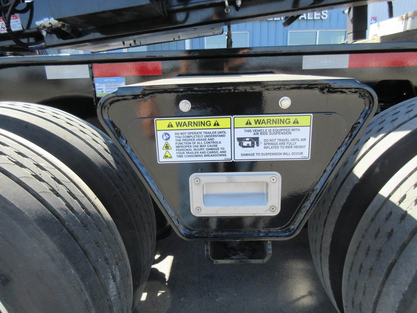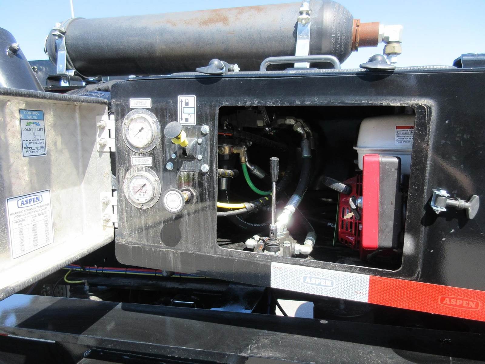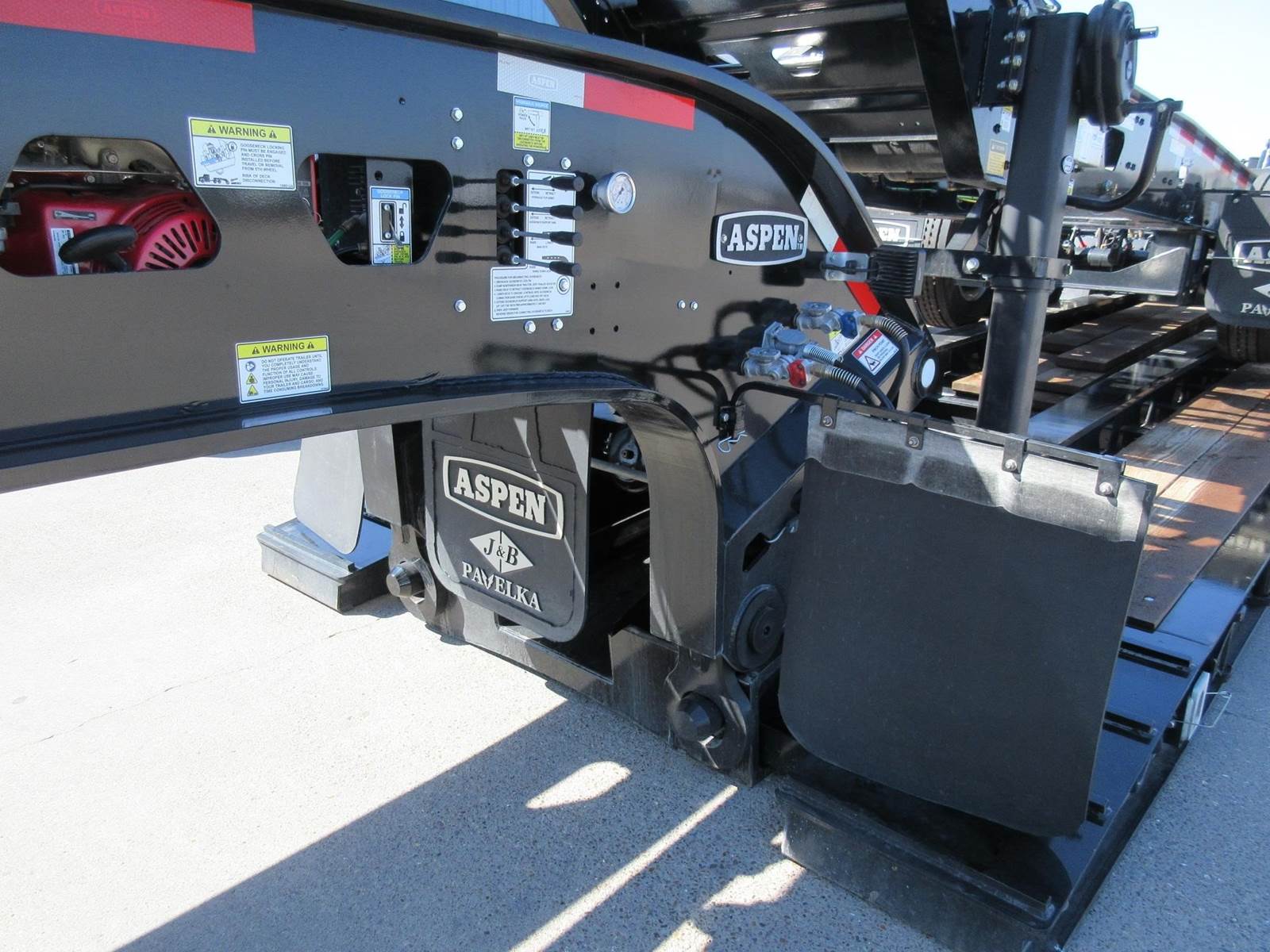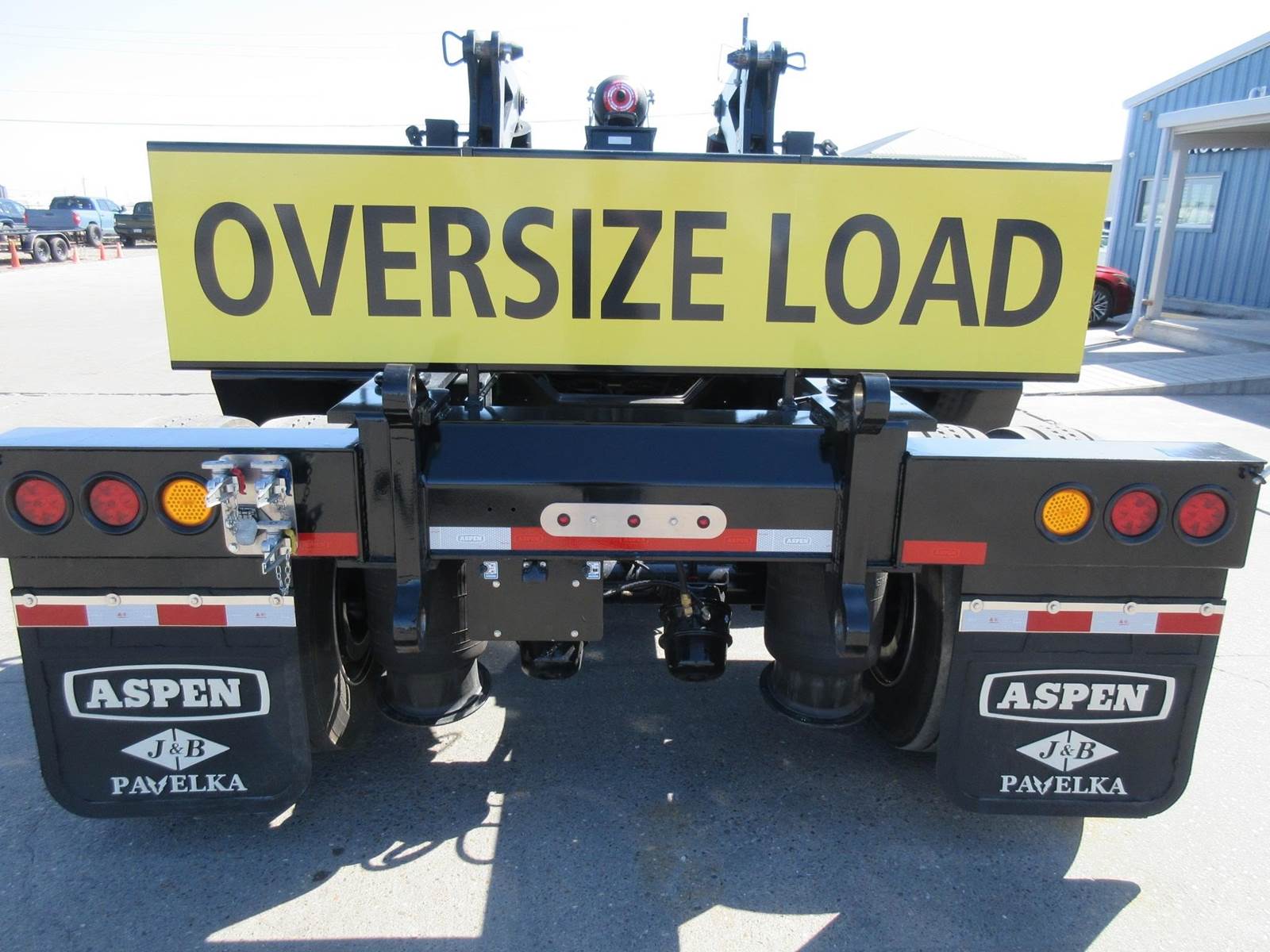 New 2025 Aspen 20 ton 2 axle hydraulic accumulating booster. 8'6" wide. 14'1" spread. All aluminum wheels. 275/70R22.5 tires. Drum brakes. Oversize sign and frame included. Central tire inflation system. Black in color.