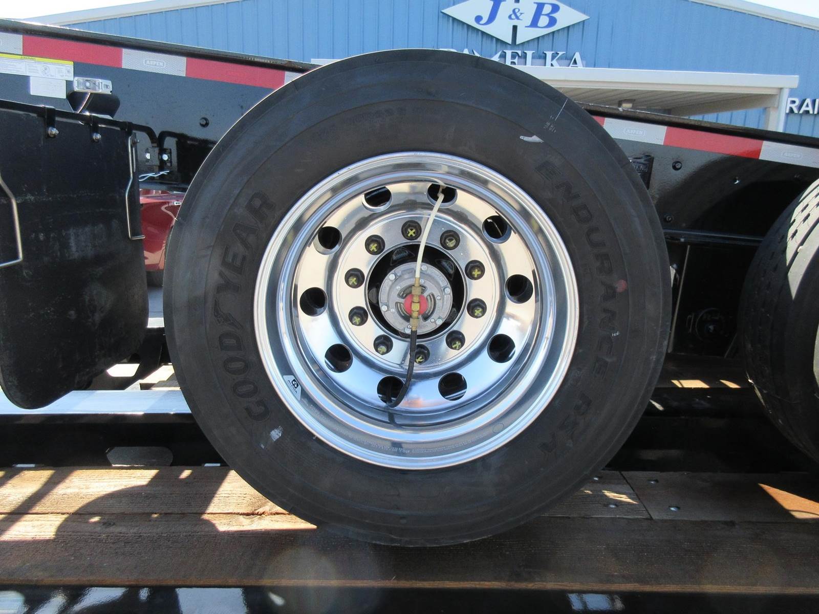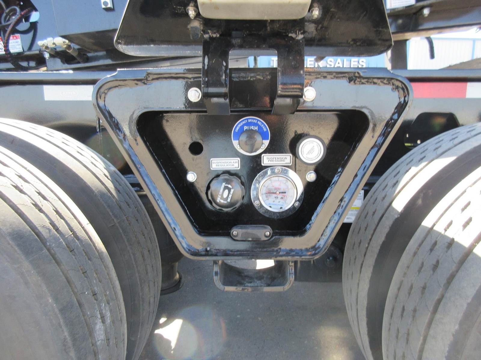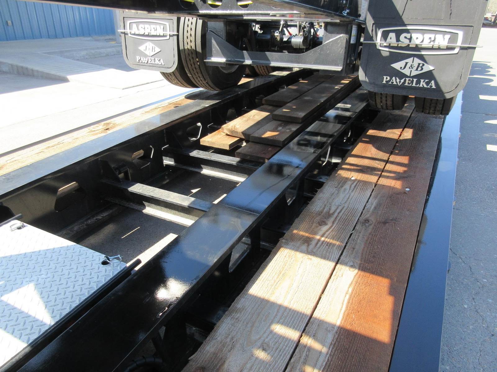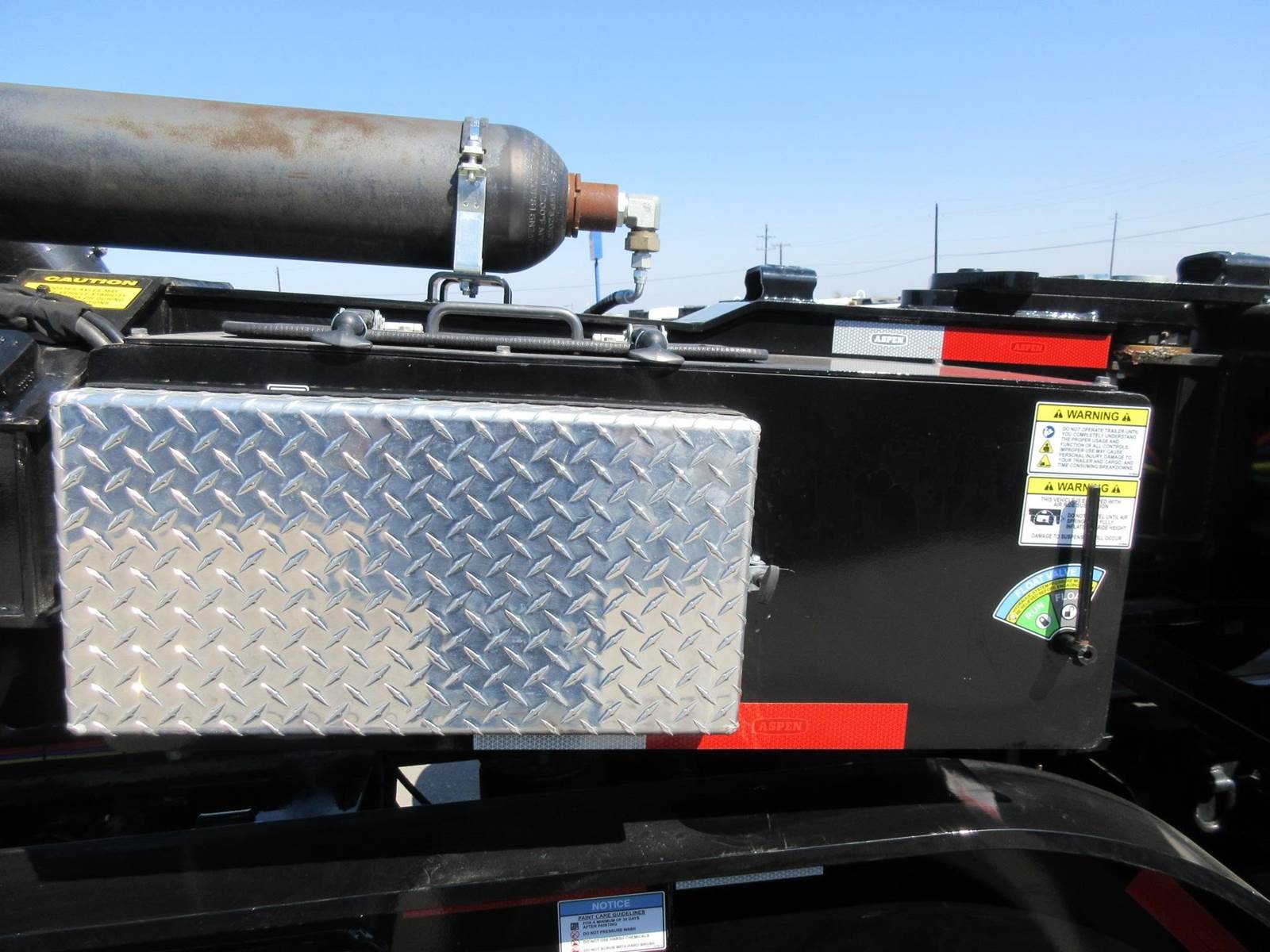 New 2025 Aspen 20 ton 2 axle hydraulic accumulating booster. 8'6" wide. 14'1" spread. All aluminum wheels. 275/70R22.5 tires. Drum brakes. Oversize sign and frame included. Central tire inflation system. Black in color.