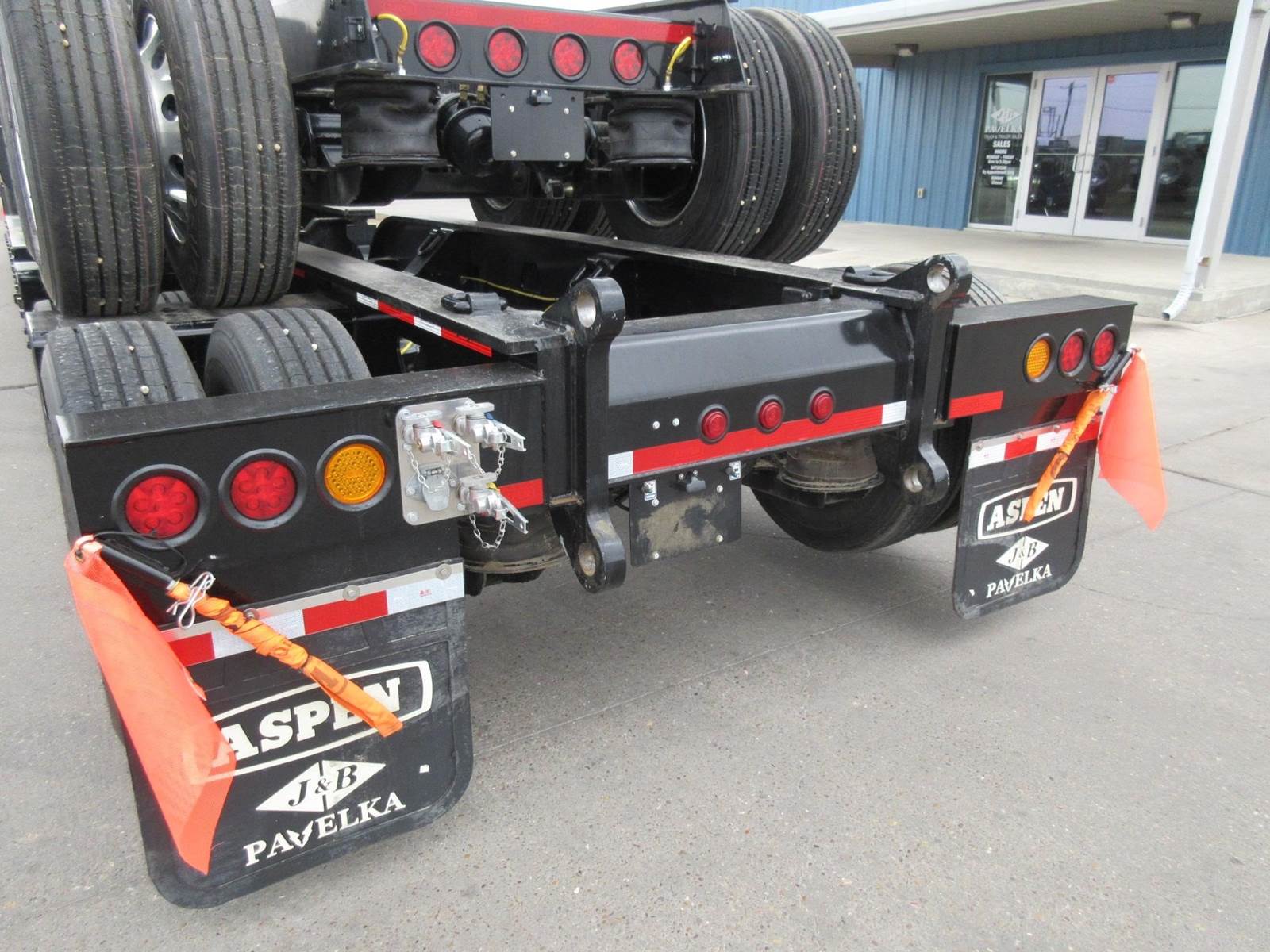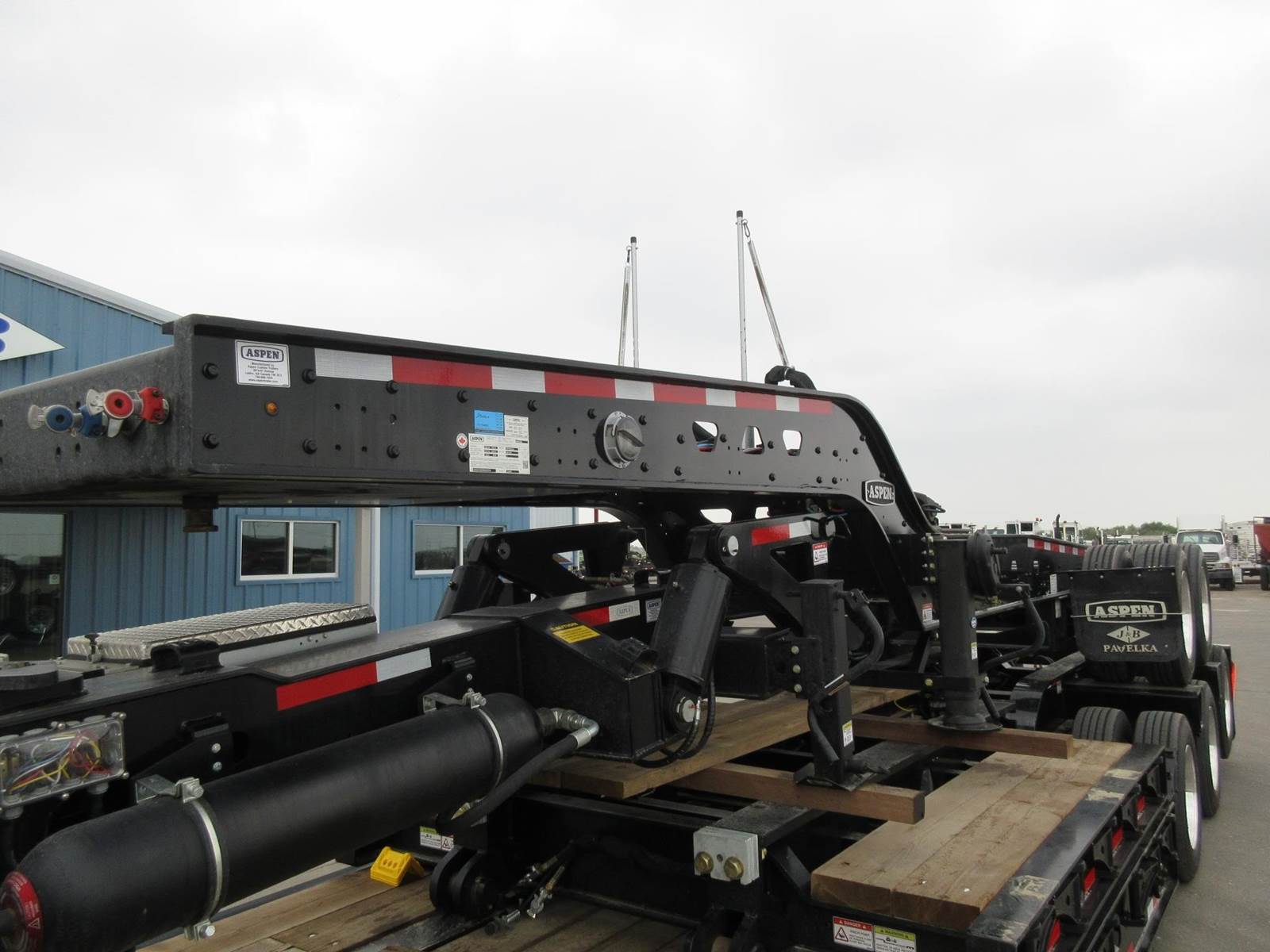 New 2026 Aspen 20 ton 2 axle hydraulic accumulating booster. 8'6" wide. 14'1" spread. All aluminum wheels. 275/70R22.5 tires. Drum brakes. Oversize sign and frame included. Black