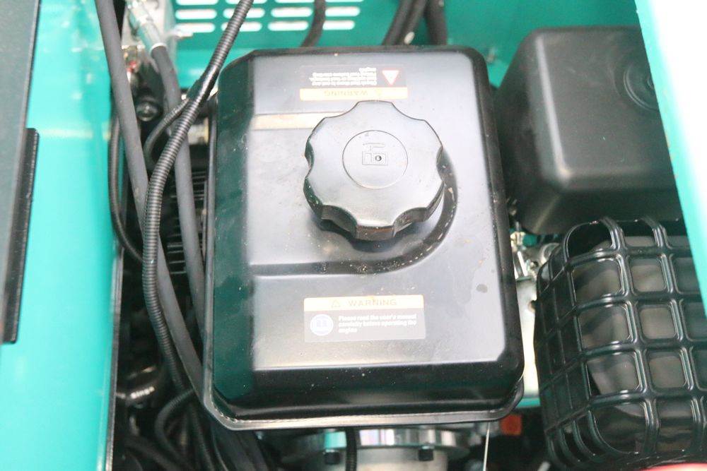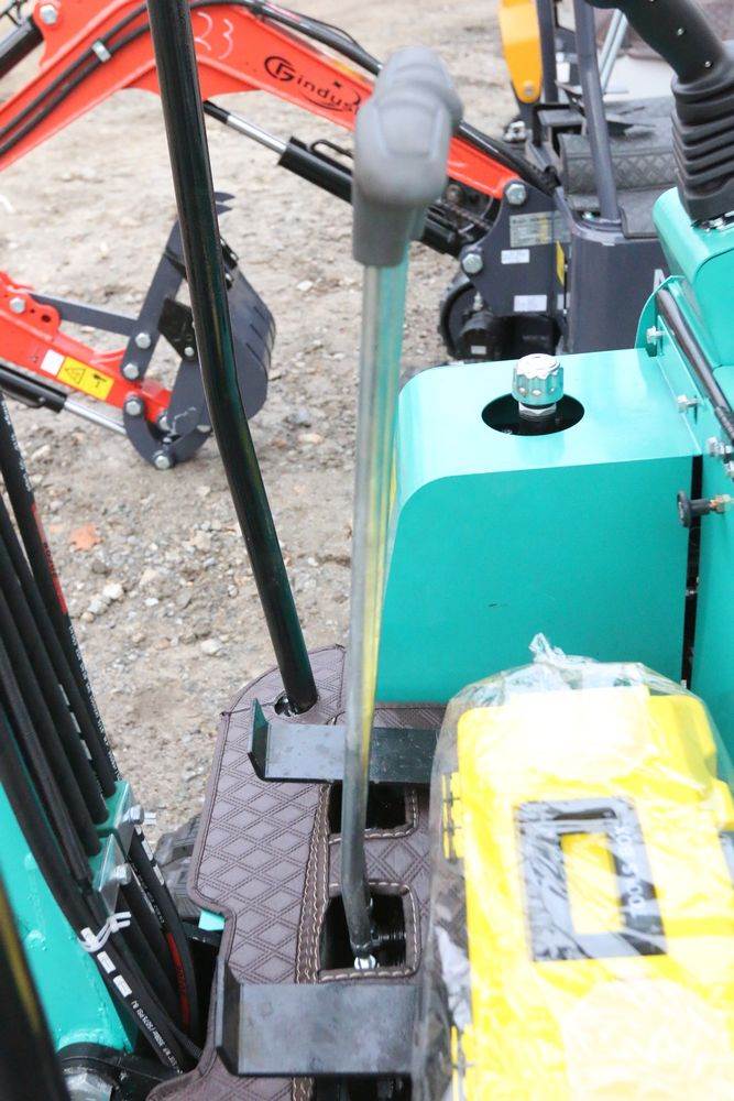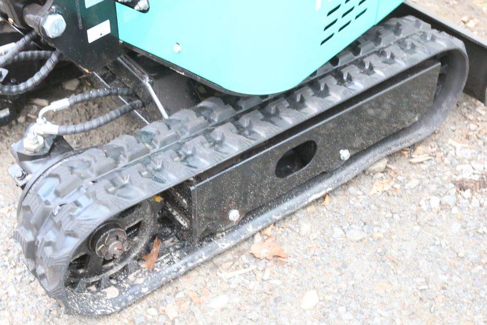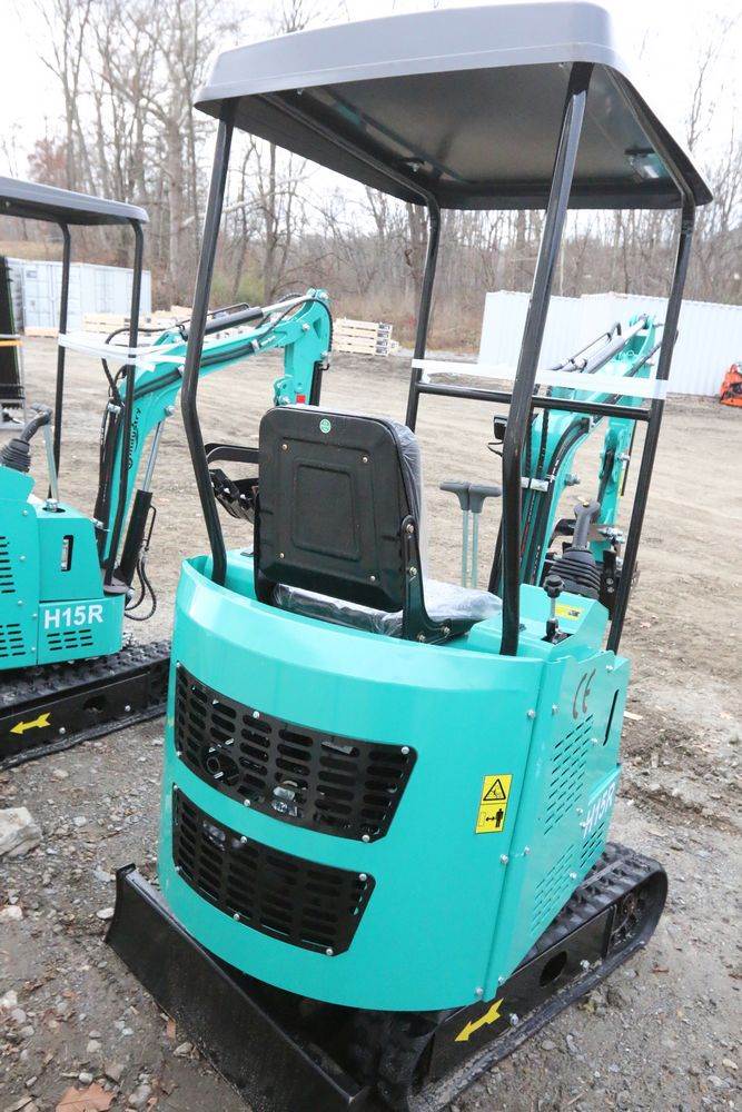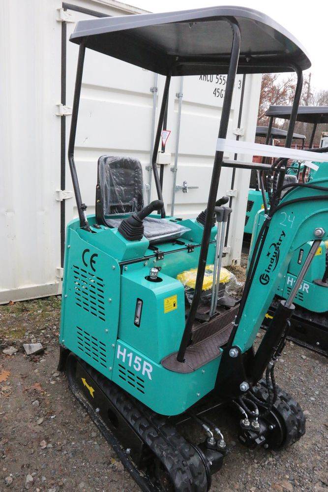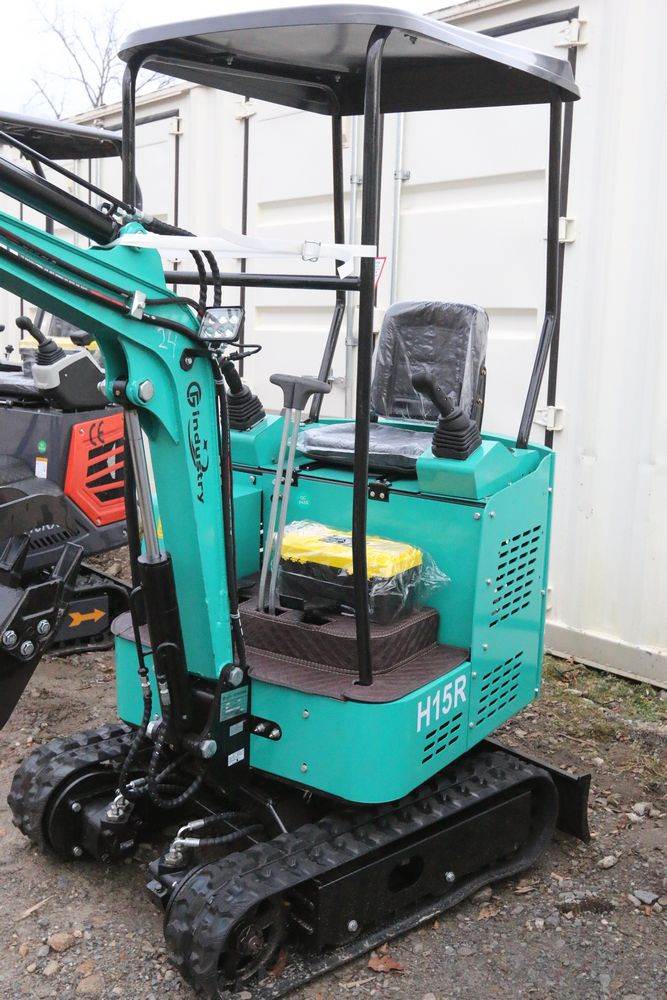 New 2025 CFG Industrial gas powered mini Excavator model H15R with 420cc gasoline engine, bucket, 4' long tracks, 38.5" wide base, 6" wide tracks, canopy, hydraulic boom & bucket controls, pilot system, thumb, dozer blade. Hours reading less than 1 hour.