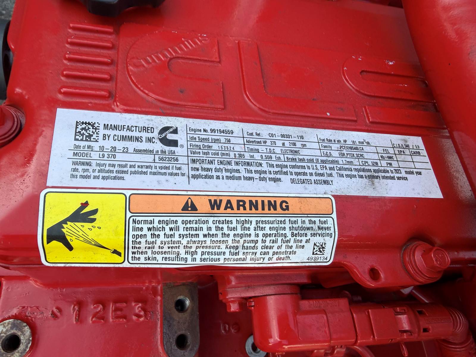 (NEW) 2023 Cummins L9 Diesel Engine (EPA21), CPL: 5298, HP RATING: 370HP @ 2100 RPM, Service Model Name: L9 CM2450 L126B, Marketing Name: Cummins L9 370, Displacement: 8.9L, Engine Family # PCEXH0540LCA, Engine Serial # 99194559, Engine Configuration: D563027BX03, VISIT JJREBUILDERS or CALL 786-377-5210 FOR MORE INFORMATION. REF INV # 006755