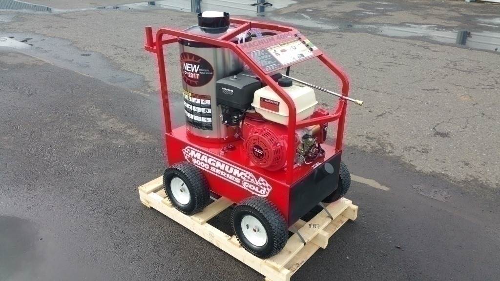 Location: Washougal WA ***Unused Manufacturer Consignment*** S/N: 253395 Engine: Lifan 15hp Gas 4,000 psi, 3.5 gpm, Electric Ignition w/ Pull Start Back Up, Diesel Burner w/ 10 Gallon Fuel Tank, 350,000 BTU, Temperature Control, Adjustable Pressure Control, 3/8 in. High Pressure Hose, Gun, Nozzles, Heavy Duty Protection Cage, 13in. Pneumatic Tires, **Stock images shown, actual item may vary slightly from pictures, including in color. Buyer is responsible for pre-inspection of the item. Auctioneer IS NOT responsible for differences, defects, missing parts or pieces or transit damage (noted or otherwise)**