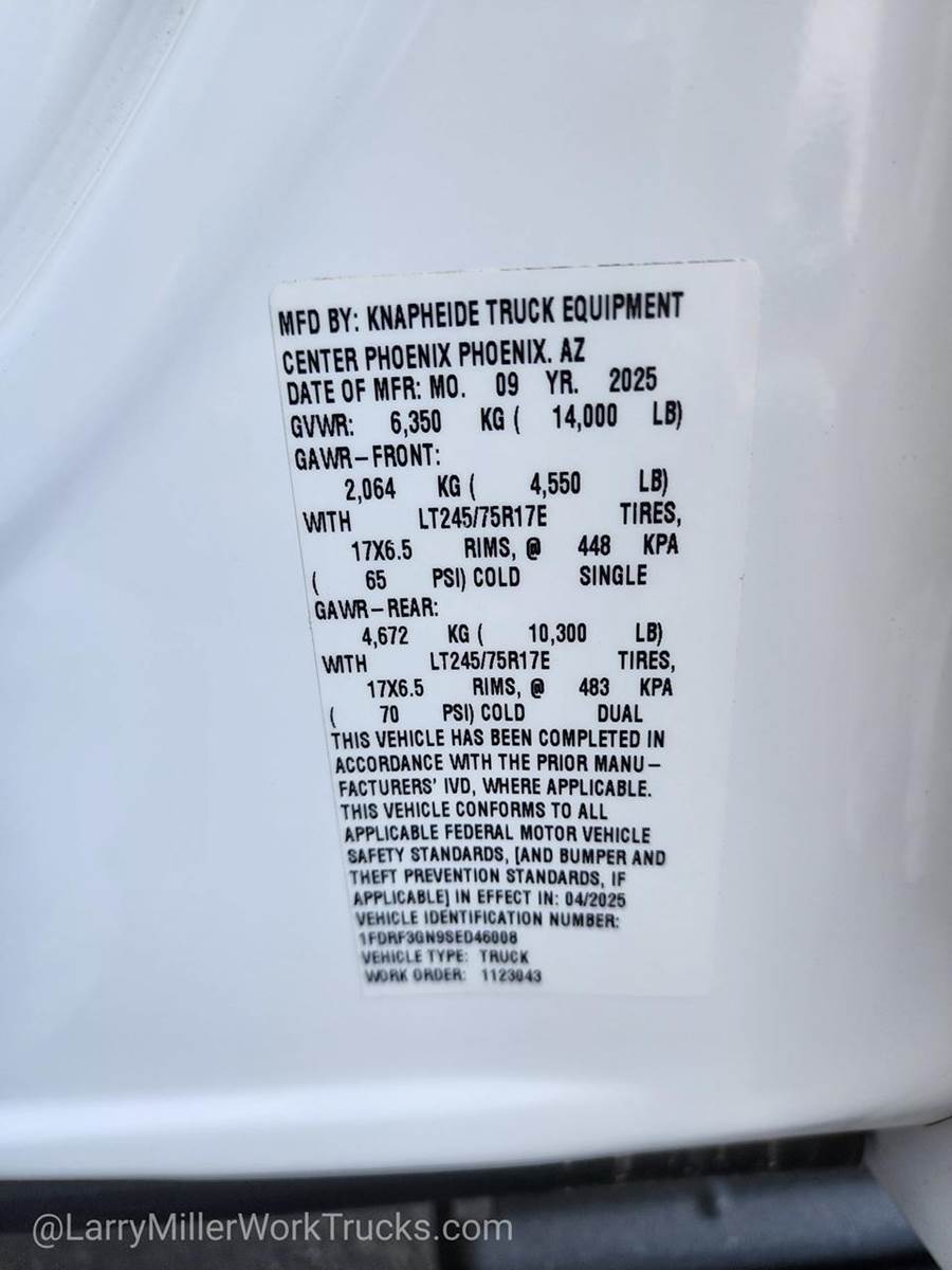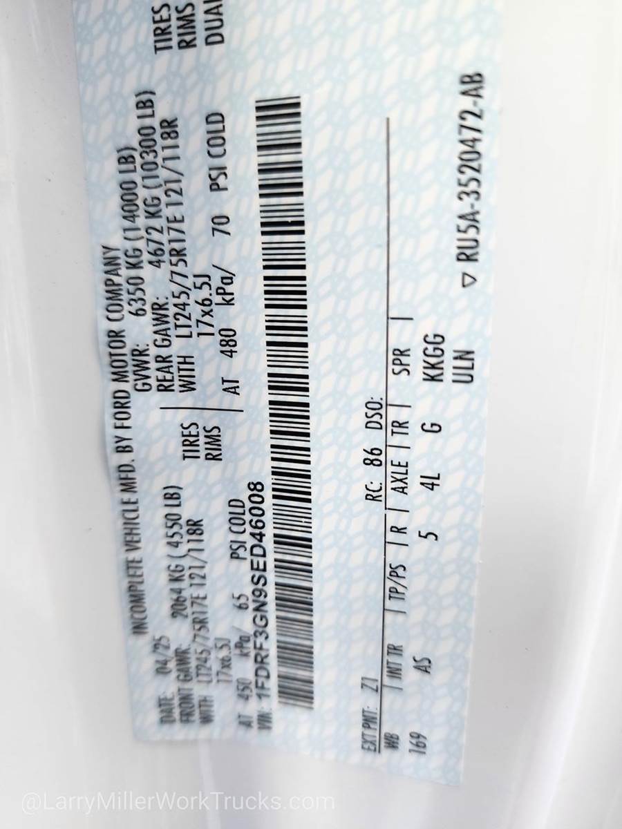 Options: 153 18B 425 44G 512 52B 572 59H 61J 640A 65Z 872 96V 99N AS TD8 X4L Z1,OXFORD WHITE,4-TON HYDRAULIC JACK,TIRES: LT245/75RX17E BSW PLUS A/S (6) -inc: Spare may not be the same as the road tire (STD),SPARE TIRE & WHEEL -inc: Excludes carrier 4-Ton Hydraulic Jack,PLATFORM RUNNING BOARDS,MEDIUM DARK SLATE HD VINYL 40/20/40 SPLIT BENCH SEAT -inc: center armrest cupholder storage 2-way adjustable driver/passenger headrests and driver's side manual lumbar,REAR VIEW CAMERA & PREP KIT -inc: Pre-installed content includes cab wiring and frame wiring to the rear most cross member Upfitters kit includes camera w/mounting bracket 20' jumper wire and camera mounting/aiming instructions,FRONT LICENSE PLATE BRACKET,ORDER CODE 640A,TRAILER BRAKE CONTROLLER,XL CHROME PACKAGE -inc: Halogen Fog Lamps Bright Grille Remote Start Chrome Front Bumper,CENTER HIGH-MOUNTED STOP LAMP (CHMSL),TRANSMISSION: TORQSHIFT 10-SPEED AUTOMATIC -inc: SelectShift selectable drive modes: normal tow/haul eco slippery roads and trail and transmission power take-off provision (STD),LIMITED SLIP W/4.30 AXLE RATIO,ENGINE: 7.3L 2V DEVCT NA PFI V8 GAS (STD),Rear Wheel Drive,Power Steering,Dual Rear Wheels,ABS,4-Wheel Disc Brakes,Brake Assist,Steel Wheels,Tires - Front All-Season,Tires - Rear All-Season,Tow Hooks,Heated Mirrors,Power Mirror(s),Integrated Turn Signal Mirrors,Intermittent Wipers,Variable Speed Intermittent Wipers,Daytime Running Lights,Automatic Headlights,AM/FM Stereo,MP3 Capability,Steering Wheel Audio Controls,Auxiliary Audio Input,Adjustable Steering Wheel,Trip Computer,WiFi Hotspot,Keyless Entry,Power Door Locks,Cruise Control,A/C,Vinyl Seats,Split Bench Seat,Driver Adjustable Lumbar,Passenger Vanity Mirror,Smart Device Integration,Requires Subscription,MP3 Capability,Steering Wheel Audio Controls,Bluetooth Connection,Telematics,Auxiliary Audio Input,Smart Device Integration,Requires Subscription,Power Windows,Power Door Locks,Trip Computer,Security System,Immobilizer,Traction Control,Front Side Air Bag,Lane Departure Warning,Front Collision Mitigation,Tire Pressure Monitor,Driver Air Bag,Passenger Air Bag,Passenger Air Bag On/Off Switch,Front Head Air Bag