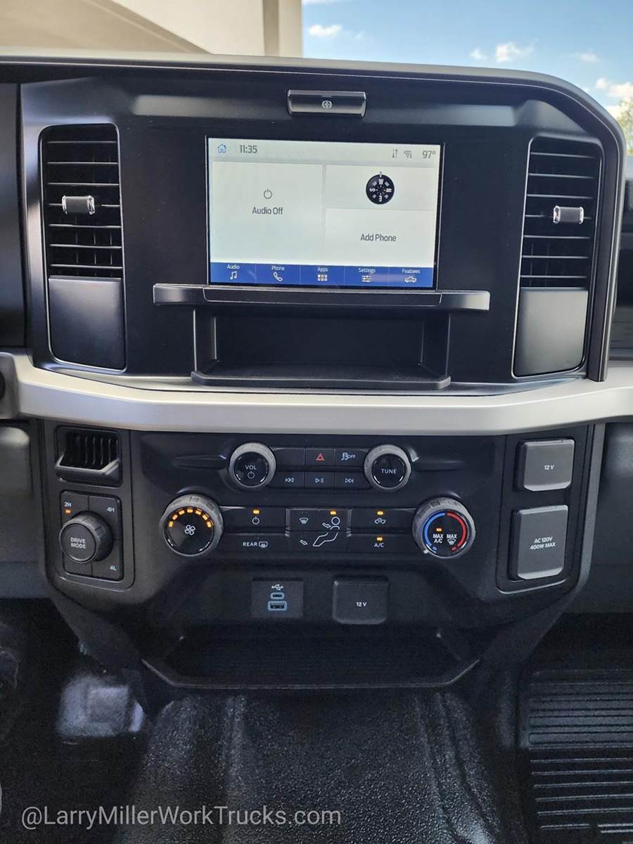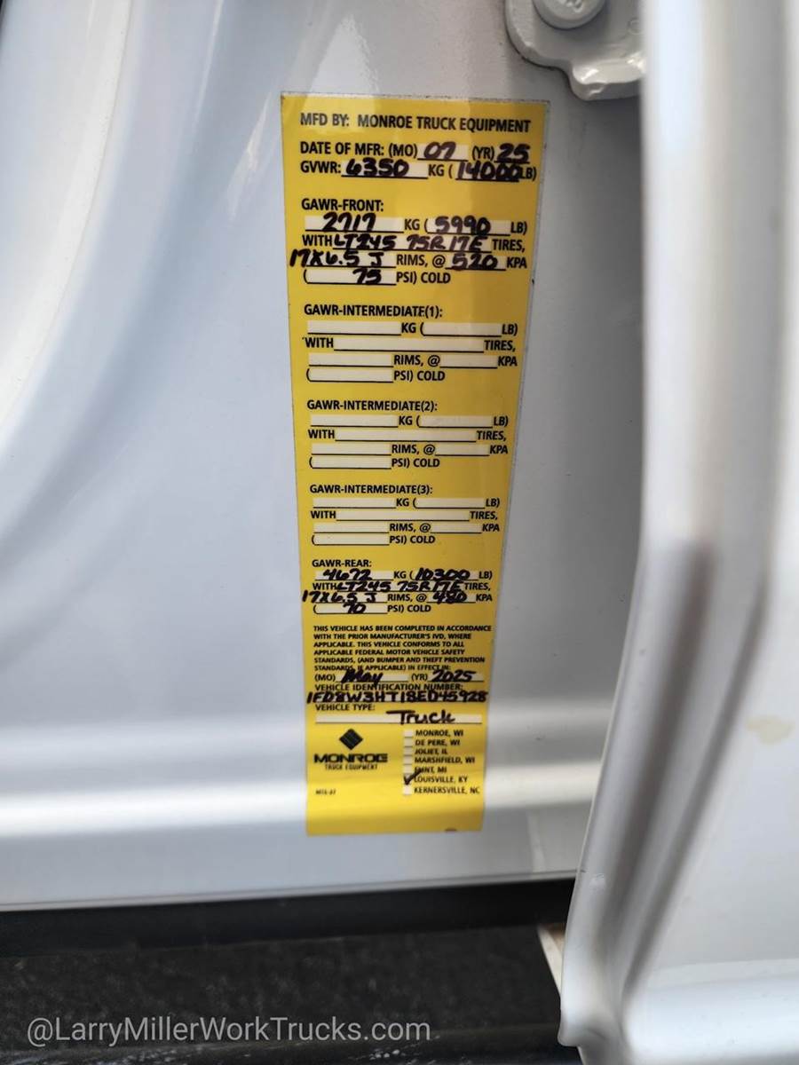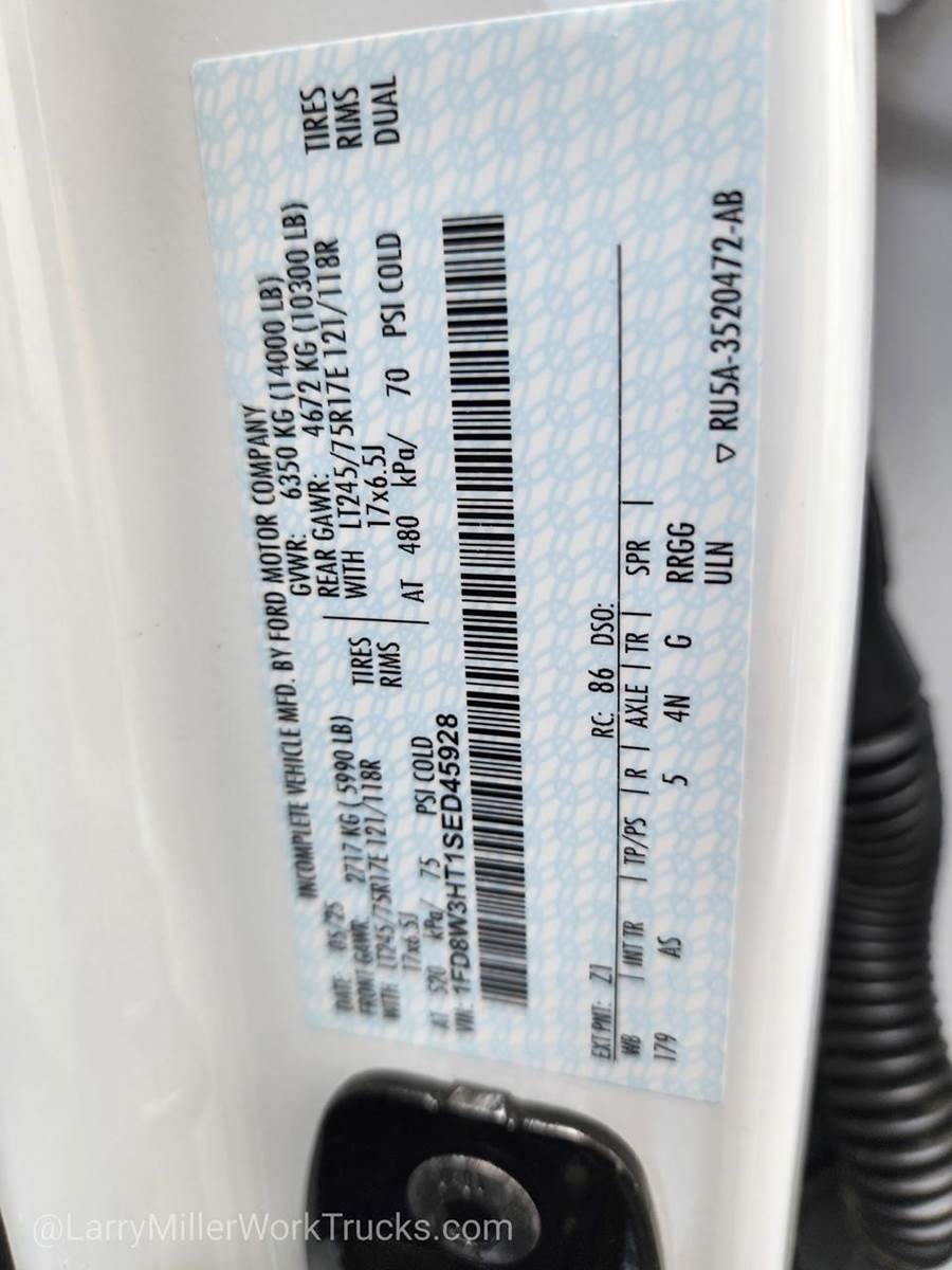 Options: 153 18B 41H 425 43C 44G 473 51D 572 61J 640A 65Z 67B 86M 872 96V 99T AS B3Z TBM X4N Z1,OXFORD WHITE,4-TON HYDRAULIC JACK,SNOW PLOW PREP PACKAGE -inc: pre-selected springs (see order guide supplemental reference for springs/FGAWR of specific vehicle configurations) Note 1: Restrictions apply; see supplemental reference or body builders layout book for details Note 2: Also allows for the attachment of a winch Note 3: Highly recommended to add (86M) dual battery on 7.3L gas engine Adding (67B) 410 amp dual alternators for diesel engine is highly recommended for max power output,120V/400W OUTLET -inc: 1 in-dash mounted outlet,PLATFORM RUNNING BOARDS,MEDIUM DARK SLATE HD VINYL 40/20/40 SPLIT BENCH SEAT -inc: center armrest cupholder storage 2-way adjustable driver/passenger headrests and driver's side manual lumbar,REAR VIEW CAMERA & PREP KIT -inc: Pre-installed content includes cab wiring and frame wiring to the rear most cross member Upfitters kit includes camera w/mounting bracket 20' jumper wire and camera mounting/aiming instructions,SPARE TIRE & WHEEL DELETE,DUAL 68 AH/65 AGM BATTERY,410 AMP DUAL ALTERNATORS -inc: 250 Amp + 160 Amp,ENGINE: 6.7L 4V OHV POWER STROKE V8 TURBO DIESEL B20 -inc: Operator Commanded Regeneration (OCR) Diesel Exhaust Fluid (DEF) tank and manual push-button engine-exhaust braking 250 Amp Alternator Dual 68 AH/65 AGM Battery,FRONT LICENSE PLATE BRACKET,ORDER CODE 640A,LIMITED SLIP W/4.10 AXLE RATIO,ENGINE BLOCK HEATER,TIRES: LT245/75RX17E BSW A/T -inc: Spare may not be the same as road tire,TRANSMISSION: TORQSHIFT 10-SPEED AUTOMATIC -inc: SelectShift selectable drive modes: normal tow/haul eco slippery roads and off-road and transmission power take-off provision (STD),XL CHROME PACKAGE -inc: Privacy Glass w/Power Sliding Rear Glass Halogen Fog Lamps Bright Grille Remote Start Chrome Front Bumper Rear Window Defroster,Four Wheel Drive,Power Steering,Dual Rear Wheels,ABS,4-Wheel Disc Brakes,Brake Assist,Steel Wheels,Tires - Front All-Season,Tires - Rear All-Season,Tow Hooks,Heated Mirrors,Power Mirror(s),Integrated Turn Signal Mirrors,Intermittent Wipers,Variable Speed Intermittent Wipers,Daytime Running Lights,Automatic Headlights,AM/FM Stereo,MP3 Capability,Steering Wheel Audio Controls,Auxiliary Audio Input,Pass-Through Rear Seat,Rear Bench Seat,Adjustable Steering Wheel,Trip Computer,Power Windows,WiFi Hotspot,Keyless Entry,Power Door Locks,Cruise Control,A/C,Vinyl Seats,Split Bench Seat,Driver Adjustable Lumbar,Passenger Vanity Mirror,Smart Device Integration,Requires Subscription,MP3 Capability,Steering Wheel Audio Controls,Bluetooth Connection,Telematics,Auxiliary Audio Input,Smart Device Integration,Requires Subscription,Power Windows,Power Door Locks,Trip Computer,Security System,Immobilizer,Traction Control,Front Side Air Bag,Lane Departure Warning,Front Collision Mitigation,Tire Pressure Monitor,Front Head Air Bag,Rear Head Air Bag,Driver Air Bag,Passenger Air Bag,Child Safety Locks