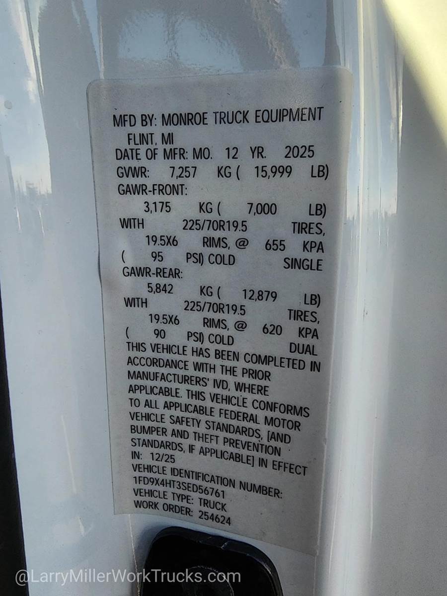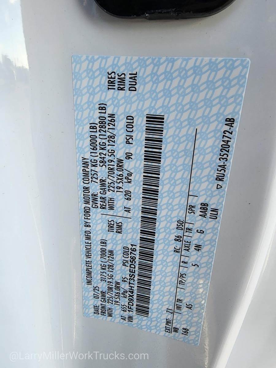 Options: 18B 41H 425 43C 44G 473 51D 572 61J 650A 67A 68L 86M 872 96V 99T AS B3Z TGK X4N Z1,TIRES: 225/70RX19.5G BSW TRACTION (TGK) -inc: 4 traction tires on the rear and 2 traction tires on the front Not recommended for over the road applications; could incur irregular front tire wear and/or NVH,OXFORD WHITE,ENGINE: 6.7L 4V OHV POWER STROKE V8 TURBO DIESEL B20 -inc: Operator Commanded Regeneration (OCR) Diesel Exhaust Fluid (DEF) tank and manual push-button engine-exhaust braking 4.10 Axle Ratio 250 Amp Alternator Dual 68 AH/65 AGM Battery,SNOW PLOW PREP PACKAGE -inc: pre-selected springs (see order guide supplemental reference for springs/FGAWR of specific vehicle configurations) Note 1: Restrictions apply; see supplemental reference or body builders layout book for details Note 2: Also allows for the attachment of a winch Note 3: Highly recommended to add (86M) dual battery on 7.3L gas engine Adding (67B) 410 amp dual alternators for diesel engine is highly recommended for max power output,120V/400W OUTLET -inc: 1 in-dash mounted outlet,PLATFORM RUNNING BOARDS,MEDIUM DARK SLATE HD VINYL 40/20/40 SPLIT BENCH SEAT -inc: center armrest cupholder storage 2-way adjustable driver/passenger headrests and driver's side manual lumbar,6-TON HYDRAULIC JACK,REAR VIEW CAMERA & PREP KIT -inc: Pre-installed content includes cab wiring and frame wiring to the rear most cross member Upfitters kit includes camera w/mounting bracket 20' jumper wire and camera mounting/aiming instructions,SPARE TIRE & WHEEL DELETE,DUAL 68 AH/65 AGM BATTERY,ORDER CODE 650A,LIMITED SLIP W/4.10 AXLE RATIO,ENGINE BLOCK HEATER,350 AMP DUAL ALTERNATORS -inc: 190 Amp + 160 Amp,TRANSMISSION: TORQSHIFT 10-SPEED AUTOMATIC -inc: SelectShift selectable drive modes: normal tow/haul eco slippery roads and off-road and transmission power take-off provision (STD),XL CHROME PACKAGE -inc: Privacy Glass w/Power Sliding Rear Glass Halogen Fog Lamps Bright Grille Remote Start Chrome Front Bumper Rear Window Defroster,GVWR: 16 000 LB PAYLOAD PACKAGE,Four Wheel Drive,Power Steering,Dual Rear Wheels,ABS,4-Wheel Disc Brakes,Brake Assist,Steel Wheels,Tires - Front All-Season,Tires - Rear All-Season,Tow Hooks,Heated Mirrors,Power Mirror(s),Integrated Turn Signal Mirrors,Intermittent Wipers,Variable Speed Intermittent Wipers,Daytime Running Lights,Automatic Headlights,AM/FM Stereo,Steering Wheel Audio Controls,Auxiliary Audio Input,Pass-Through Rear Seat,Rear Bench Seat,Adjustable Steering Wheel,WiFi Hotspot,Keyless Entry,Cruise Control,A/C,Vinyl Seats,Split Bench Seat,Driver Adjustable Lumbar,Passenger Vanity Mirror,Security System,Immobilizer,Traction Control,Front Side Air Bag,Lane Departure Warning,Front Collision Mitigation,Driver Air Bag,Passenger Air Bag,Passenger Air Bag On/Off Switch,Front Head Air Bag,Rear Head Air Bag