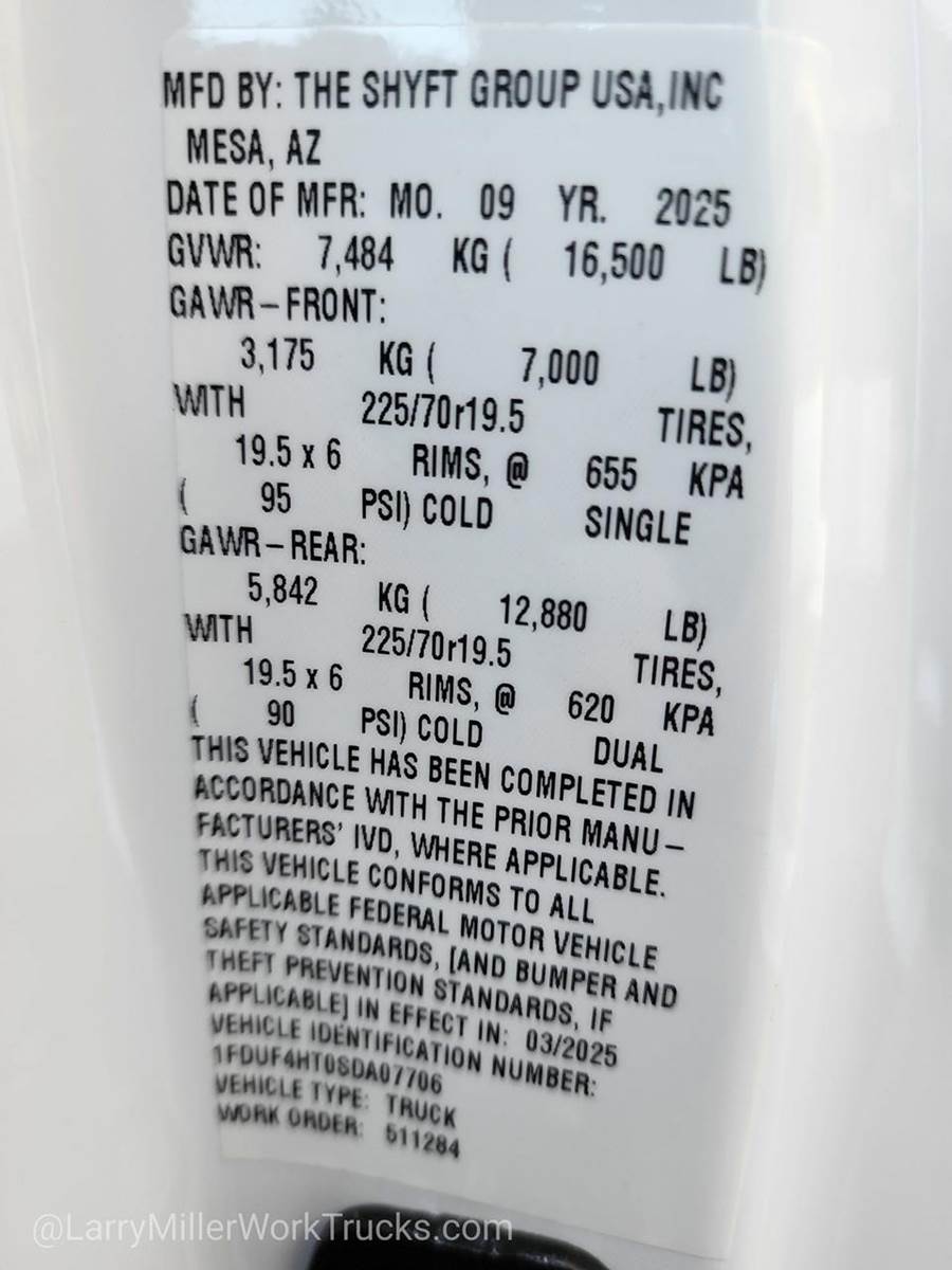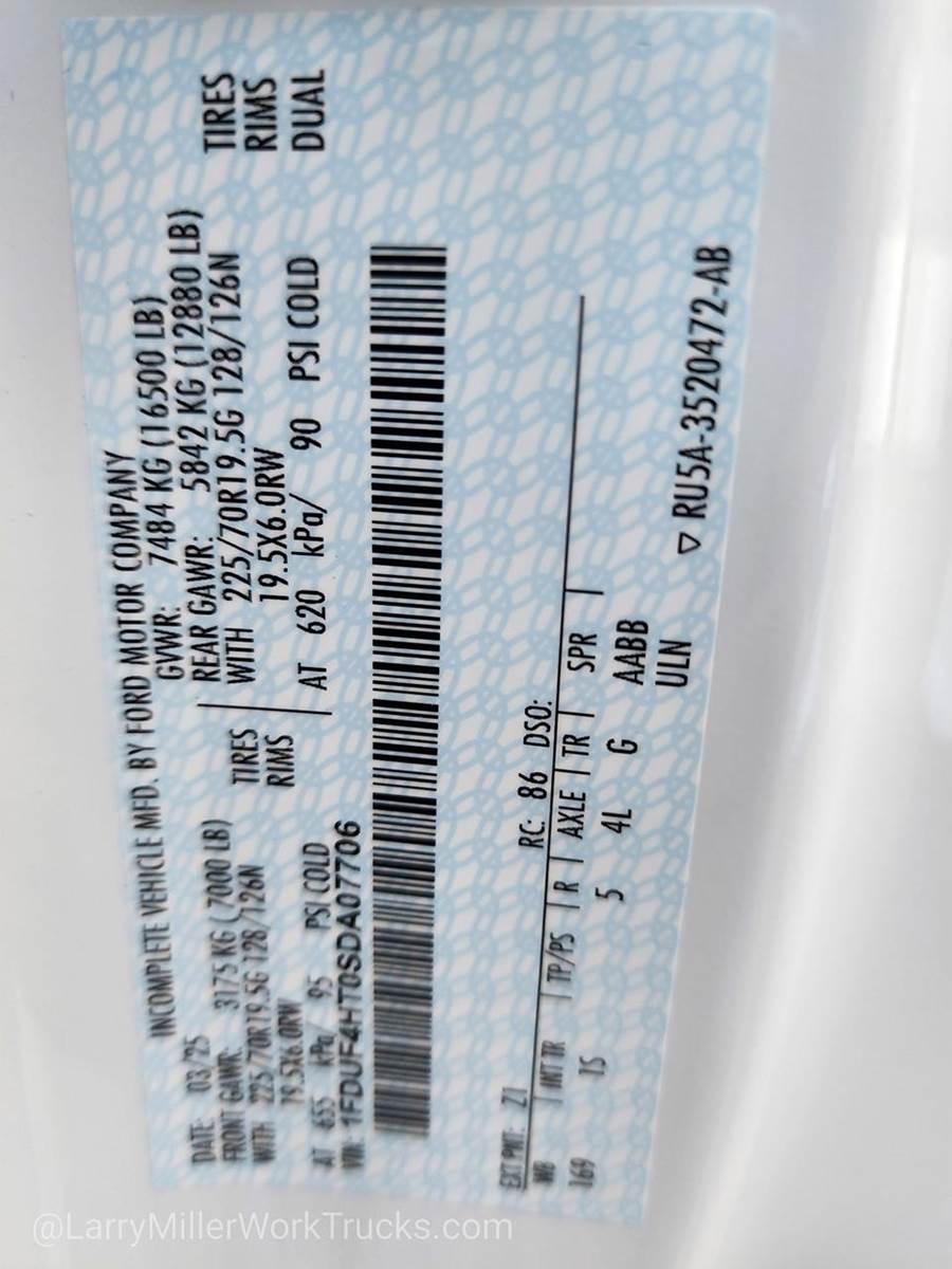 Options: 1 153 1S 41H 425 44G 473 51D 52B 535 572 59H 61J 67A 86M 872 96V 99T TGJ X4L Z1,HIGH CAPACITY TRAILER TOW PACKAGE -inc: trailer brake wiring kit Increases GCW from 32 500 lbs to 35 000 lbs Note: Salesperson's Portfolio or Trailer Towing Guide should be consulted for specific trailer towing or camper limits and corresponding required equipment axle ratios and model availability See Supplemental Reference for vehicle height consideration,MEDIUM DARK SLATE CLOTH 40/20/40 SPLIT BENCH SEAT -inc: center armrest cupholder storage and driver's side manual lumbar,REAR VIEW CAMERA & PREP KIT -inc: Pre-installed content includes cab wiring and frame wiring to the rear most cross member Upfitters kit includes camera w/mounting bracket 20' jumper wire and camera mounting/aiming instructions,350 AMP DUAL ALTERNATORS -inc: 190 Amp + 160 Amp,ENGINE BLOCK HEATER,OXFORD WHITE,TRANSMISSION: TORQSHIFT 10-SPEED AUTOMATIC -inc: SelectShift selectable drive modes: normal tow/haul eco slippery roads and off-road and transmission power take-off provision (STD),ENGINE: 6.7L 4V OHV POWER STROKE V8 TURBO DIESEL B20 -inc: Operator Commanded Regeneration (OCR) Diesel Exhaust Fluid (DEF) tank and manual push-button engine-exhaust braking 4.10 Axle Ratio 250 Amp Alternator Dual 68 AH/65 AGM Battery,6-TON HYDRAULIC JACK,LIMITED SLIP W/4.30 AXLE RATIO,SPARE TIRE & WHEEL DELETE,TRAILER BRAKE CONTROLLER,DUAL 68 AH/65 AGM BATTERY,SNOW PLOW PREP PACKAGE -inc: pre-selected springs (see order guide supplemental reference for springs/FGAWR of specific vehicle configurations) Note 1: Restrictions apply; see supplemental reference or body builders layout book for details Note 2: Also allows for the attachment of a winch Note 3: Highly recommended to add (86M) dual battery on 7.3L gas engine Adding (67B) 410 amp dual alternators for diesel engine is highly recommended for max power output,FRONT LICENSE PLATE BRACKET,XL CHROME PACKAGE -inc: Halogen Fog Lamps Bright Grille Remote Start Chrome Front Bumper,TIRES: 225/70RX19.5G BSW A/P (STD),CENTER HIGH-MOUNTED STOP LAMP (CHMSL),Four Wheel Drive,Power Steering,Dual Rear Wheels,ABS,4-Wheel Disc Brakes,Brake Assist,Steel Wheels,Tires - Front All-Season,Tires - Rear All-Season,Tow Hooks,Heated Mirrors,Power Mirror(s),Integrated Turn Signal Mirrors,Intermittent Wipers,Variable Speed Intermittent Wipers,Daytime Running Lights,Automatic Headlights,AM/FM Stereo,MP3 Capability,MP3 Capability,Steering Wheel Audio Controls,Bluetooth Connection,Telematics,Auxiliary Audio Input,Smart Device Integration,Requires Subscription,Bluetooth Connection,Adjustable Steering Wheel,Trip Computer,WiFi Hotspot,Keyless Entry,Power Door Locks,Cruise Control,A/C,Split Bench Seat,Driver Adjustable Lumbar,Passenger Vanity Mirror,Smart Device Integration,Requires Subscription,Smart Device Integration,Power Windows,Power Door Locks,Trip Computer,Security System,Immobilizer,Traction Control,Front Side Air Bag,Telematics,Requires Subscription,Lane Departure Warning,Front Collision Mitigation,Driver Air Bag,Passenger Air Bag,Passenger Air Bag On/Off Switch,Front Head Air Bag