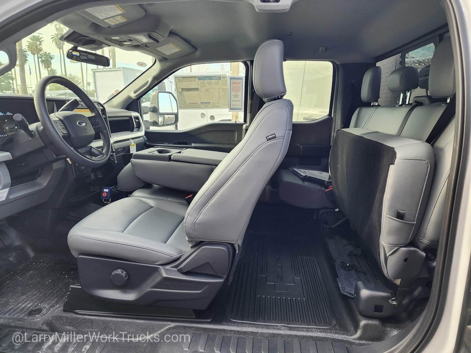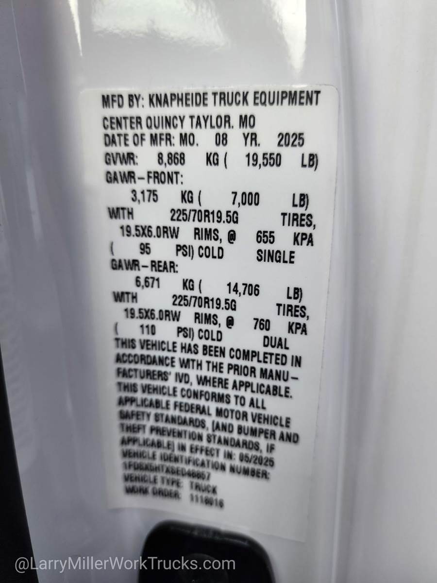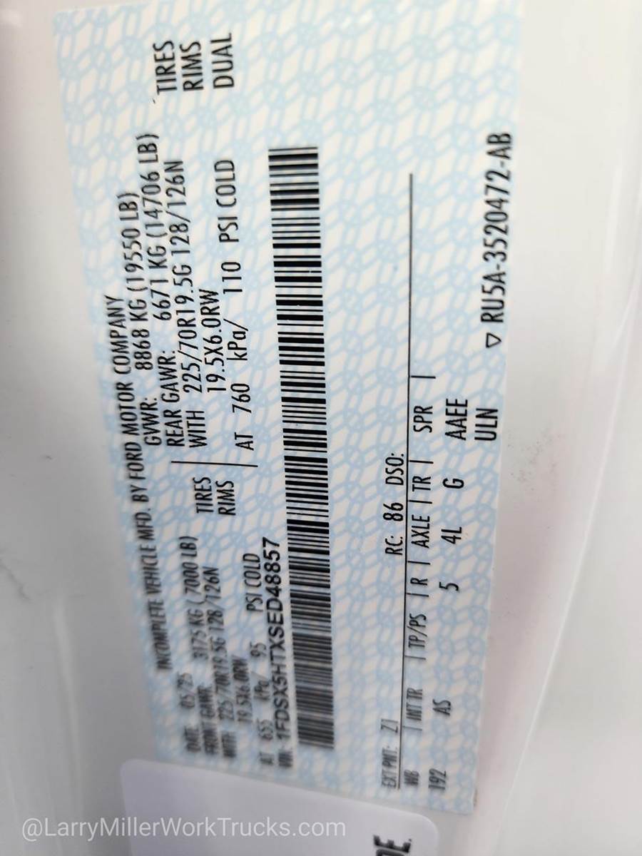 Options: 153 18B 41A 41H 425 43C 44G 473 51D 52B 535 572 59H 61J 65Z 660A 67B 68H 86M 872 96V 99T AS TGK X4L Z1,REAR VIEW CAMERA & PREP KIT -inc: Pre-installed content includes cab wiring and frame wiring to the rear most cross member Upfitters kit includes camera w/mounting bracket 20' jumper wire and camera mounting/aiming instructions,410 AMP DUAL ALTERNATORS -inc: 250 Amp + 160 Amp,RAPID-HEAT SUPPLEMENTAL CAB HEATER -inc: 410 Amp Dual Alternators 250 Amp + 160 Amp,GVWR: 19 550 LB PAYLOAD PLUS UPGRADE PACKAGE 2 -inc: upgraded frame upgraded rear-axle and low deflection/high capacity rear springs Increases max RGAWR to 14 706 lbs Note: See Order Guide Supplemental Reference for further details on GVWR,HIGH CAPACITY TRAILER TOW PACKAGE -inc: trailer brake wiring kit Increases GCW from 32 500 lbs to 40 000 lbs Note: Salesperson's Portfolio or Trailer Towing Guide should be consulted for specific trailer towing or camper limits and corresponding required equipment axle ratios and model availability See Supplemental Reference for vehicle height consideration,120V/400W OUTLET -inc: 1 in-dash mounted outlet,ENGINE BLOCK HEATER,OXFORD WHITE,XL CHROME PACKAGE -inc: Privacy Glass w/Power Sliding Rear Glass Halogen Fog Lamps Bright Grille Remote Start Chrome Front Bumper Rear Window Defroster,TRANSMISSION: TORQSHIFT 10-SPEED AUTOMATIC -inc: SelectShift selectable drive modes: normal tow/haul eco slippery roads and off-road and transmission power take-off provision (STD),ENGINE: 6.7L 4V OHV POWER STROKE V8 TURBO DIESEL B20 -inc: Operator Commanded Regeneration (OCR) Diesel Exhaust Fluid (DEF) tank and manual push-button engine-exhaust braking 4.10 Axle Ratio 250 Amp Alternator Dual 68 AH/65 AGM Battery,PLATFORM RUNNING BOARDS,6-TON HYDRAULIC JACK,LIMITED SLIP W/4.30 AXLE RATIO,SPARE TIRE & WHEEL DELETE,TRAILER BRAKE CONTROLLER,DUAL 68 AH/65 AGM BATTERY,SNOW PLOW PREP PACKAGE -inc: pre-selected springs (see order guide supplemental reference for springs/FGAWR of specific vehicle configurations) Note 1: Restrictions apply; see supplemental reference or body builders layout book for details Note 2: Also allows for the attachment of a winch Note 3: Highly recommended to add (86M) dual battery on 7.3L gas engine Adding (67B) 410 amp dual alternators for diesel engine is highly recommended for max power output,FRONT LICENSE PLATE BRACKET,CENTER HIGH-MOUNTED STOP LAMP (CHMSL),TIRES: 225/70RX19.5G BSW TRACTION (TGK) -inc: 4 traction tires on the rear and 2 traction tires on the front Not recommended for over the road applications; could incur irregular front tire wear and/or NVH,ORDER CODE 660A,MEDIUM DARK SLATE HD VINYL 40/20/40 SPLIT BENCH SEAT -inc: center armrest cupholder storage 2-way adjustable driver/passenger headrests and driver's side manual lumbar,Four Wheel Drive,Power Steering,Dual Rear Wheels,ABS,4-Wheel Disc Brakes,Brake Assist,Steel Wheels,Tires - Front All-Season,Tires - Rear All-Season,Tow Hooks,Heated Mirrors,Power Mirror(s),Integrated Turn Signal Mirrors,Intermittent Wipers,Variable Speed Intermittent Wipers,Daytime Running Lights,Automatic Headlights,AM/FM Stereo,Steering Wheel Audio Controls,Auxiliary Audio Input,Pass-Through Rear Seat,Rear Bench Seat,Adjustable Steering Wheel,WiFi Hotspot,Keyless Entry,Cruise Control,A/C,Vinyl Seats,Split Bench Seat,Driver Adjustable Lumbar,Passenger Vanity Mirror,Security System,Immobilizer,Traction Control,Front Side Air Bag,Lane Departure Warning,Front Collision Mitigation,Driver Air Bag,Passenger Air Bag,Passenger Air Bag On/Off Switch,Front Head Air Bag,Rear Head Air Bag