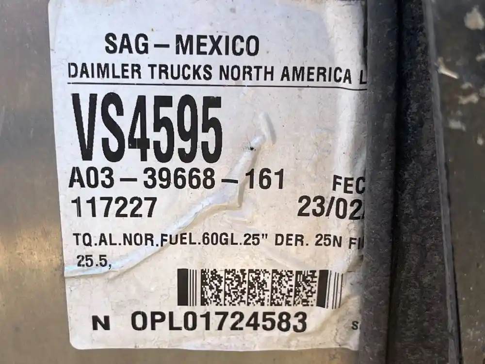 (Used) 2025 Freightliner Cascadia 126, FUEL TANK- Part Number: A03-39668–161, Side: Passenger Right Side, Material: Aluminum, Capacity: 60 Gallons, Shape: Round, Dimension: L=29”, D=25”, Reference images for condition, For more information about this item, give us a call. We ship Worldwide! (CRG HEAVY TRUCK PARTS) 929 W PULASKI HWY, ELKTON, MD 21921, Capacity: 60 Gallons, Dimensions: L=29”, D=25”, Material: Aluminum, Fuel Tank Shape: Round