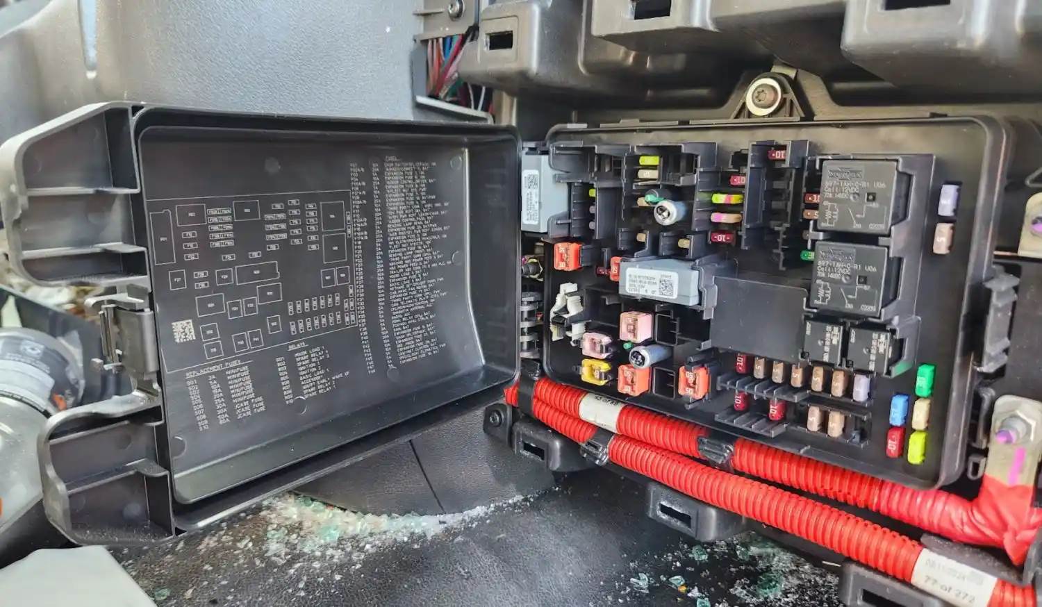 (Used) 2025 Freightliner M2 106, FUSE BOX (2)- Side: Passenger Right Side, Location: Interior Cab, Color: Black, Material: Plastic, Reference images for condition, For more information about this item, give us a call. We ship Worldwide! (CRG HEAVY TRUCK PARTS) 929 W PULASKI HWY ELKTON, MD 21921, Engine Make: Detroit, Engine Model: DD8
