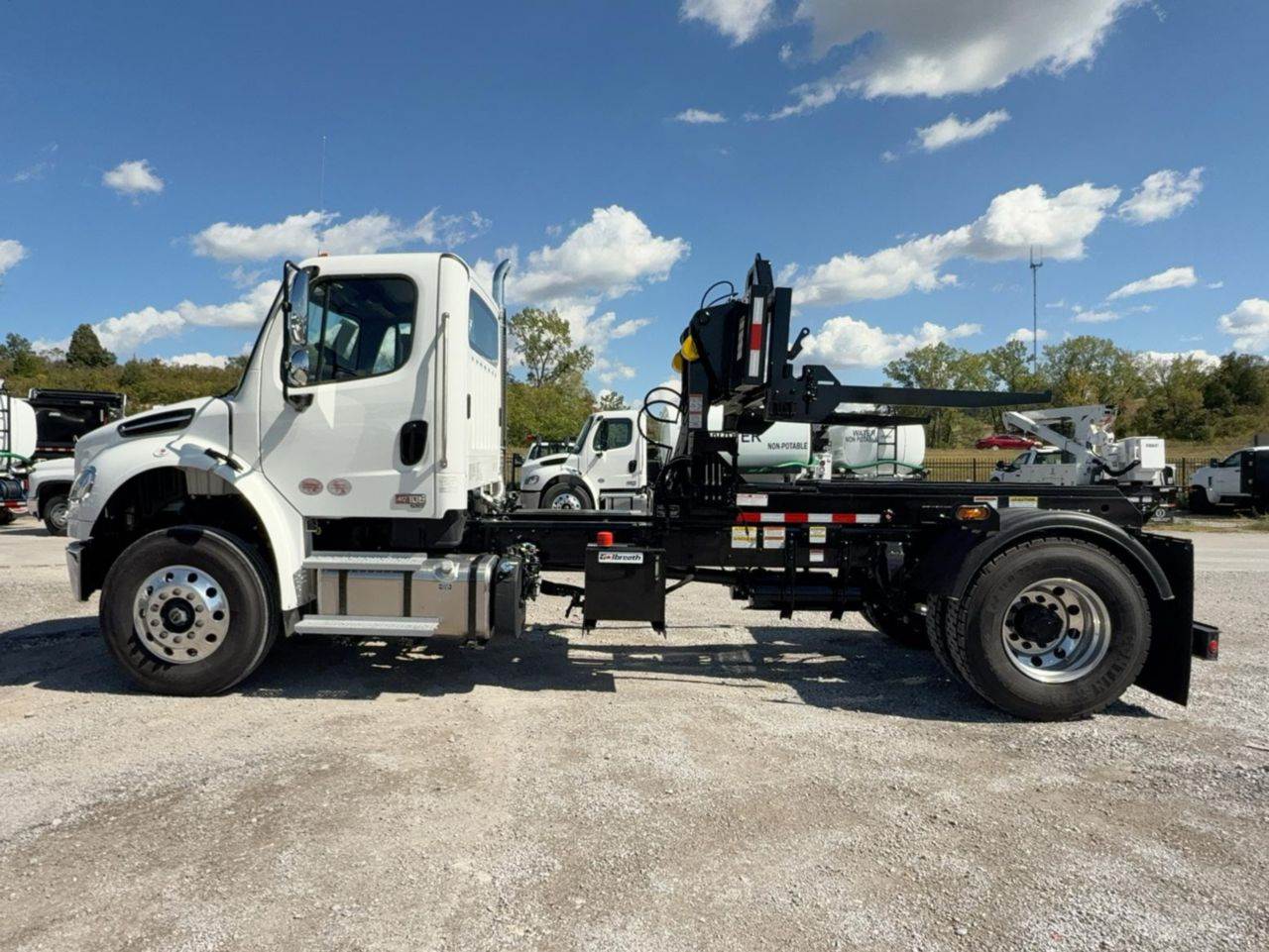 Owning a Galbreath SLCH-93 container handler on a Freightliner M2106 4×2 gives you a purpose-built solution for efficient container handling in tight, urban, and yard-focused operations. It’s designed for consistent pick-and-place work with refuse containers, recycling boxes, and specialty containers, offering smooth, controlled mast operation without the weight, cost, or complexity of a larger Class 8 setup. The M2106 keeps operating costs, fuel consumption, and maintenance manageable, while its shorter wheelbase and lighter GVWR make it easier to maneuver in transfer stations, alleys, and confined sites. The payoff is dependable daily productivity for waste, recycling, and municipal fleets that need precision and uptime more than raw hauling capacity.