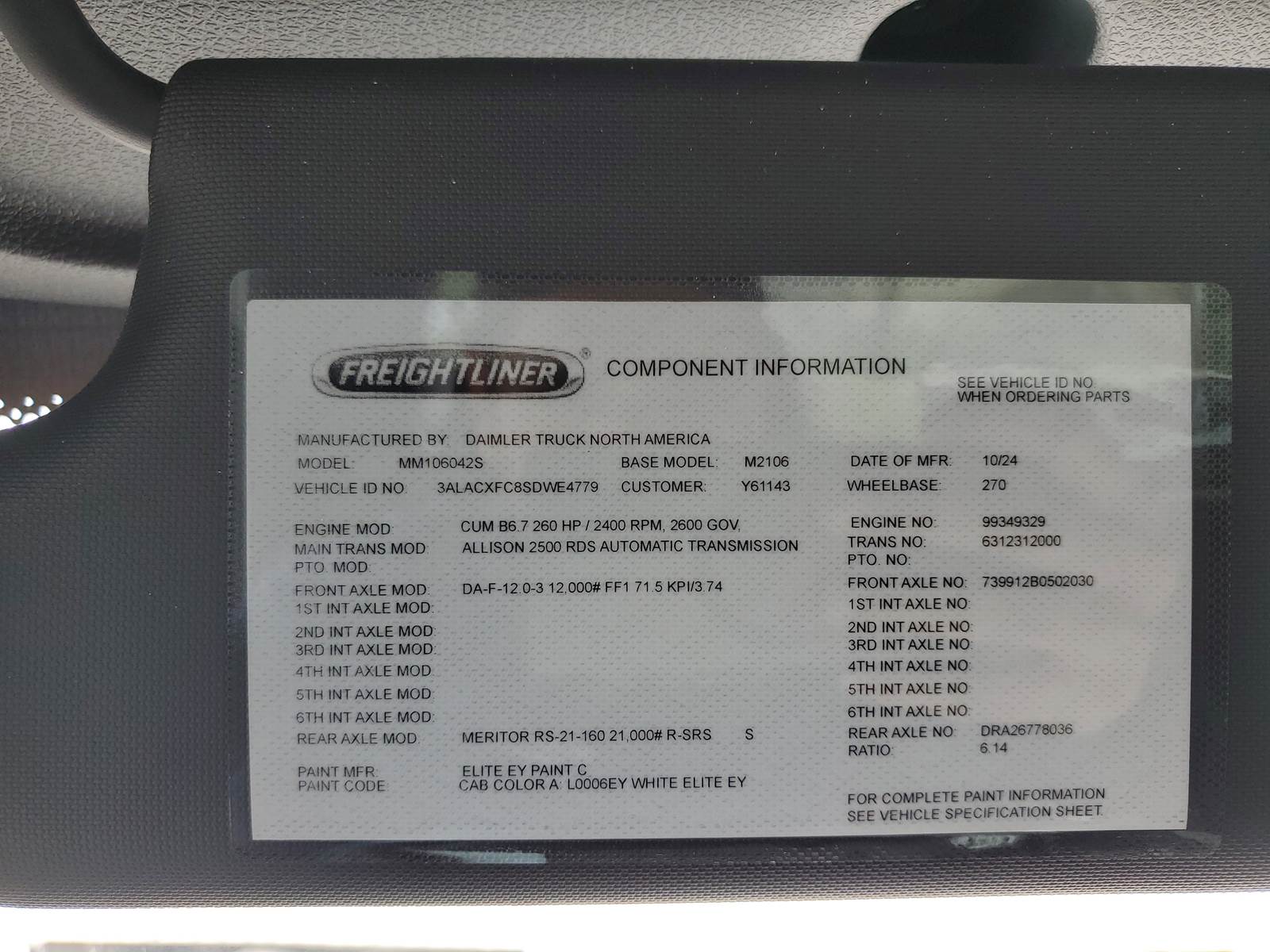 *2025 Freightliner M2 106 Plus (M2106) -- Cummins ISB 6.7 -- Allison 2500 RDS --- 270 WBFreightliner of Miami --- Hialeah Gardens, FL**Powertrain** Cummins ISB 6.7L Diesel --- 260 HP / 660 lb-ft* Allison 2500 RDS Automatic Transmission* Dual 50-gal Fuel Tanks (100 gal total)*Axles / Driveline / Dimensions** Front Suspension: 12,000 lb* Rear Suspension: 21,000 lb --- Single Rear Axle --- 6.14 Ratio* 270 Wheelbase*Cab / Interior** White exterior* Rugged Black Cloth seats* Gray & Carbon Vinyl interior* Seats 3 --- High-Back Air-Suspension Driver Seat* 2-Man Toolbox Passenger Bench* Power windows* Heated power mirrors*Technology & Comfort** Electric/Digital dash * Remote keyless entry* World Tuner AM/FM/WB radio* Bluetooth* USB & AUX inputs* Driver/Passenger speakers* HVAC (A/C, heat, defroster) * 12V outlet* Premium LED cab lighting*Additional Features** WABCO 4S/4M ABS with Traction Control* Neutral at Stop* Air cab mounting* Ignition-controlled electric dump switch for air suspension* Phillips-Temro 1000W / 115V block heater* QuickFit Electrical System