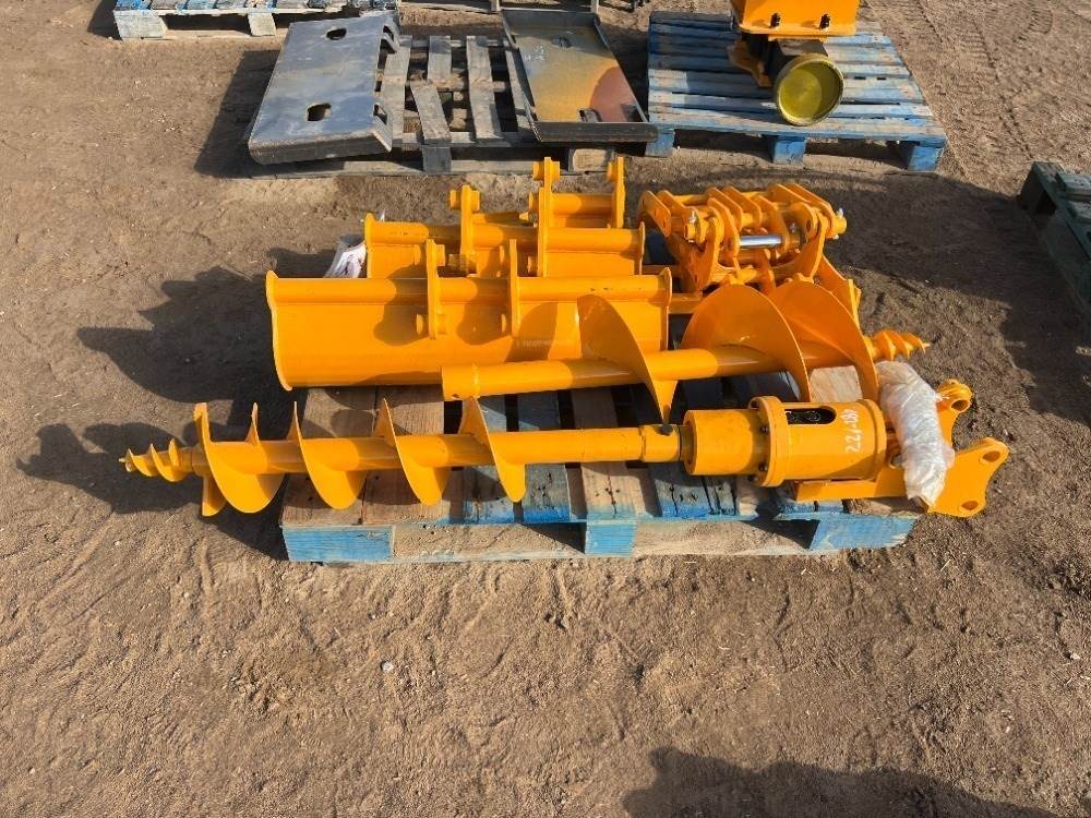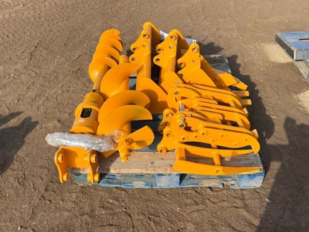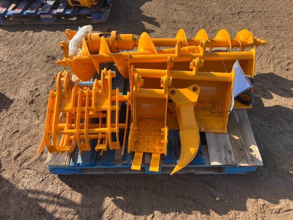 2025 GIYI ATTACHMENT SET, fits mini excavator, 6" GP BUCKET, 12" GP BUCKET, 18" GP BUCKET , 24" RAKE ATTACHMENT, GRAPPLE ATTACHMENT, AUGER ATTACHMENT, 6" AUGER BIT, 12" AUGER BIT --(LOCATED IN MADERA, CA)--