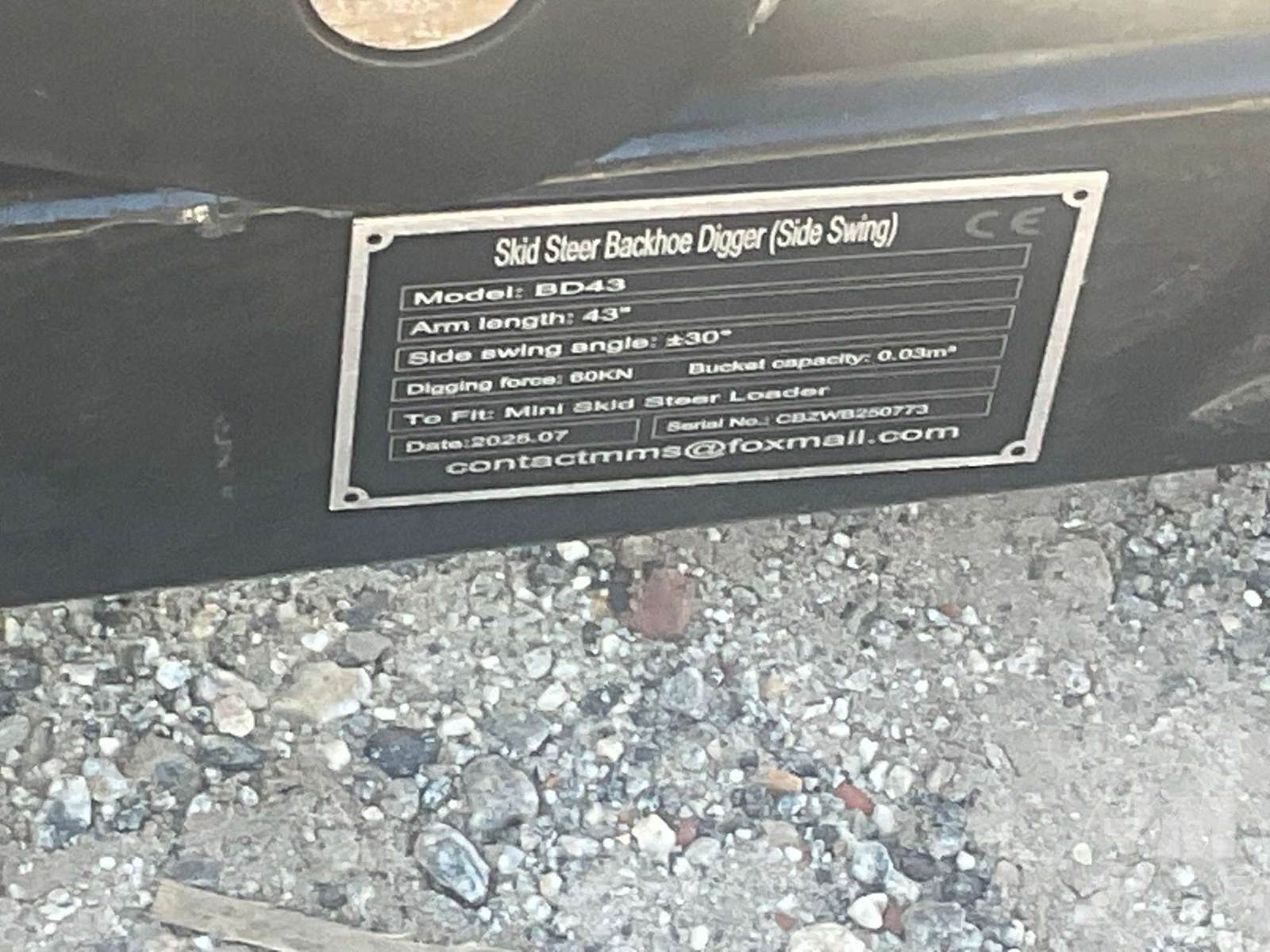 UNUSED 43†ARM BACKHOE, MINI SKID STEER MOUNT, 12" TOOTH BUCKET