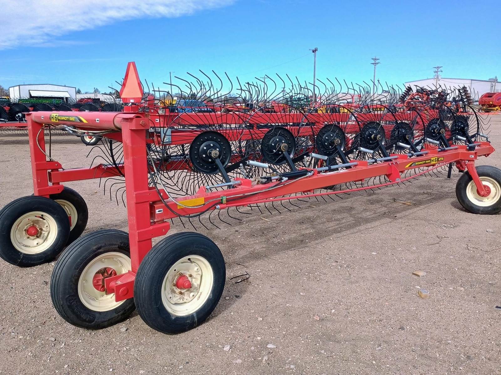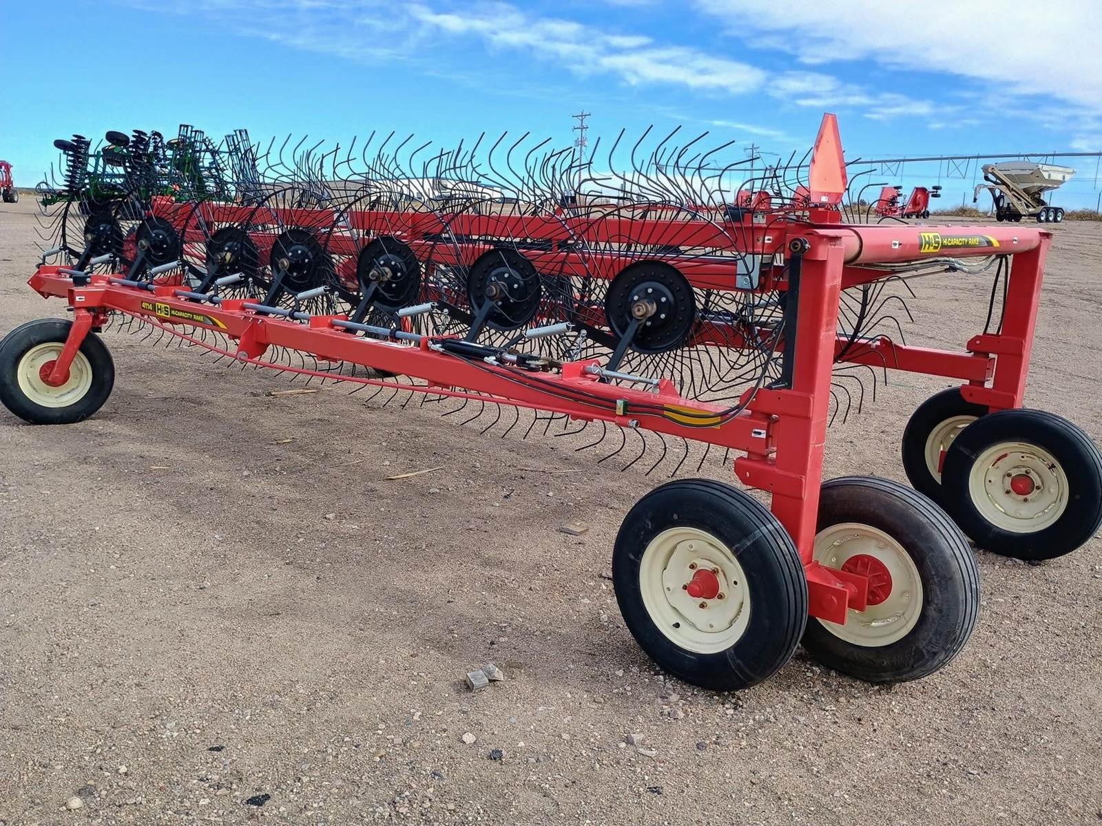2025 H & S HC4114, 14 WHEEL HIGH CAPACITY BI-FOLD RAKE, 55" WHEELS, NO WIND PANELS, UP TO 28' RAKING WIDTH, 38" TO 58" WINDROW WIDTH ADJUSTMENT, HYDRAULIC FOLD, HYDRAULIC RAISE AND LOWER OF WHEELS, OFFSET TANDOM REAR TRANSPORT WHEELS, ADJUSTABLE BRAKE BAND TO PREVENT WHEEL SPINNING IN ROUGH GROUND. $25,700.00