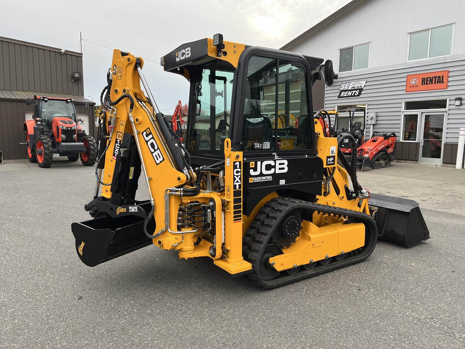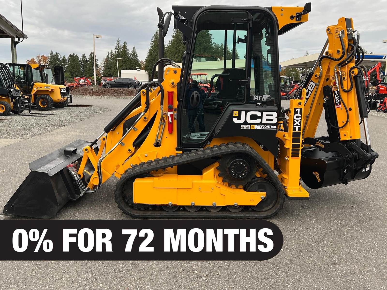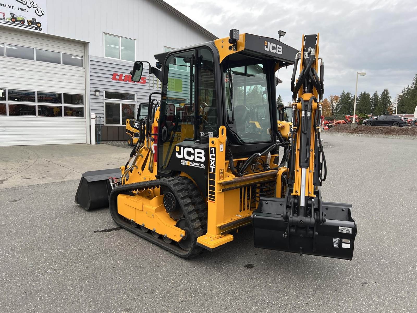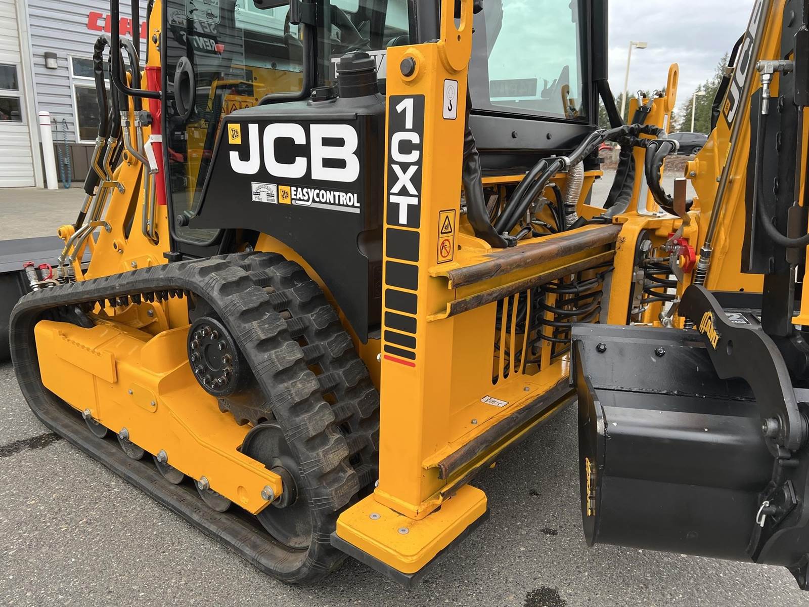 2025 JCB 1CXT Skidsteer Loader Backhoe - T4F Perkins diesel engine, 12.8" wide general purpose tracks, deluxe cab with heat and air condition, suspension seat, seat-mounted joystick controls for both loader and excavator, SAE/ISO changeover, 8' extending dipper, side-shift excavator end, 36" AMI backhoe bucket and hydraulic thumb, loader quick attach and loader float. Priced with hydraulic thumb and bucket