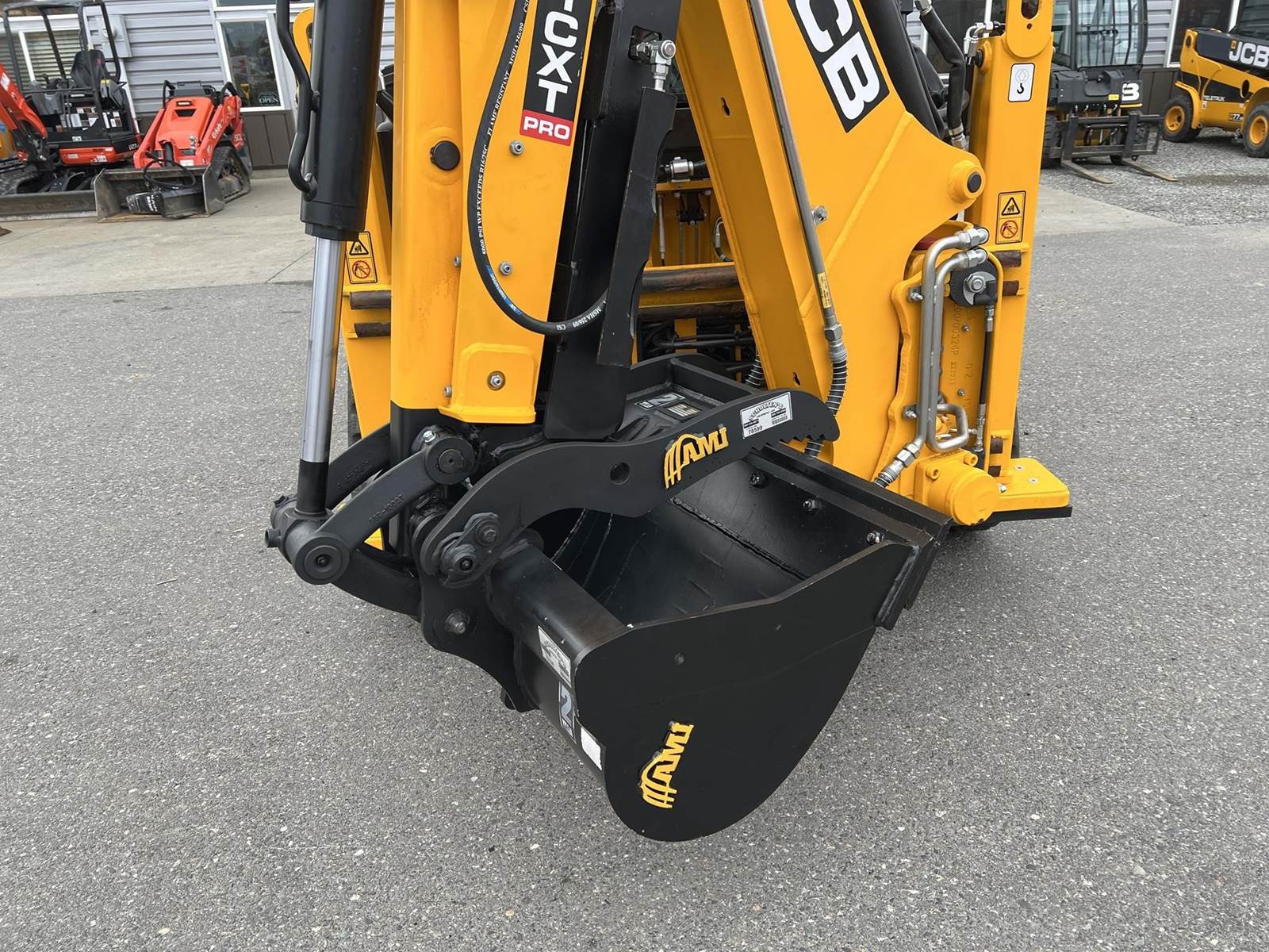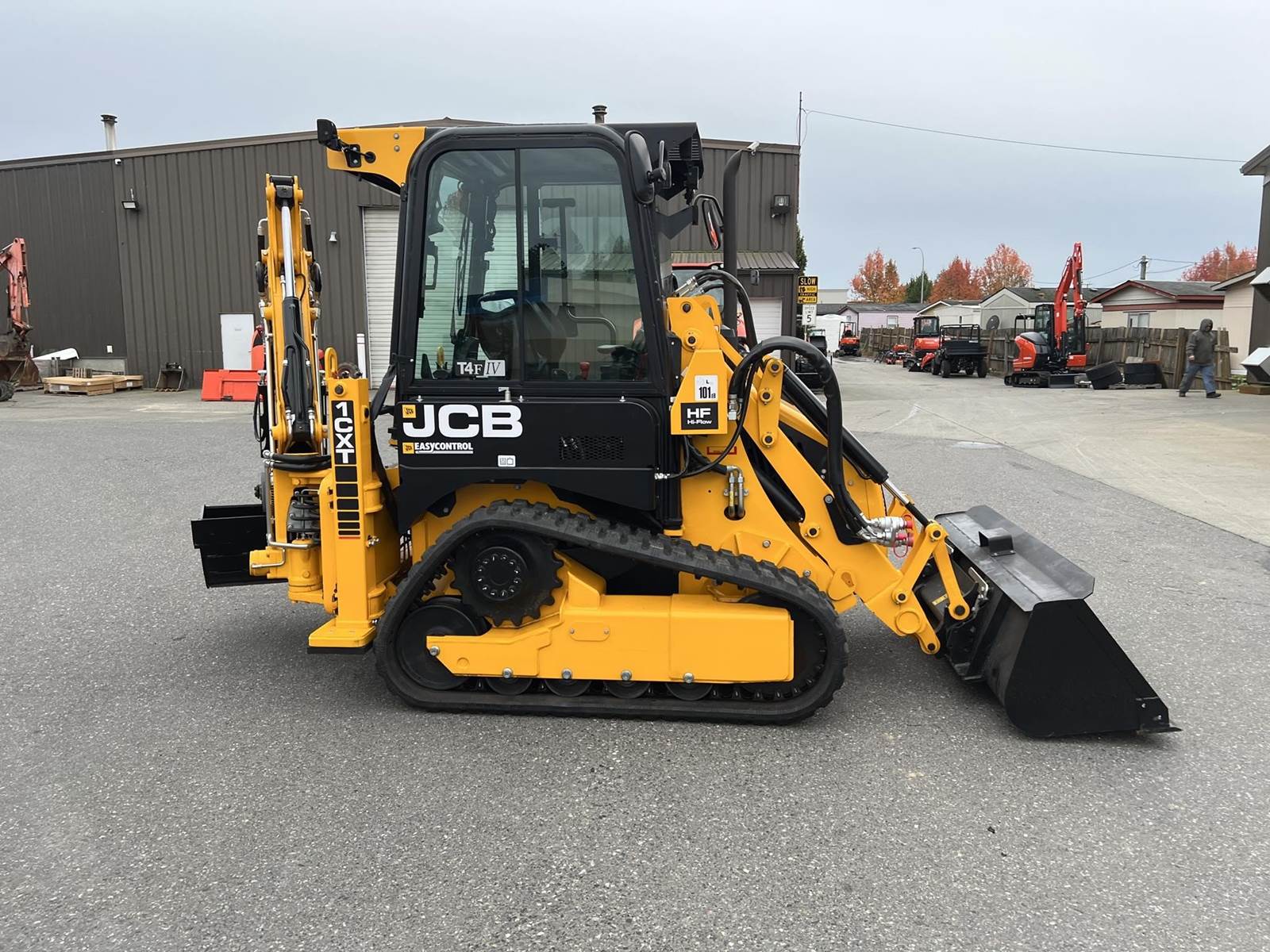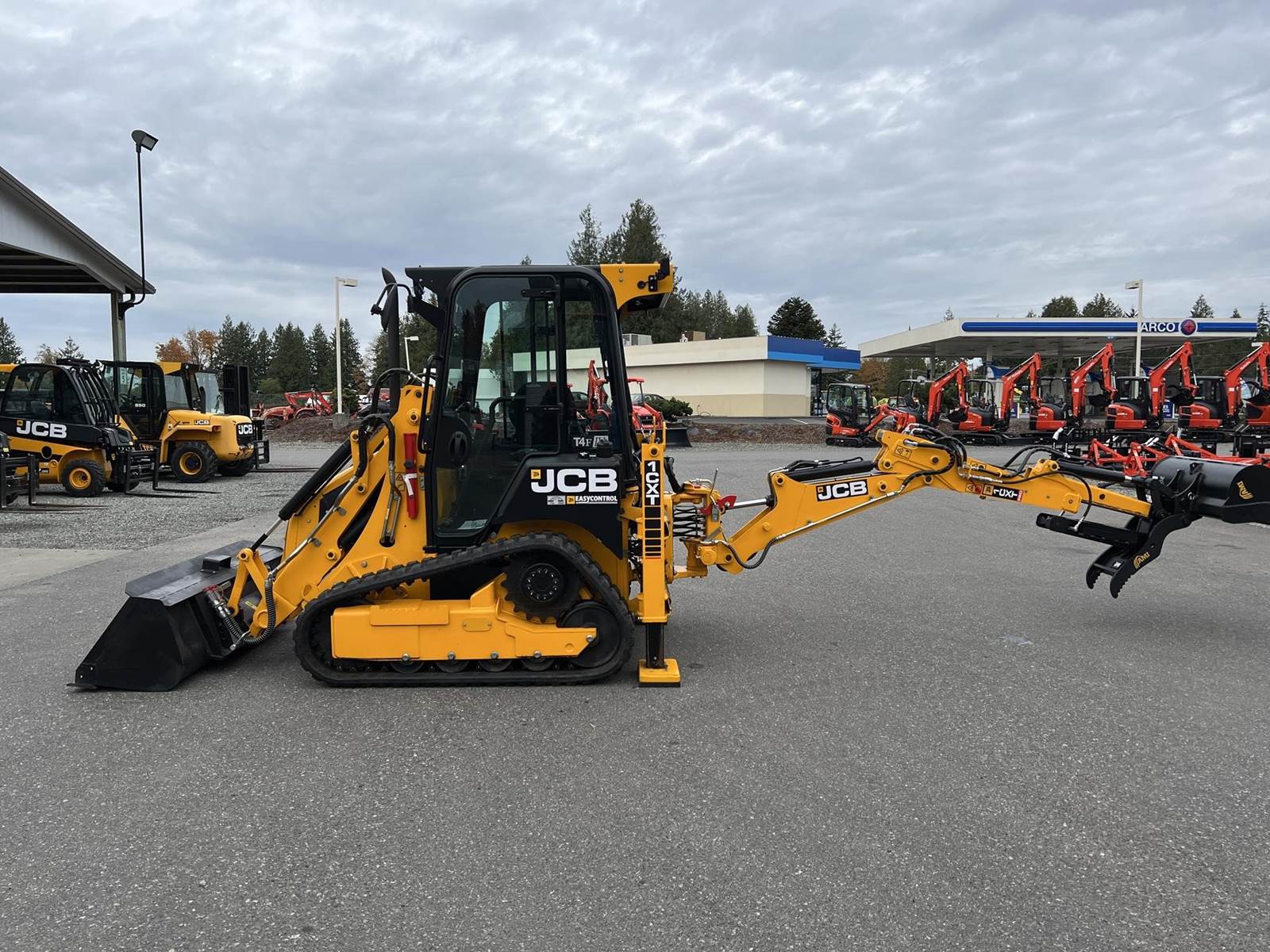 2025 JCB 1CXT Skidsteer Loader Backhoe - T4F Perkins diesel engine, 12.8" wide general purpose tracks, deluxe cab with heat and air condition, suspension seat, seat-mounted joystick controls for both loader and excavator, SAE/ISO changeover, 8' extending dipper, side-shift excavator end, 36" AMI backhoe bucket and hydraulic thumb, loader quick attach and loader float. Priced with hydraulic thumb and bucket