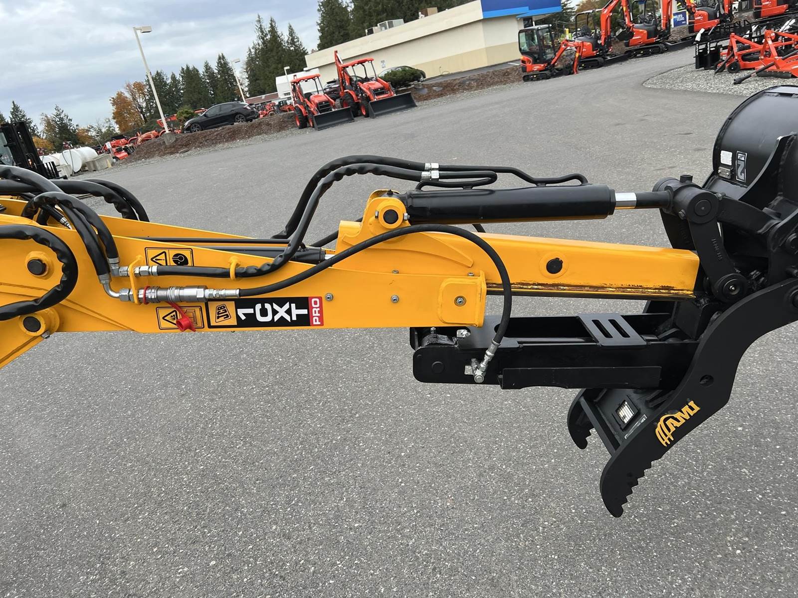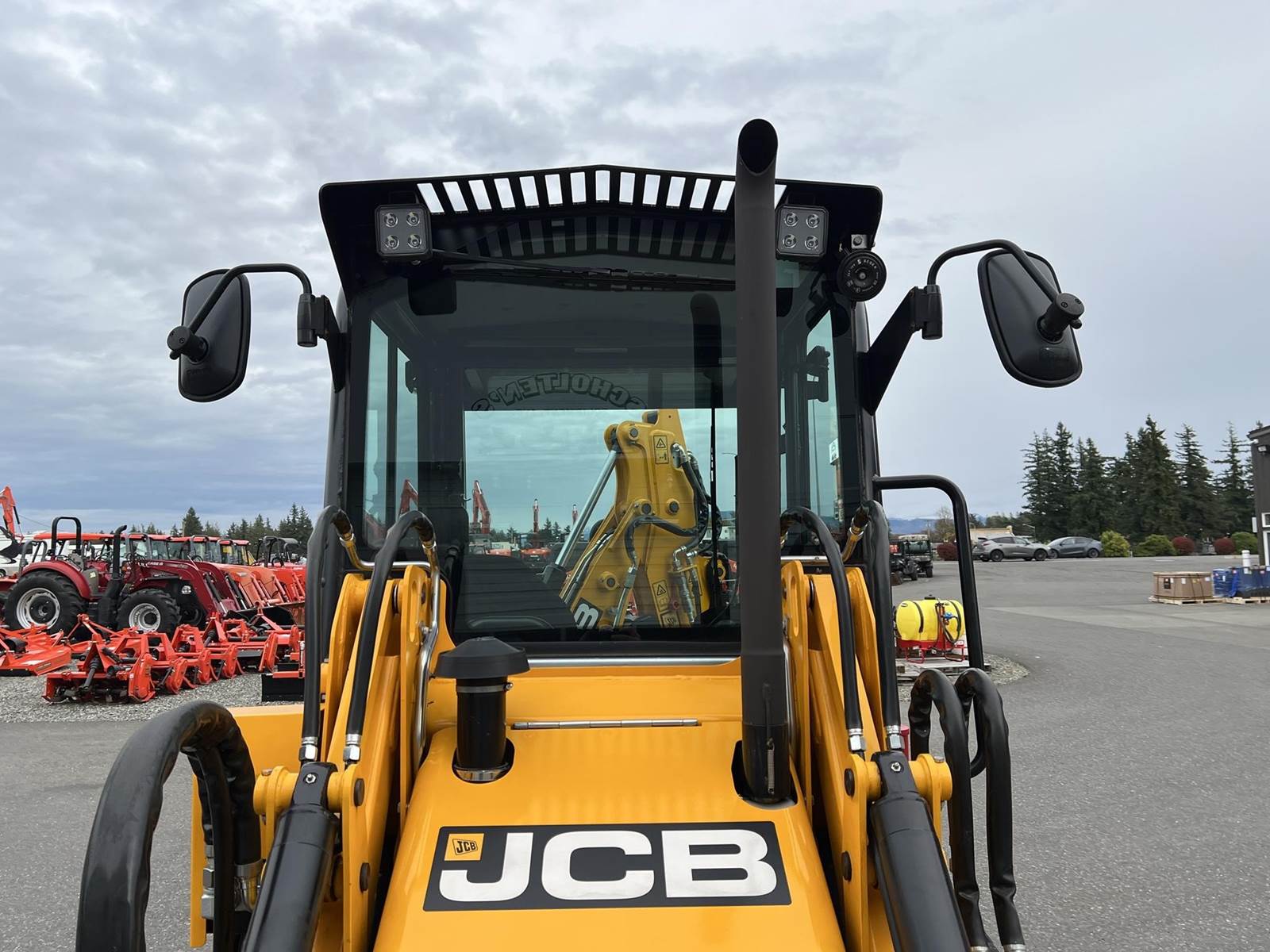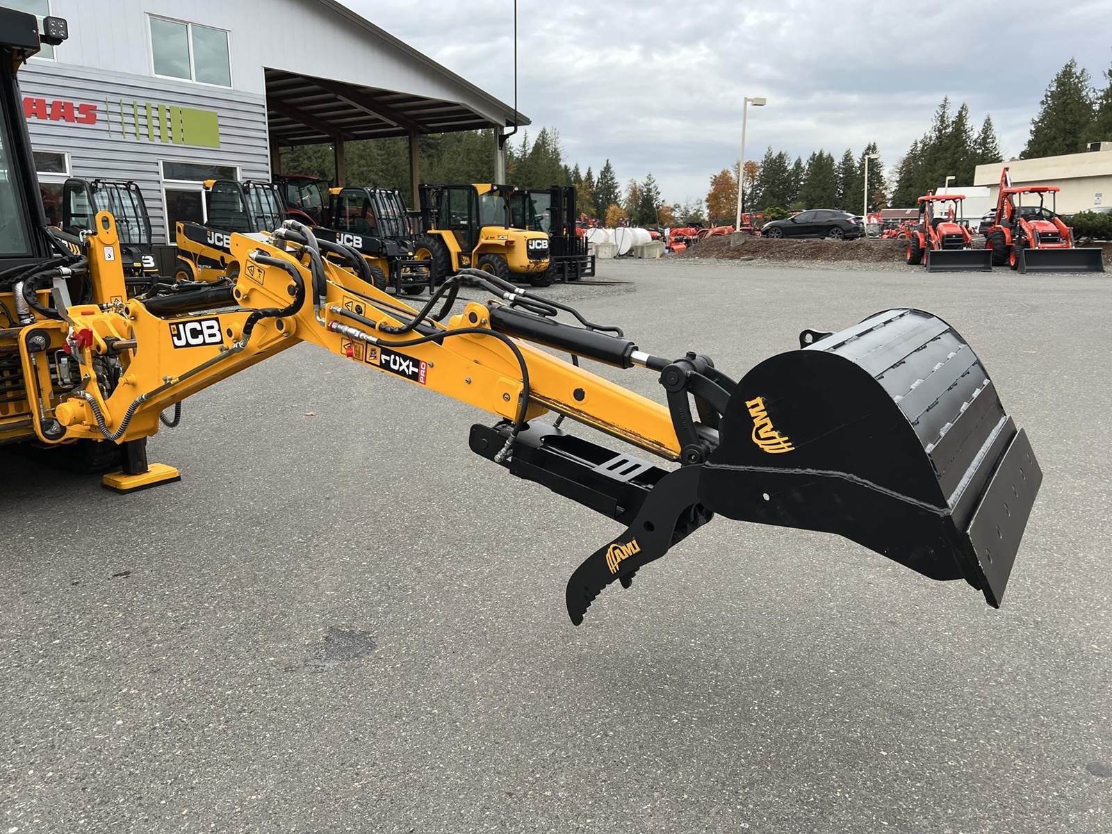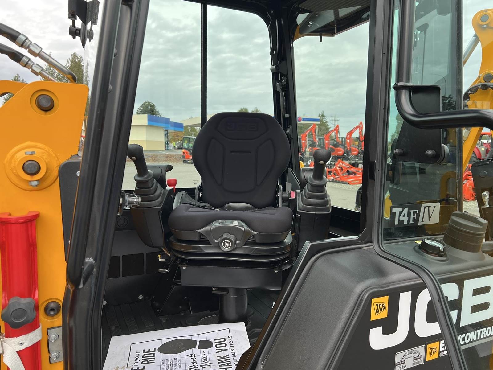 2025 JCB 1CXT Skidsteer Loader Backhoe - T4F Perkins diesel engine, 12.8" wide general purpose tracks, deluxe cab with heat and air condition, suspension seat, seat-mounted joystick controls for both loader and excavator, SAE/ISO changeover, 8' extending dipper, side-shift excavator end, 36" AMI backhoe bucket and hydraulic thumb, loader quick attach and loader float. Priced with hydraulic thumb and bucket
