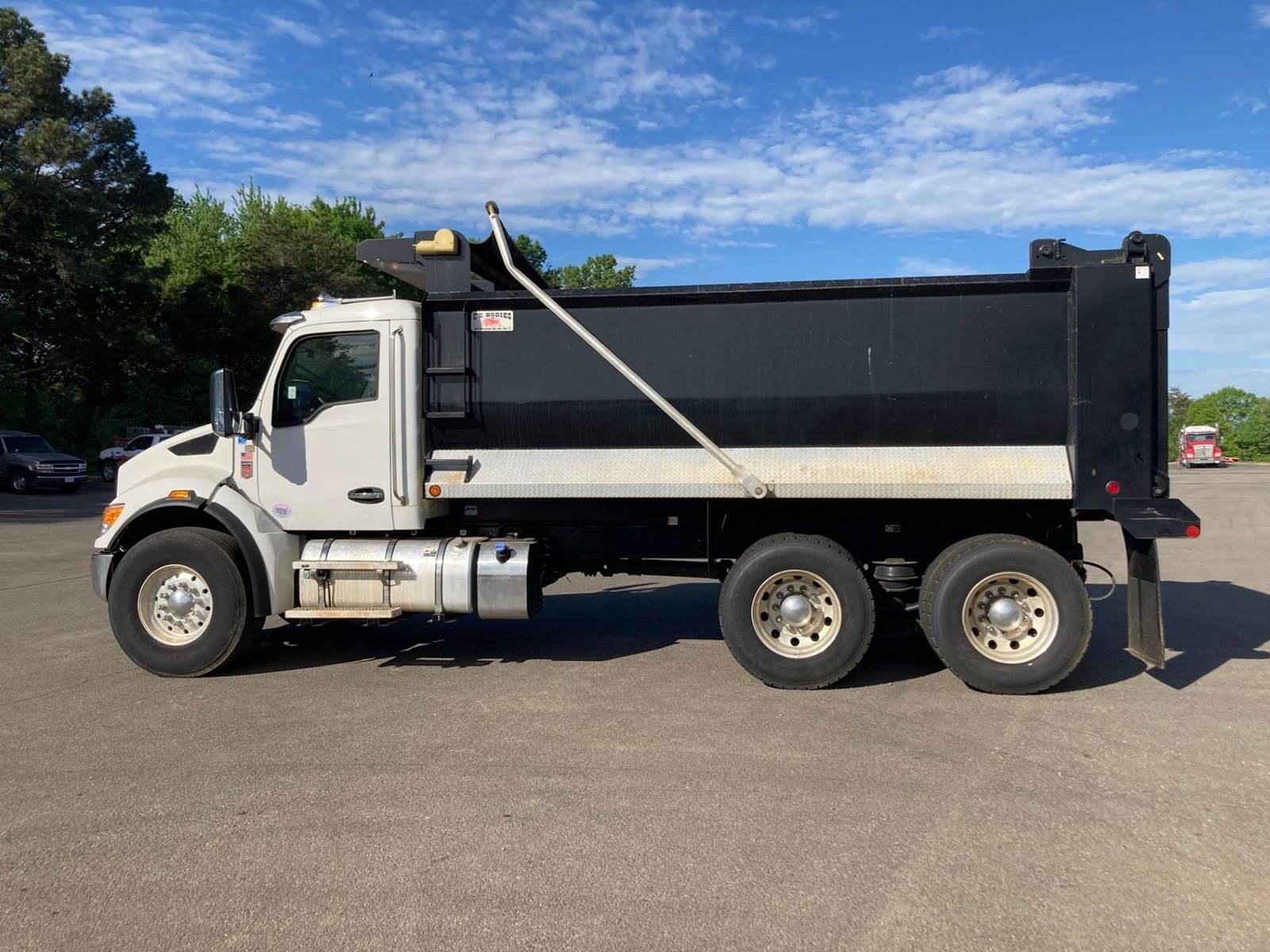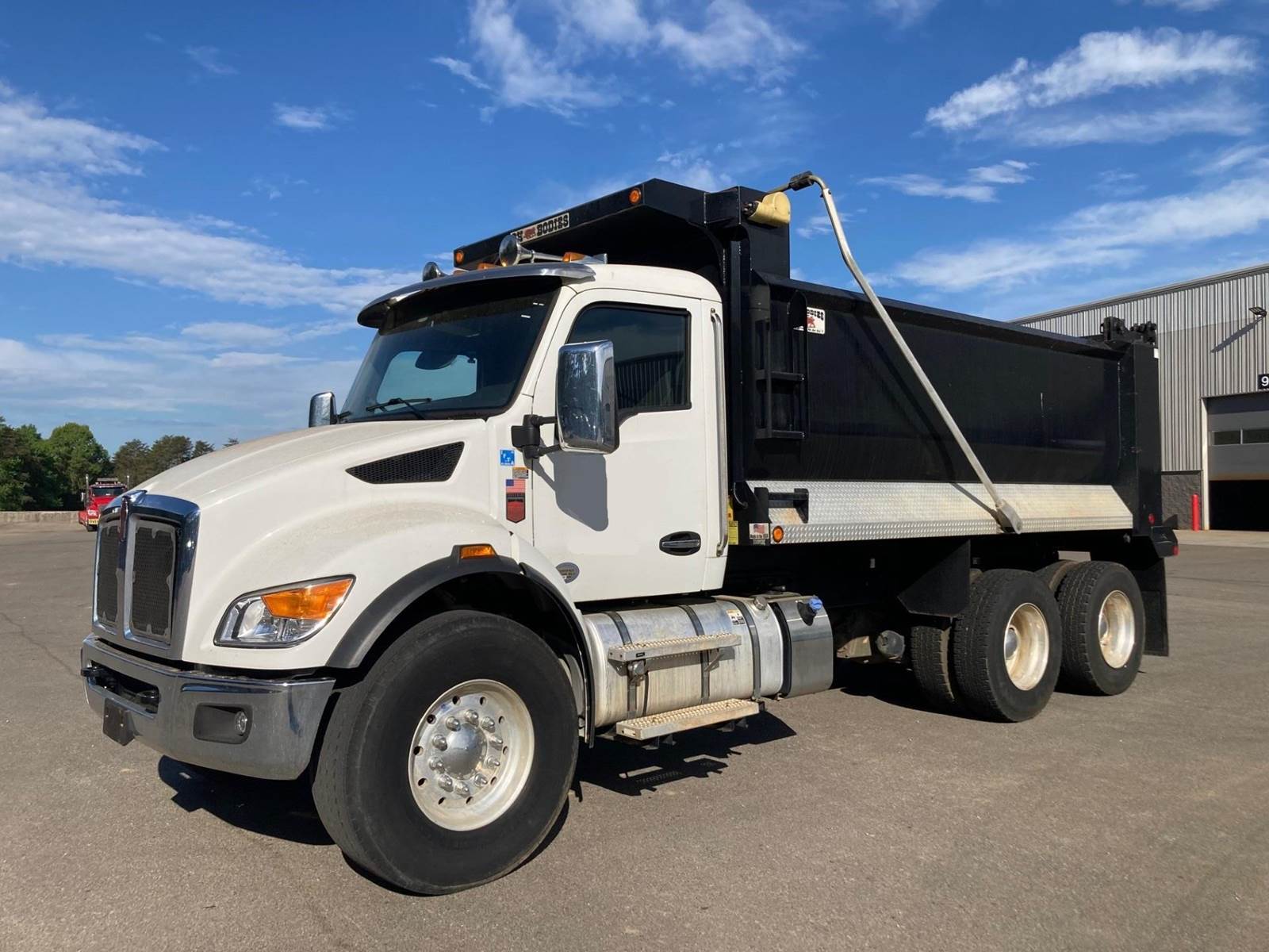 Tandem, 16' Ox Stampede Steel Dump w/58" Sides, High Lift Gate, PX9 Paccar 360 HP, Allison Automatic 6 Speed, 5.63 Ratio, Chalmers, Double Frame, 20K FA, 46K RA, 204" WB, 231" Bridge, Dual P/S Boxes, Swivel Pintle Hitch w/Air and 7 Prong Pole, Bed Vibrator, Electric Tarp, Air/High Lift Tailgate, Diff Lock, P/S, A/C, AM/FM Bluetooth, Heated Mirrors, Cruise, Tilt/Tele Wheel, Power Windows, Locks, and Mirrors, Dual High Back Seats, 80 Gallon Aluminum Fuel Tank, 425/65R22.5 Steer Tires on Aluminum Wheels, 11R22.5 Drive Tires on All Aluminum Wheels, Chrome Bumper