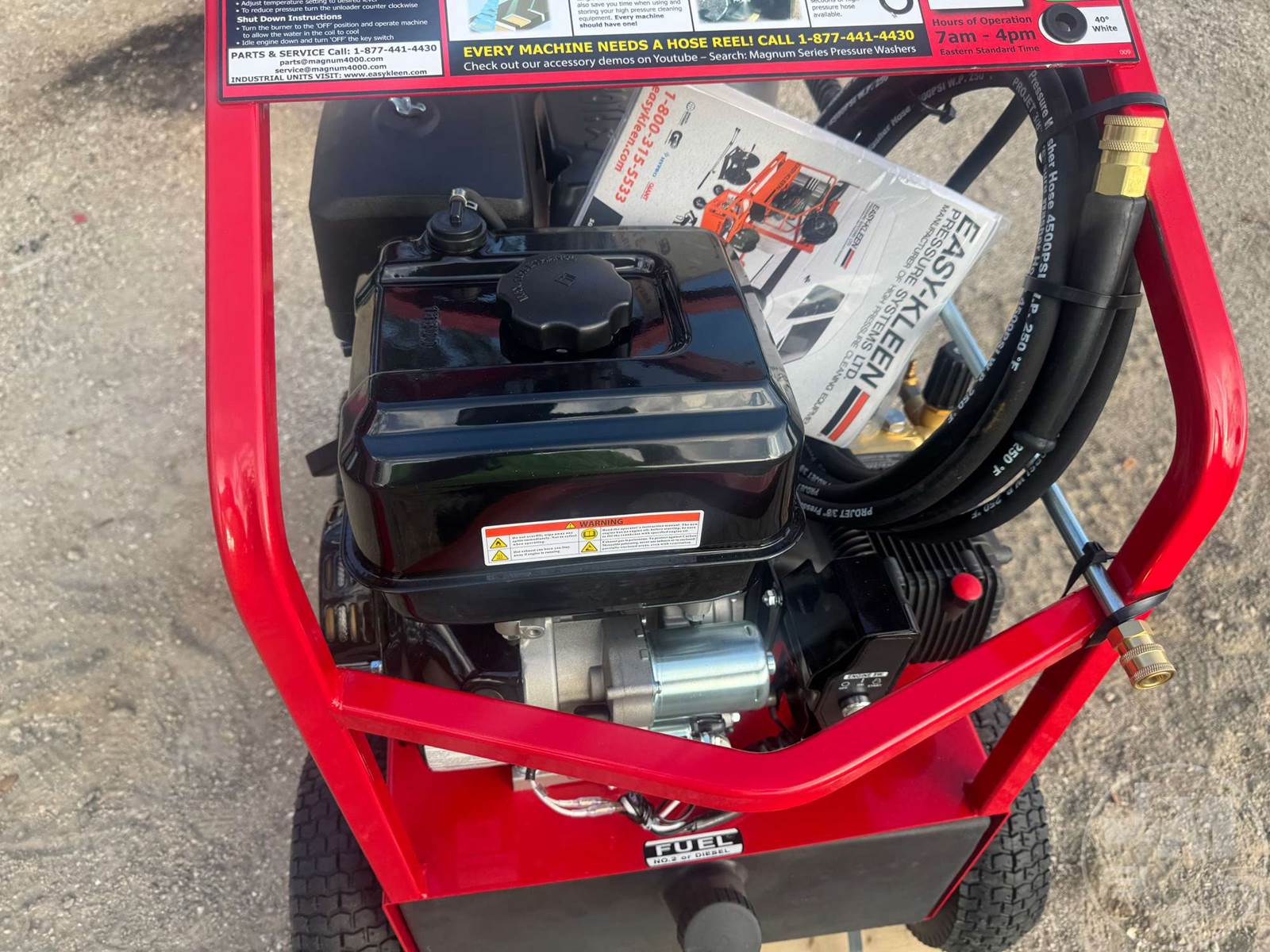 UNUSED EASY-KLEEN PRESSURE WASHER, PORTABLE, DIESEL BURNER, PSI 4000 MAX, GPM 3.5, ELECTRIC START, 15HP GAS ENGINE, HOT WATER CLEANING, 10 GAL FUEL TANK, 350000 BTU INPUT
