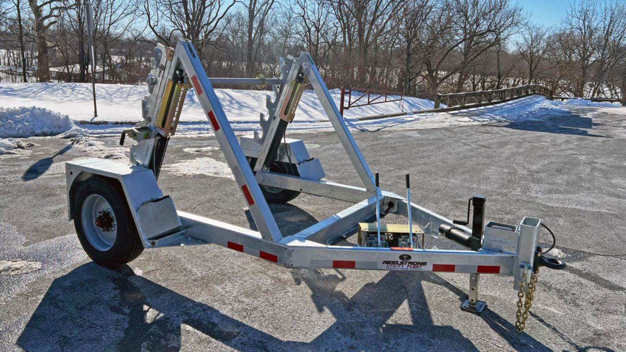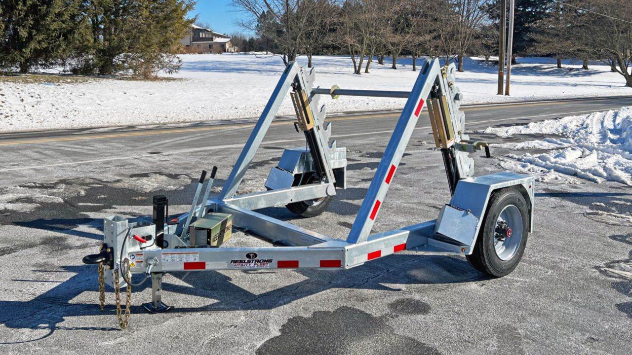 This Reelstrong GR8 self-loading single reel trailer is built for efficient, controlled handling of large cable reels without the need for additional equipment. With an 8,500 lb reel capacity and hydraulic power up and down via dual hand pumps, it allows operators to safely load, transport, and dispense material with minimal effort. The auto-locking reel bar and engagement indicators add confidence during transport, while the heavy-duty frame, oil bath hubs, and 10,000 lb axle provide long-term durability under regular use. Its compact, adjustable setup and LED lighting make it practical for a wide range of job sites, giving crews a reliable, low-maintenance solution for moving and deploying cable quickly and safely.