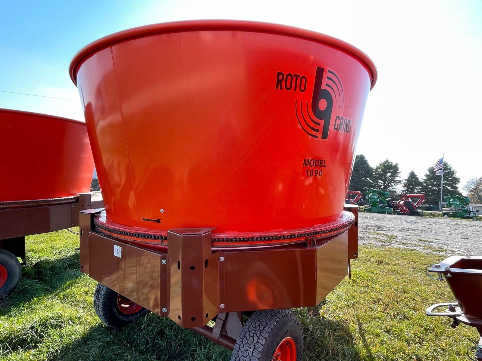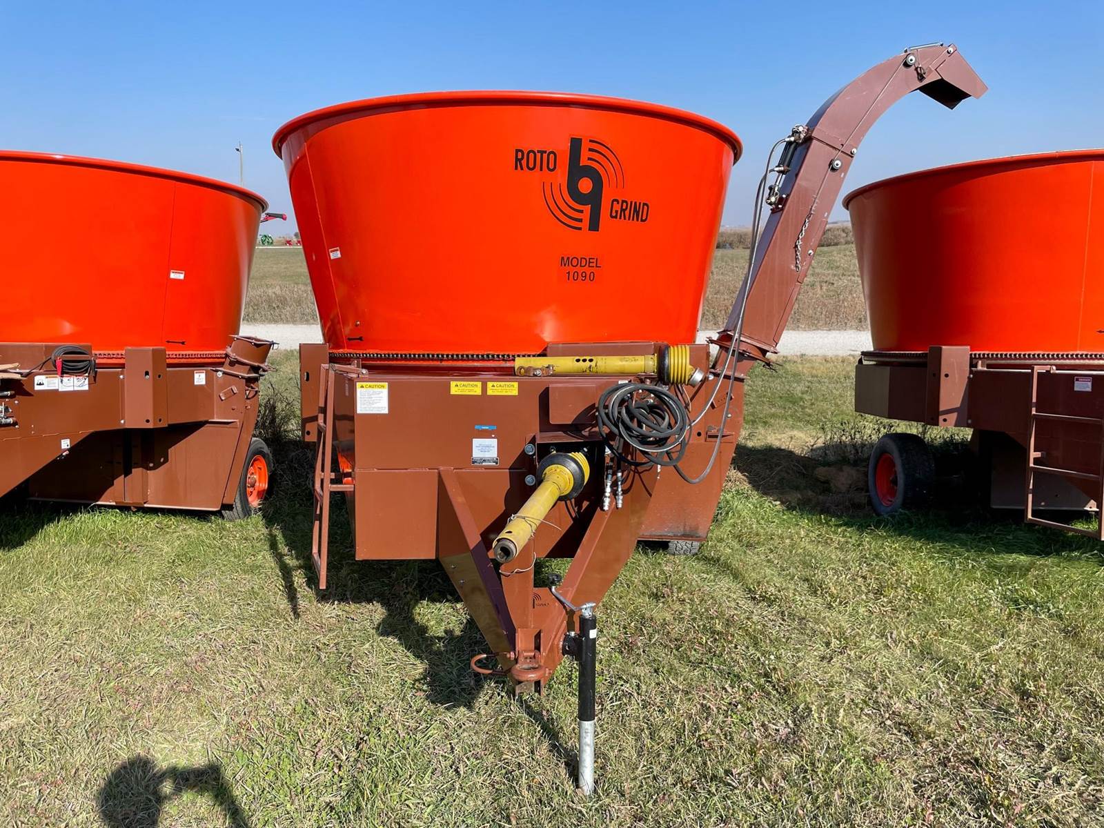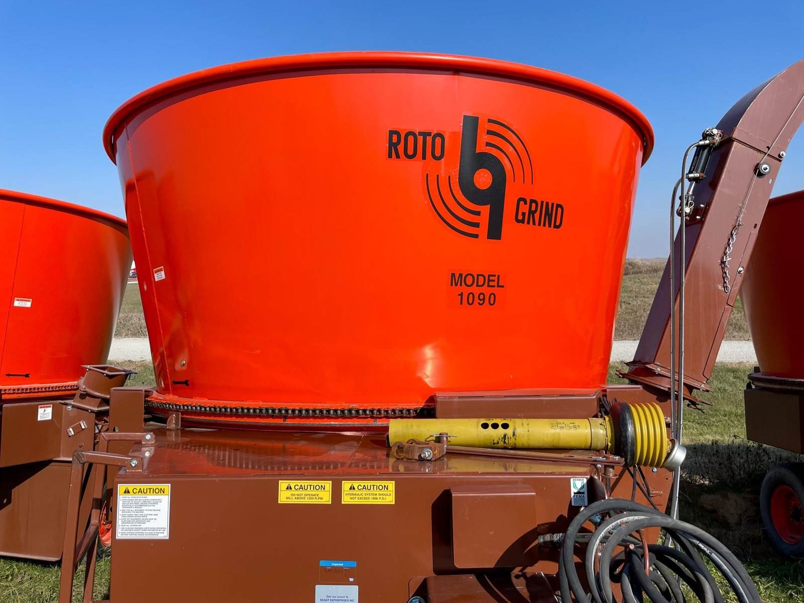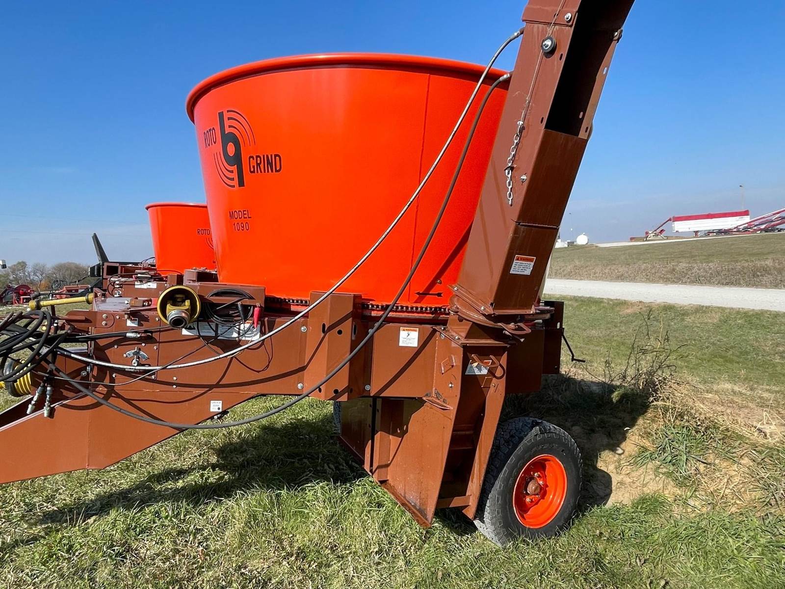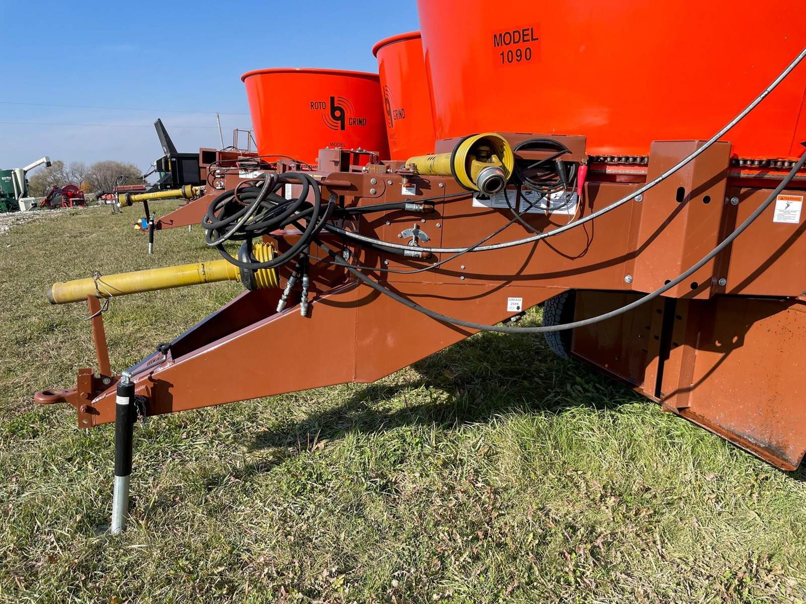 Enjoy $0 Down Financing with No Payments for 6 Months, Affordable Nationwide Delivery, and Unbeatable Prices! Used Roto Grind 1090 with an up to 15 bales per hour capacity, hay assist bar, heavy-duty tires, electronic governor, 5 adjustable shear plates to control the fineness of the grind, no screens, and a 10" mill with 26 hammers, and an adjustable 0 to 90 RPM tub speed. It is the only wet product grinder on the market and is ready for calcium hydroxide with two 2" water bungees on the hammer mill. With dry material, it should produce an average of 35 tons per hour. 180 hp recommended. Optional hydraulic tilts for the spout and grain hoods to crack or grind grain are also available.