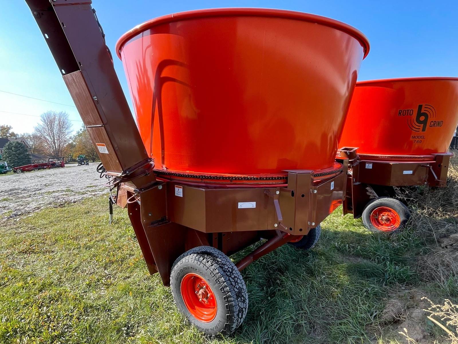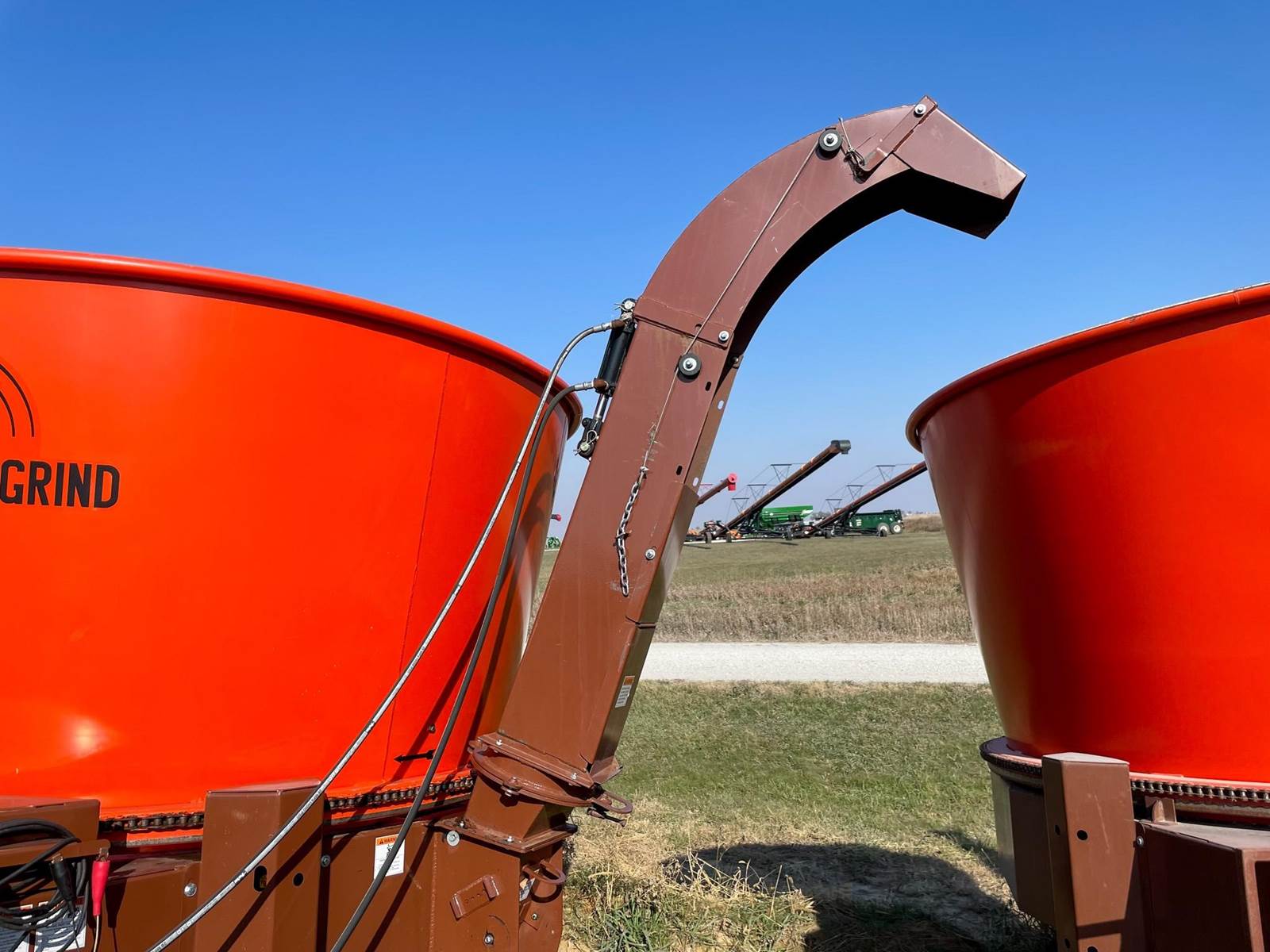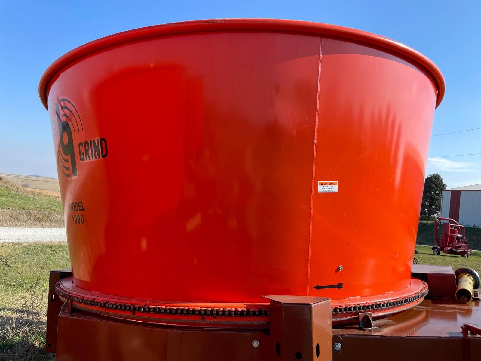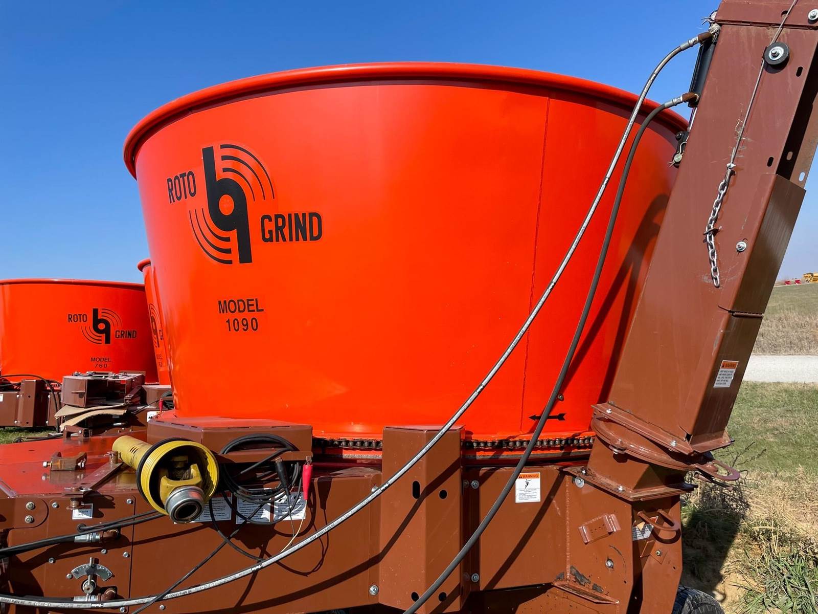 Enjoy $0 Down Financing with No Payments for 6 Months, Affordable Nationwide Delivery, and Unbeatable Prices! Used Roto Grind 1090 with an up to 15 bales per hour capacity, hay assist bar, heavy-duty tires, electronic governor, 5 adjustable shear plates to control the fineness of the grind, no screens, and a 10" mill with 26 hammers, and an adjustable 0 to 90 RPM tub speed. It is the only wet product grinder on the market and is ready for calcium hydroxide with two 2" water bungees on the hammer mill. With dry material, it should produce an average of 35 tons per hour. 180 hp recommended. Optional hydraulic tilts for the spout and grain hoods to crack or grind grain are also available.