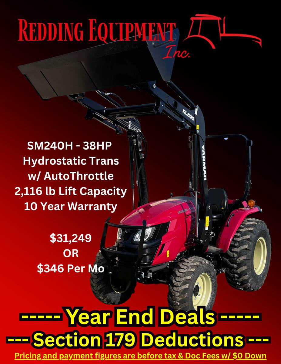 2025 Yanmar SM240H Tractor and Loader -- 10 Year Warranty - 36.9hp 4 Cylinder diesel - HST Trans with Auto Throttle - 4 Wheel drive - Flat deck design - Mid mount loader control valve - 2,116lbs Loader lift capacity - Skid steer coupler - R4 Industrial tires - CAT 1 three point hitch - Extendable lower links for ease of hook ups - 10 Year Warranty