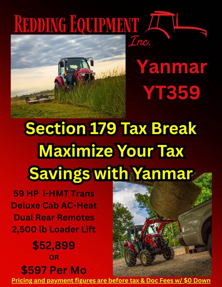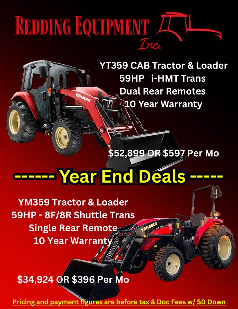 2025 YANMAR YT359 Cab Tractor with Loader -- Tractor comes with 10 Year Warranty 59hp 4-cylinder diesel 4 Wheel Drive DPF Filter but NO DEF 2 Rear hydraulic remotes CAT 1 three point hitch Ergonomic operator station Factory cab with heat and air conditioning Controls on joystick Large LCD display integrates with controls Anti-stall Electronic cruise control Rear remote Loader control valve & joystick 12V outlet Advanced electronic controls Auto-throttle A/B Mode Throttle boost button i-HMT Transmission with clutchless direction changes and stop the tractor while in gear without using the clutch. (works just like an auto transmission in a vehicle) ————————— The Yanmar YT359C tractor will keep you working whatever the weather. An innovative curved-glass windshield greatly improves visibility. Air filtration keeps the dust out. And, like all of our YT3 Series tractors, this model includes the integrated hydraulic mechanical transmission (iHMT) technology Yanmar engineered for more versatile performance. High power transfer ratio Repeatable operating speed Low fuel consumption due to increased transmission efficiency Step-less main shift Best speed possible for implement Clutch-less shifting Vehicle stop without clutch Our YT3 Series tractors are designed to make work easier for people of all skill levels. The YT347C includes an autothrottle that enables you to control engine and travel speed with the accelerator/drive pedal. This makes operating the tractor like driving a car or truck with an automatic transmission car. A/B Mode lets you preset your maximum travel speed. An anti-stall feature keeps your engine running when you dig or lift a heavy load. There’s also cruise control to keep you moving efficiently when mowing or traveling for long stretches. YANMAR designs and builds the major components, engine, front axle, transmission, and final drive, to work together. No other compact tractor can boast the integrated hydraulic mechanical transmission (i-HMT) technology of the YANMAR YT347C. The i-HMT creates the standard of operation for more versatile performance. No longer do you have to choose between an efficient, constant speed and flexible operation. With the YT347C and its innovative technology, you get both. --------------------------- Warranty - No one can compare. 10 YEAR WARRANTY - All Yanmar tractors come with 10-year limited powertrain warranty or 3,000 hours (whichever comes first) on all new Yanmar tractors. Yanmar designs and manufactures all major powertrain components – engine, front axle, transmission, and final drive – and are built to Yanmar’s highest quality standards and specifications. Anyone can say they provide a high-quality tractor, but it’s a statement that Yanmar is standing behind the tractors they build to give customers peace of mind and the confidence that Yanmar tractors will get the job done. This is why Yanmar is able to confidently offer unmatched, industry-leading warranty in the market today. Yanmar has a long history of designing and building premium tractors that are known for their durability. Yanmar tractors are as solid as ever, which is why Yanmar is able to confidently step forward and provide the industry-leading warranty in the market. In addition to the industry-leading warranty, Yanmar’s customers can experience unparalleled customer support every day through an extensive and passionate dealer network. --------------------------- We Deliver ANYWHERE!!!!!! Call or email for more information. Redding Equipment 8537 Commercial Way Redding CA 96002 www.ReddingEQ.com