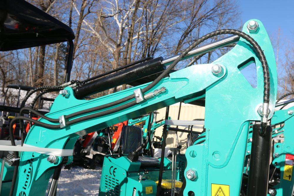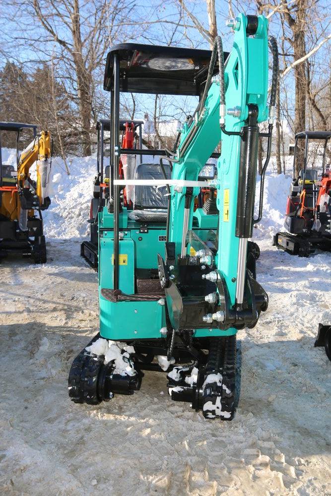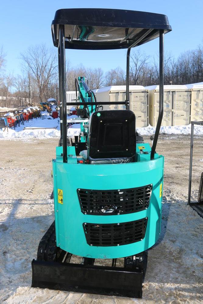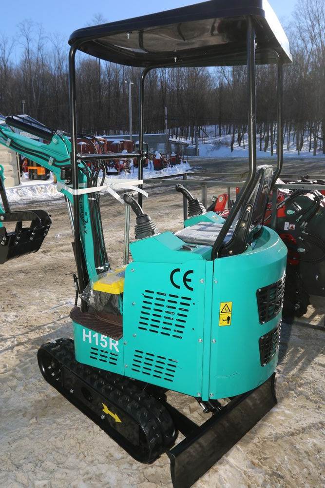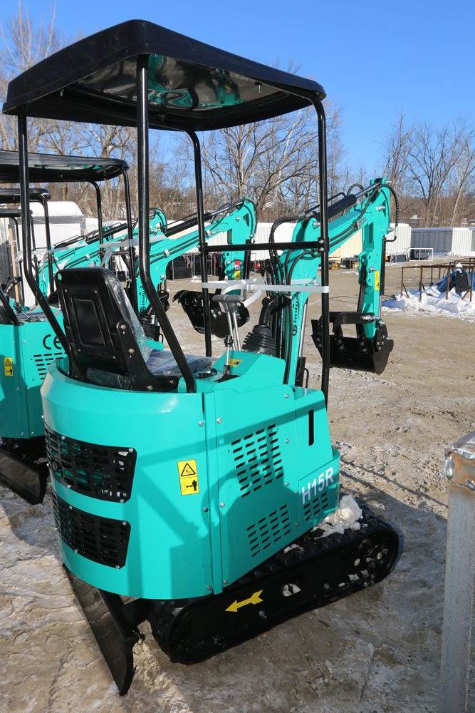 New 2026 CFG Industrial gas powered mini Excavator model H15R with 420cc gasoline engine, bucket, 4' long tracks, 38.5" wide base, 6" wide tracks, canopy, hydraulic boom & bucket controls, pilot system, thumb, dozer blade. Hours reading less than 1 hour.